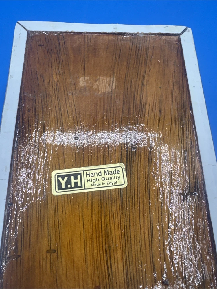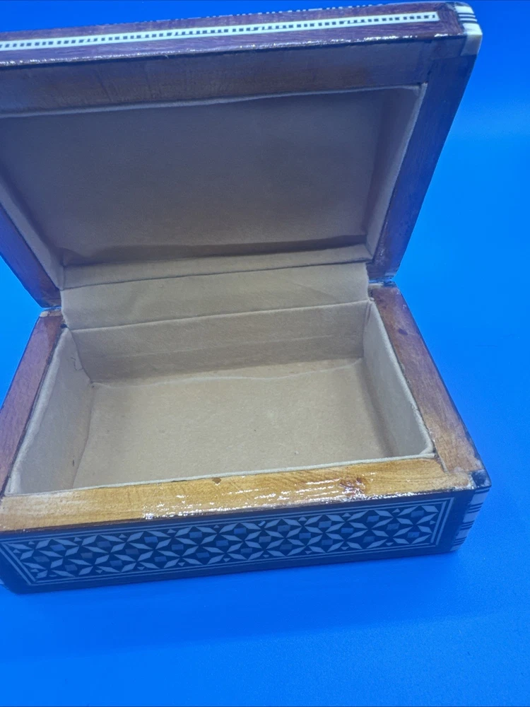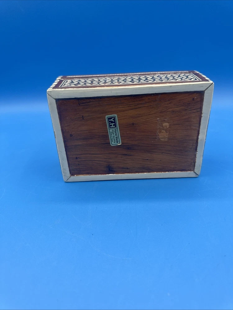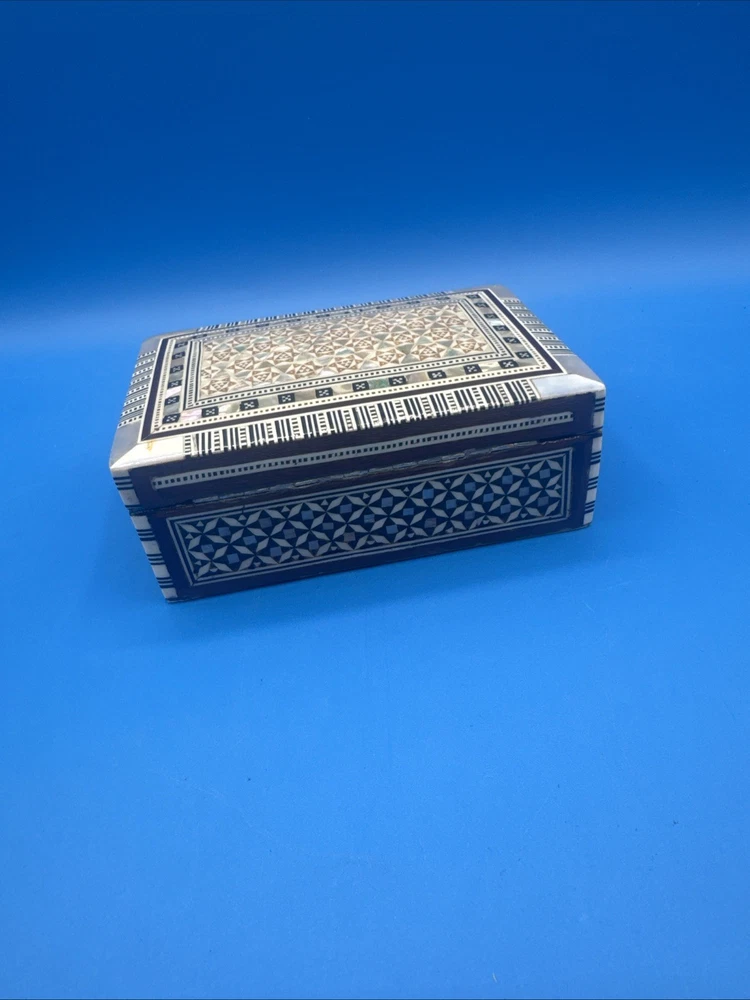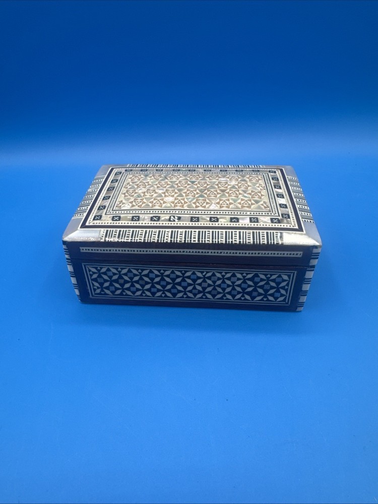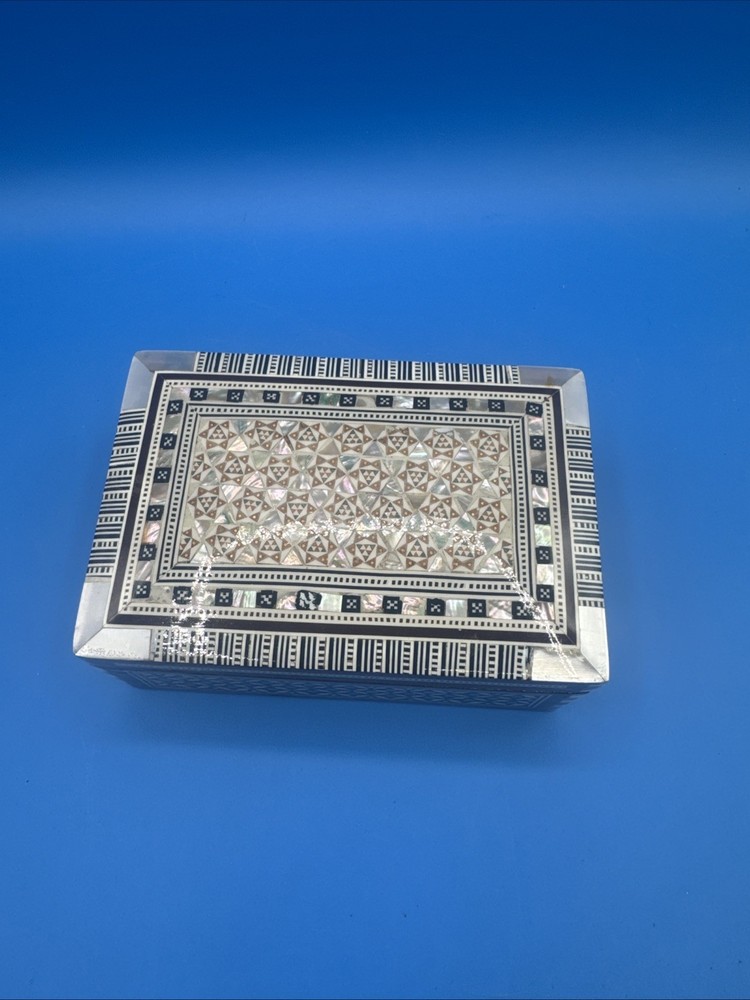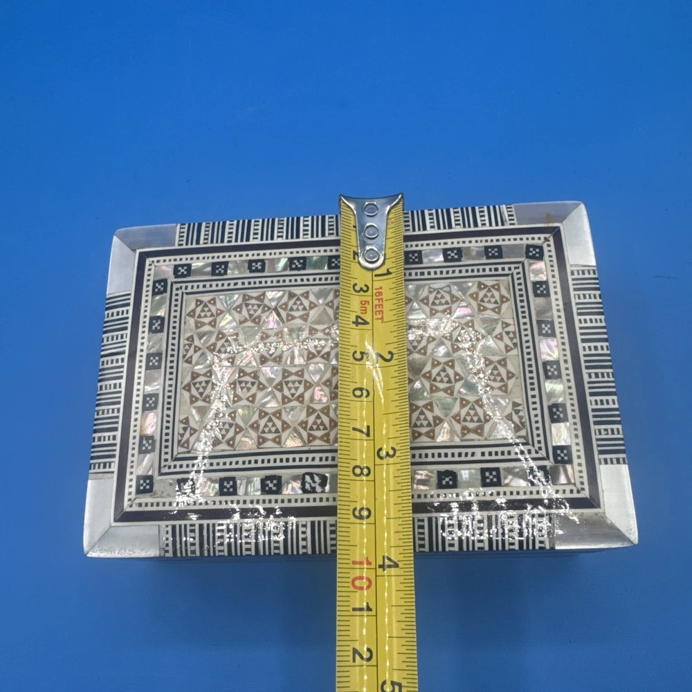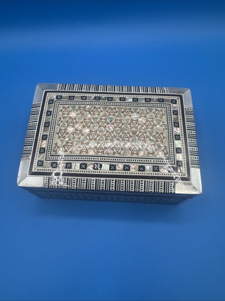 This Middle Eastern Mother of Pearl Marquetry Inlaid Jewelry Box is a beautiful and luxurious collectible item. The intricate mother of pearl marquetry design on the exterior combined with the velvet interior creates a visually stunning piece that would make a perfect addition to any home decor. The brand, Pearl, ensures quality and authenticity, while the boxed packaging adds a touch of elegance to the overall design. Whether used for storing jewelry or as a decorative piece, this jewelry box is sure to add a touch of sophistication to any space. Pre-owned excellent condition. No damages. No original box. Please check the pictures carefully as part of the description. Feel free to ask questions if you need more information before you buy it. Thank you for your interest I-5