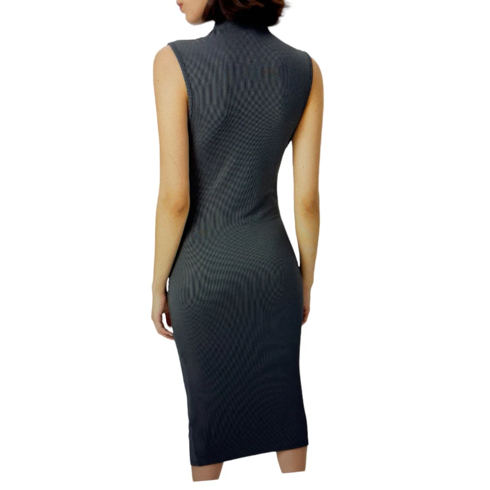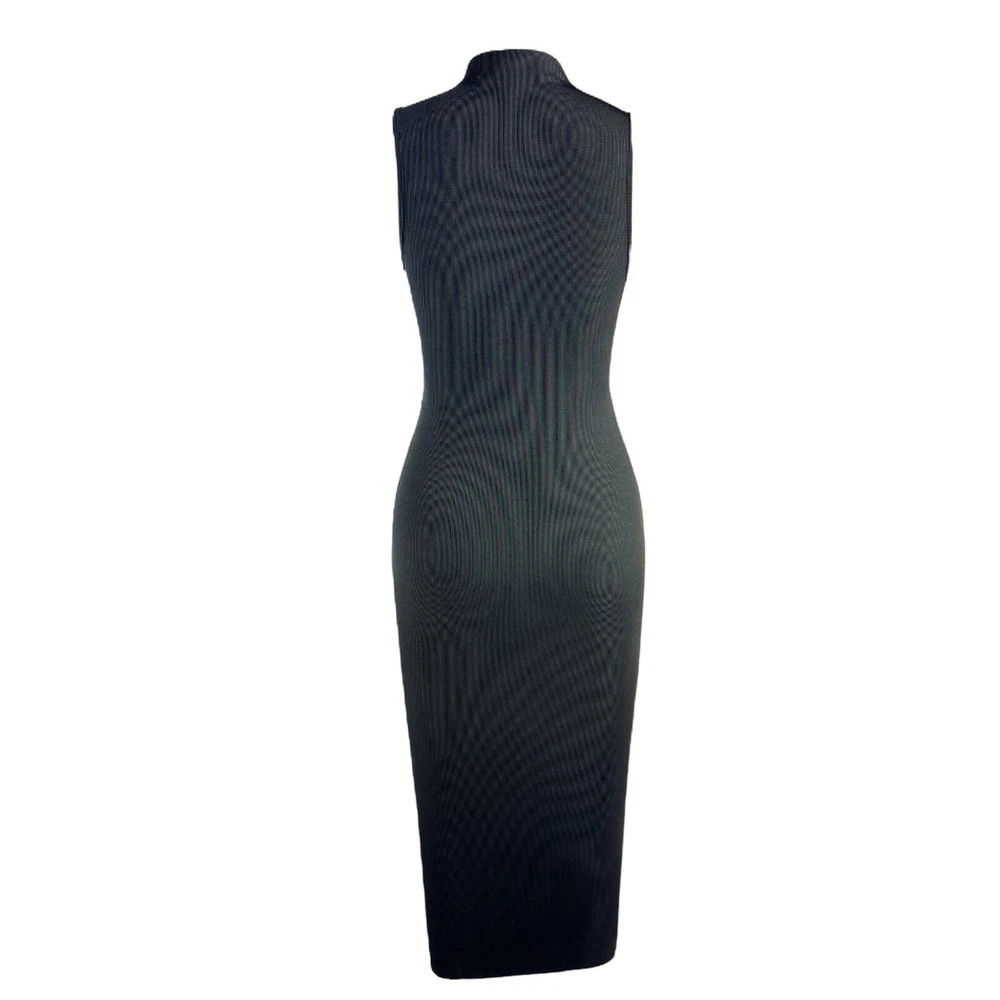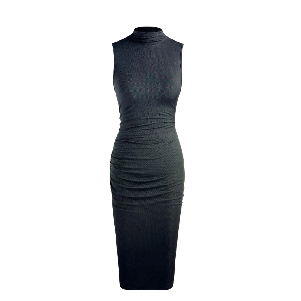 Elevate your wardrobe with this stunning gray midi dress from Cider. The high neck and side ruched accents add a touch of elegance to the bodycon fit, making it perfect for any occasion from weddings to cocktail parties. The dress is made from a stretchy 96% polyester and 4% elastane fabric, ensuring comfort and a flattering fit. This dress is perfect for the fashion-forward woman who wants to make a statement without sacrificing comfort. It's machine washable and easy to care for, making it a great addition to any wardrobe. Don't miss out on this stylish and versatile piece! Length 48.9 inches PTP 17 lying flat across approximately #RibbedKnitDress #MidiDress #HighNeck #Bodycon #GrayDress #All seasons #StretchDress #SleevelessDress