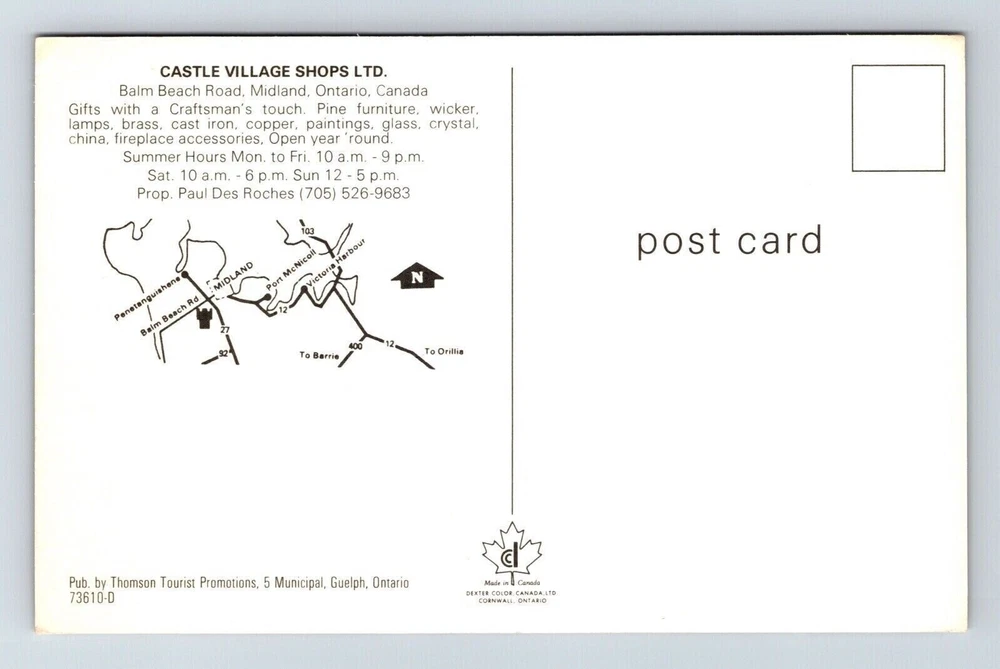 Midland Ontario Canada Castle Village Scenic Landmark Streetview Chrome Postcard You will receive the exact postcard in the picture. We use a high quality scanner to capture pictures of the front and back for every postcard we have listed. Postcards will be in the condition as shown in the pictures. We ship Mon-Fri. We also offer combined shipping discounts or free shipping. If we have shipping on your listing you can buy as many additional postcards as you want and they will ship for free after the fist postage is paid. If you select first class shipping and pay the extra your postcard will be shipping as a package with extra protection. If you choose free shipping or $1.50 shipping your postcard will be shipped in a standard envelope with soft plastic sleeve and do not bend written on the envelope. Orders of 15 or more cards or with single cards over $20 in them will automatically be upgraded to first class and at least a photo mailer. If you have any questions feel free to ask. We are willing to consider reasonable offers and we offer discounts on orders of more than one card. Thank You _gsrx_vers_1436 (GS 9.0.5 (1436)) _gsrx_vers_1608 (GS 9.5 (1608)) _gsrx_vers_1653 (GS 9.7.5 (1653))