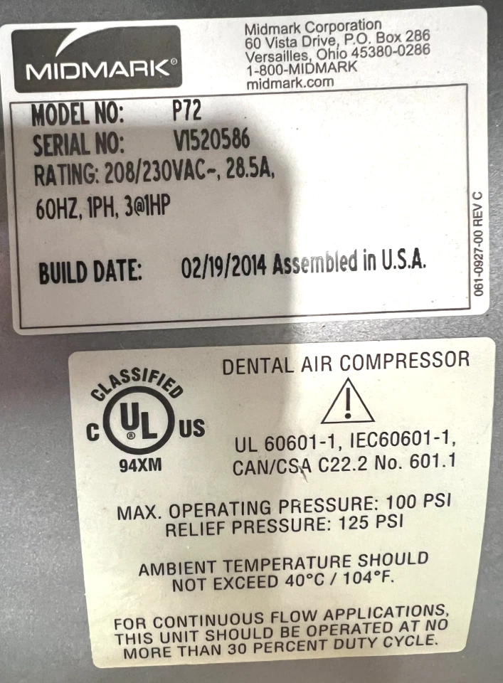 Available for purchase is a Midmark Power Air P72 Triple Head Dental Air Compressor This is a used item. This compressor will need a few parts replaced on install, otherwise this is a pretty clean compressor. Please refer to the photos for all the part numbers that are included. I will be happy to answer any questions you may have prior to purchase. The item in the photos will be the one you receive. What’s Included: 1 – Midmark Power Air P72 Triple Head Dental Air Compressor