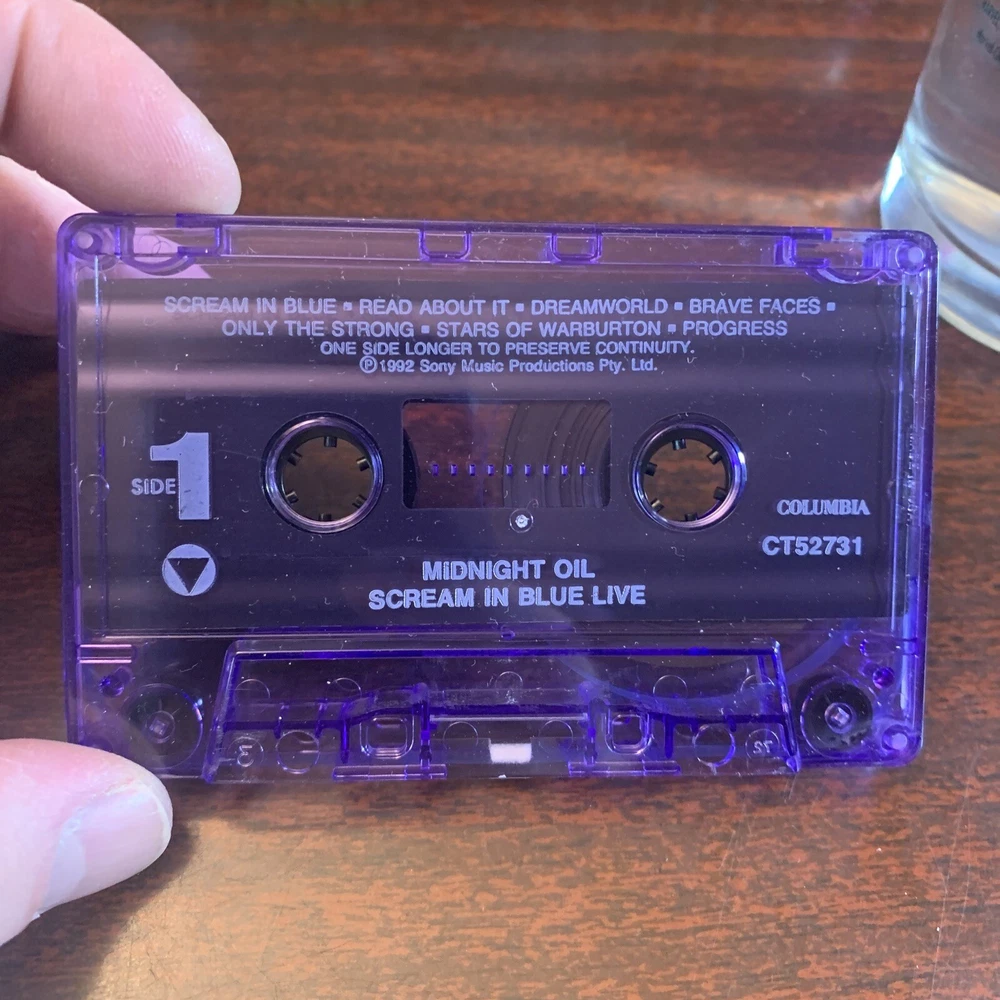 Midnight Oil - Scream in Blue Live (cassette tape, 1992) Sony Music, Australian, CT52731 Columbia Records. The purple cassette is really cool.