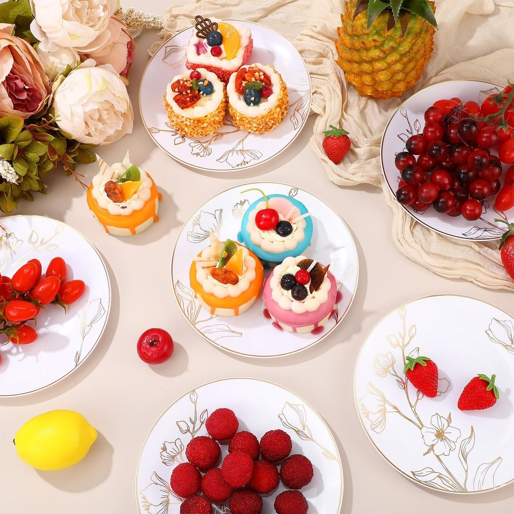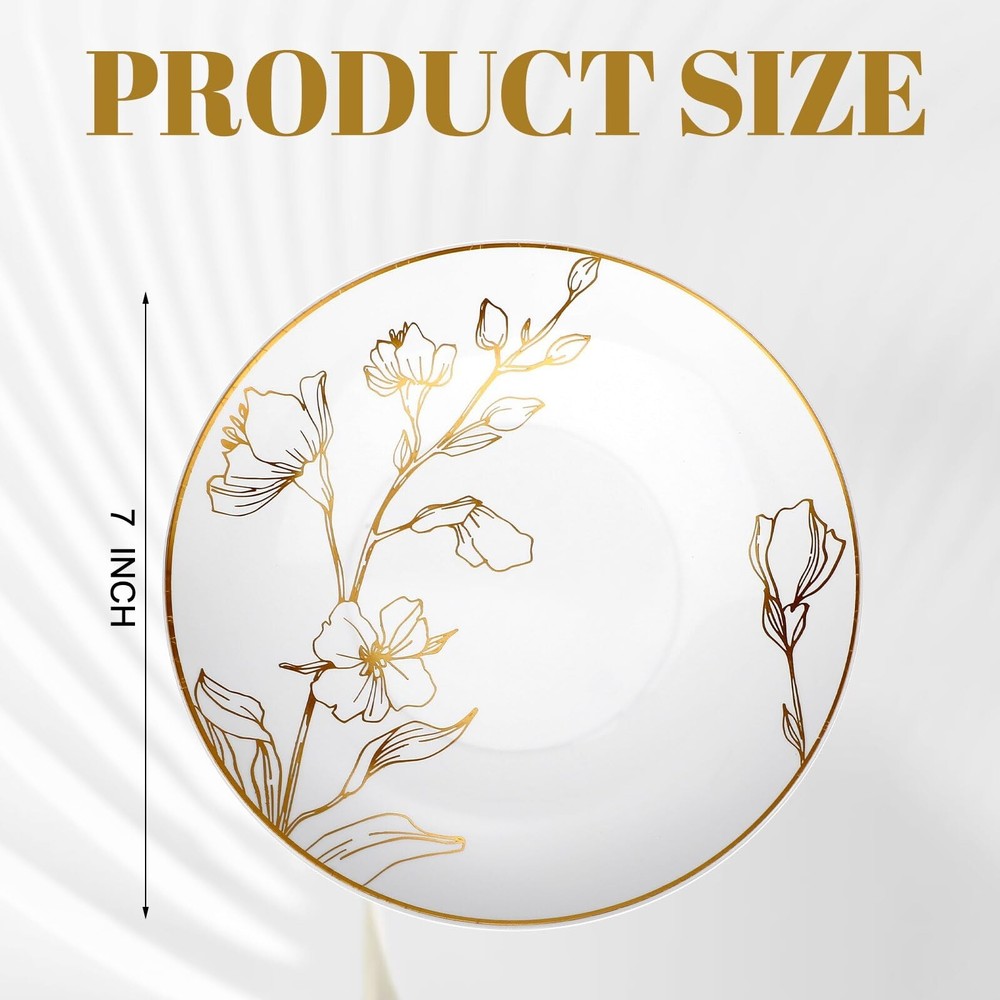 Mifoci 150 Pcs White and Gold Plastic Plates with Floral Design, 7 Inch Party Plates with Gold Rim, Elegant Heavyweight Disposable Plates for Wedding Party Birthday Bridal Shower Product Details Material: Plastic Brand: Mifoci Color: White Special Feature: Disposable, Lightweight Occasion: Wedding, Birthday, Thanksgiving Material: Plastic Brand: Mifoci Color: White Special Feature: Disposable, Lightweight Occasion: Wedding, Birthday, Thanksgiving Style: Contemporary Shape: Round Seasons: All Seasons Recommended Uses For Product: Meals, Birthday, Wedding, Family Gatherings Number of Pieces: 150 Pattern: Floral Product Care Instructions: Hand Wash Only Size: Small Finish Type: Glossy Is Microwaveable: No Is Dishwasher Safe: No Included Components: [150 White and Gold Plastic Plates] Theme: Elegant Floral Embellishment: Floral Product Name: Plate Reusability: Disposable Manufacturer: Mifoci Unit Count: 1.0 Count Package Dimensions: 10.12 x 7.76 x 7.76 inches Item Weight: 8.12 pounds Date First Available: June 21, 2023 Quality Material: these gold plastic plates are made of thick plastic, sturdy and durable, safe and reliable, suitable for hot and cold food, can hold up well; Note: it is not recommended to use in the microwave or dishwasher Elegant Gold Dinner Plate: gold rimmed white plates with magnificent floral design, which looks like real china and has a stylish appearance, beautiful and intricate, add a touch of elegance and sophistication to your gathering or dinner event Sufficient Quantity: you will get 150 pieces of white and gold floral plastic plates (7 inch in diameter), the abundant quantity can meet your various using needs on multiple occasions, suitable for daily or party use Usage Scenario: these party disposable plates can be applied for parties and events, weddings, dinners with friends, rehearsal dinner, family gatherings, thanksgiving dinner, bridal showers and more; Really a practical complement to the party table settings Save Your Time: the floral gold and white plastic plates are convenient and disposable for quick and easy cleanup to liberate your hands; You can throw them in the trash after use without worrying about the cleanup at the end Features: Quality and safe Material: These gold rimmed plastic plates are made of quality plastic material, which are safe, stable and sturdy, and this sort of about 7 inches plastic plate is also suitable for daily use at home or for party supplies. Various occasions: Our fancy gold plastic plates are suitable for weddings, receptions, anniversaries, birthday parties, picnics, bridal showers, holidays, family gatherings, and all other fancy dinner, our fancy disposable dinnerware will upgrade your table. Specifications: Material: plastic Color: white and gold Size: about 7 inch in diameter Package includes: 150 x White and gold plastic plates Notes: Manual measurement, please allow slight errors on size. The color may exist a slight difference due to different screen displays.