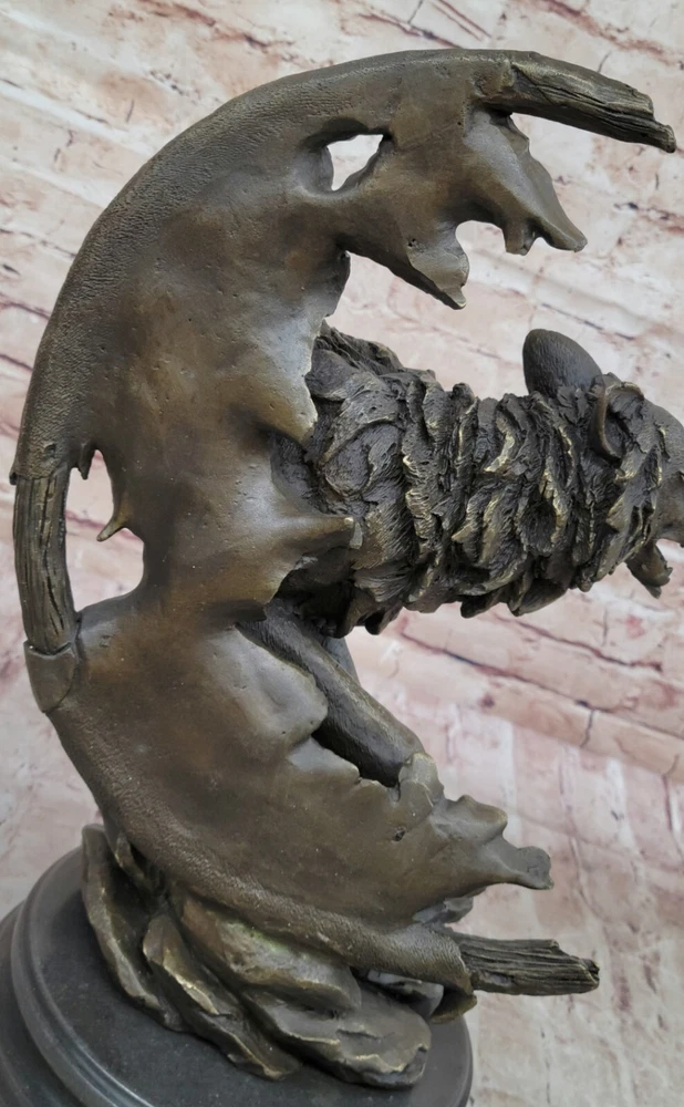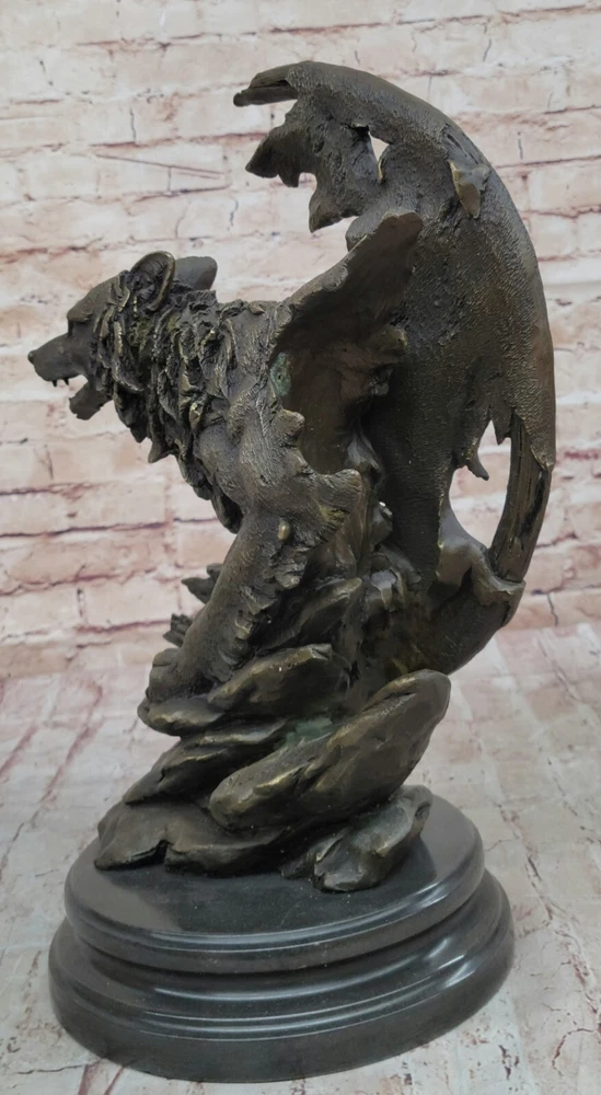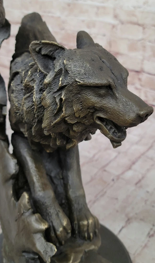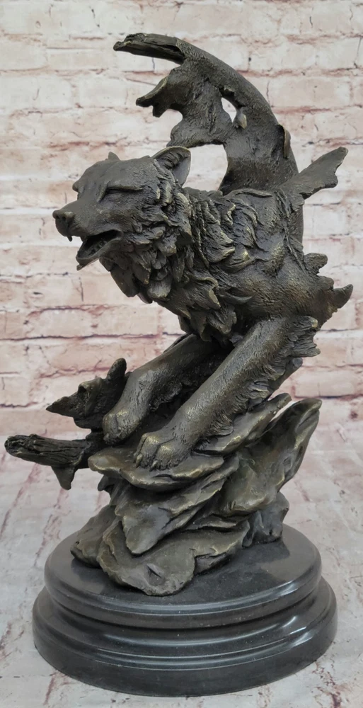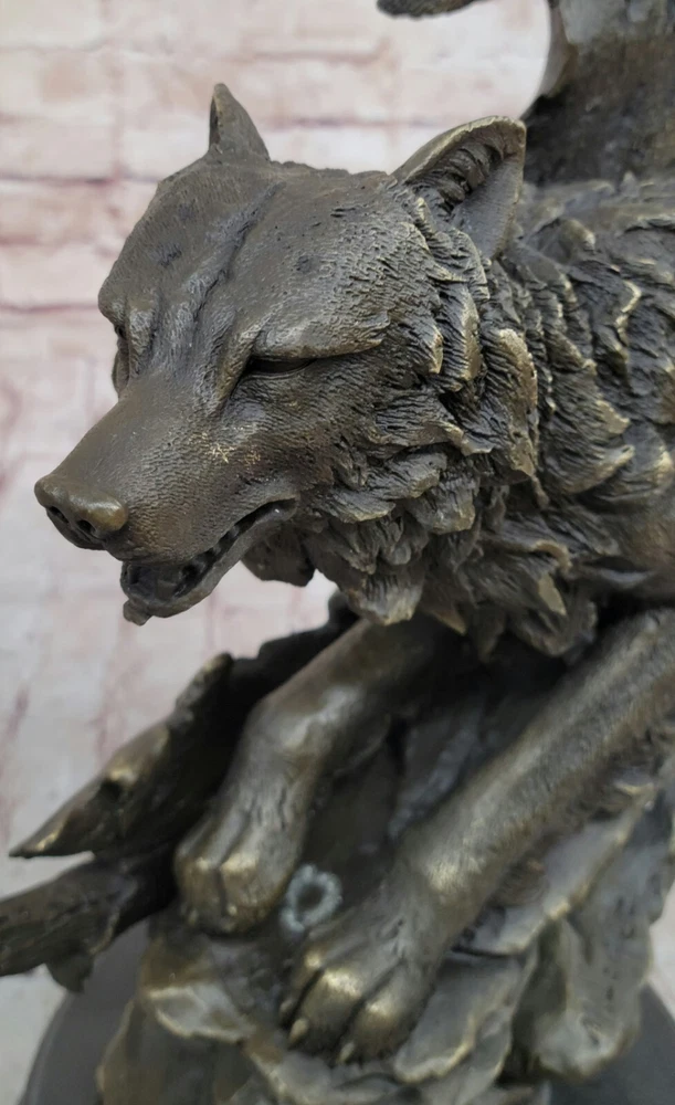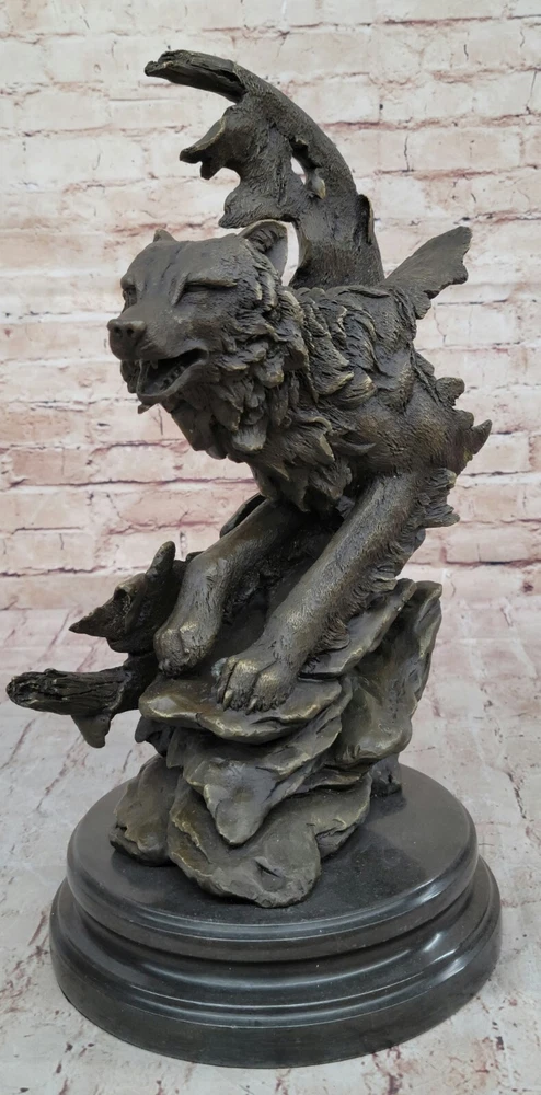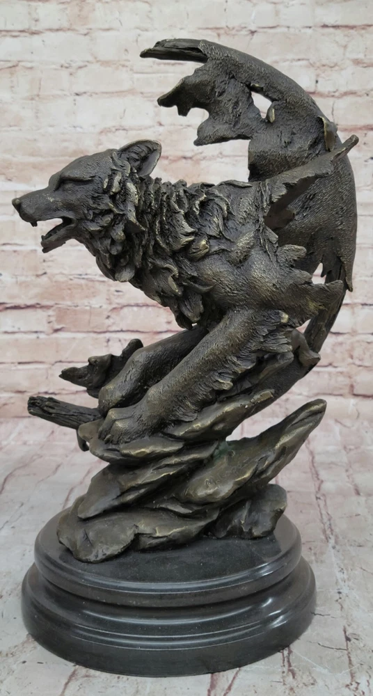 Condition: This sculpture is in a perfect condition Bronze Dimensions with Marble Base: Height 16"" X Width 10"" Marble Dimensions: Diameter 8"" Height without base:15"" Weight:25 LBS Inventory:17YDW1199779 Celtic Moon WolfCrafted with meticulous detail and artistic flair, the ""Celtic Moon Wolf"" sculpture is a testament to the imaginative brilliance of renowned fantasy artist Miguel Lopez. Fashioned from solid bronze, this exquisite piece captures the essence of a howling wolf within the embrace of a Celtic crescent moon. Beyond its aesthetic allure, the sculpture delves into the rich symbolism associated with the wolf, representing intelligence and serving as a conduit for lunar power in Celtic lore. According to ancient beliefs, the wolf's nightly pursuit of the sun allowed the moon's potency to reign, embodying a cycle of cosmic power.This handmade bronze masterpiece is a product of the revered lost-wax casting method, ensuring a level of craftsmanship that resonates with ancient artistry. Adorned with a rich brown patina finish, not only does it enhance the intricate details of the sculpture, but it also serves as a protective layer, preserving its beauty for generations to come. Mounted gracefully on a black marble base, this sculpture becomes a captivating focal point, blending symbolism, artistry, and mysticism. It proudly bears the distinctive signature of its creator, M. Lopez, further enhancing its authenticity and artistic pedigree.Beyond its tangible beauty, the ""Celtic Moon Wolf"" sculpture invites viewers into a realm of spiritual significance, where the wolf becomes a guide and spiritual teacher on life's journey. This unique blend of artistic expression and symbolic depth transforms the sculpture into more than a mere art piece - it becomes a conduit for contemplation and connection to the timeless narratives woven into Celtic mythology. Celtic Moon Wolf Hot Cast Bronze Sculpture Marble Base Figurine Statue Figurine www.bronzhaus.com Video will open in a new window Using the eBay App? Paste link into a browser window: [isdntekvideo]