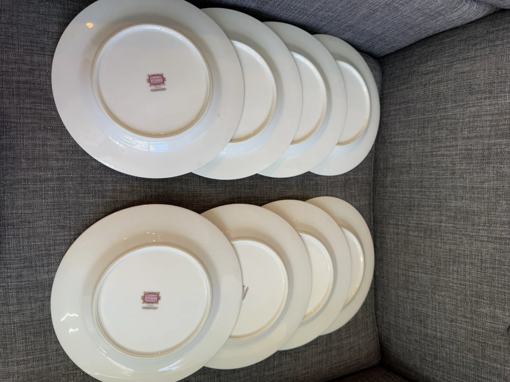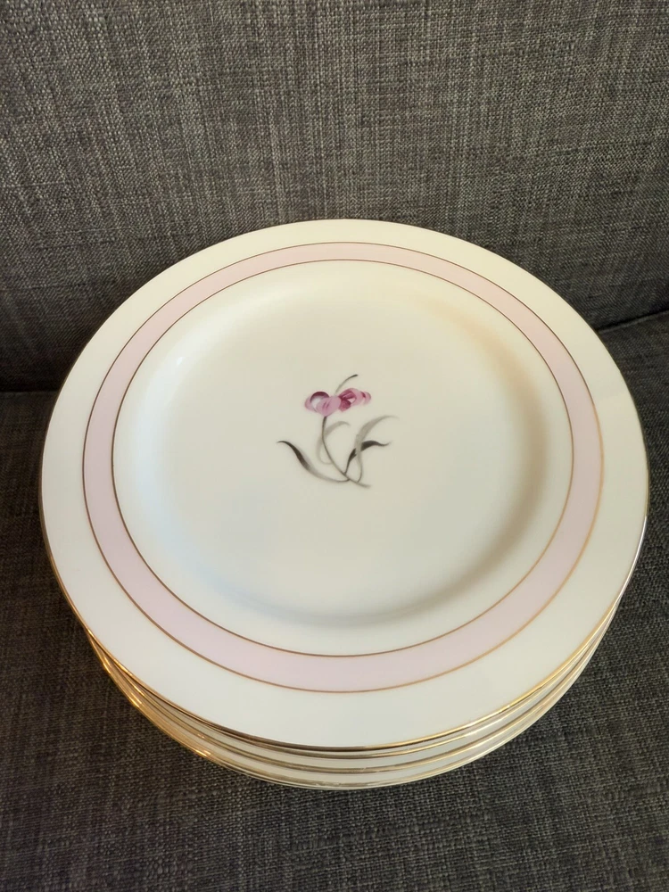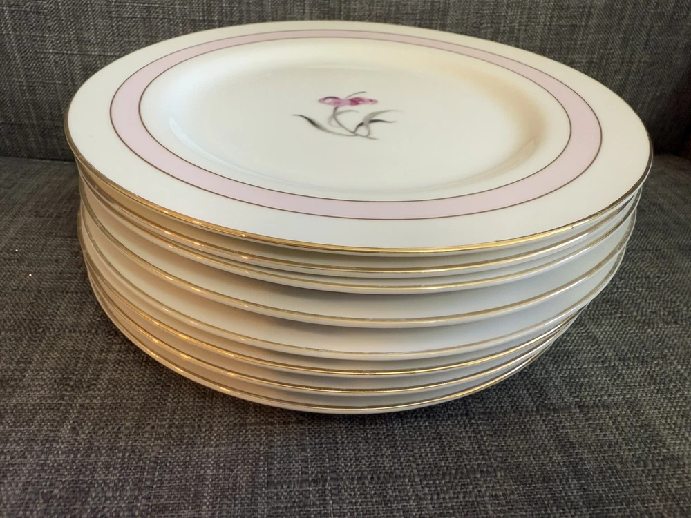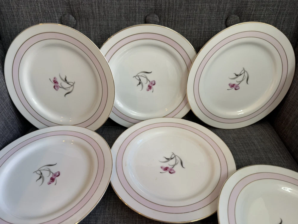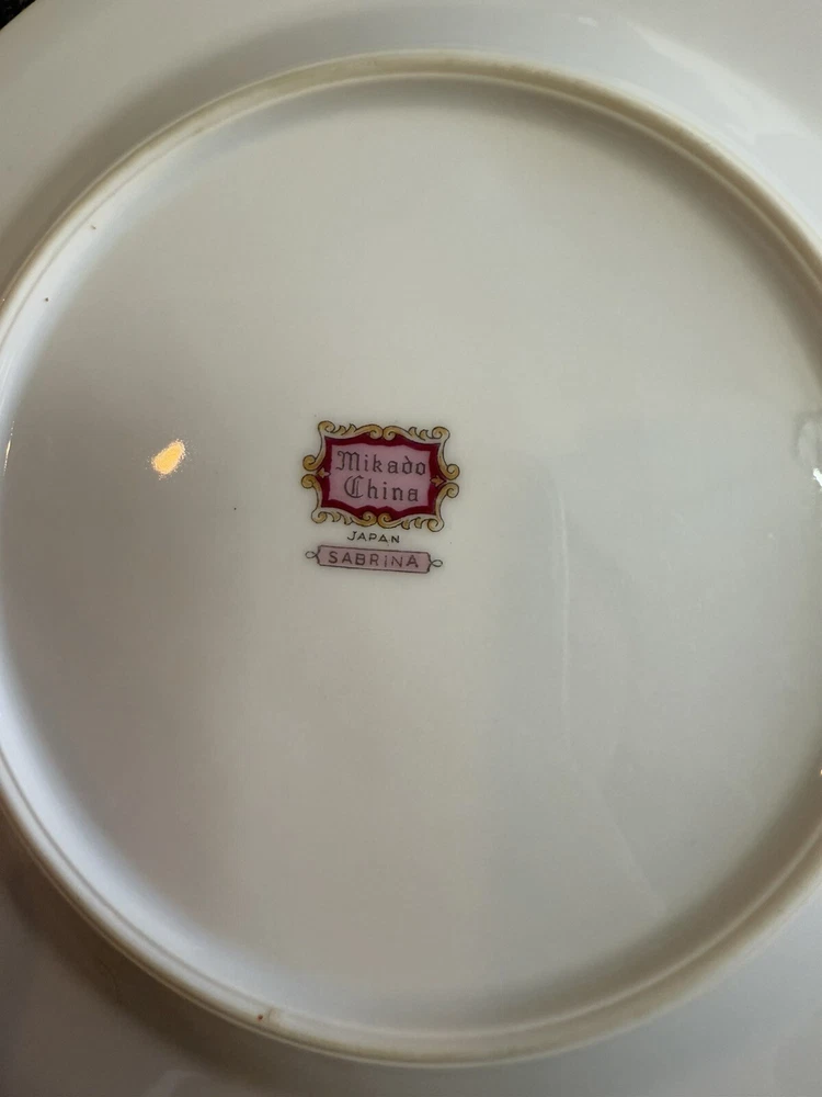 The vintage Mikado "Sabrina" plates are a set of 8 round porcelain and bone china plates, each measuring 7.5 inches in diameter. Made in Japan, these plates feature a pink color and a classic design that adds a touch of elegance to any dining table. The Mikado brand is known for its quality craftsmanship and attention to detail, making these plates a charming addition to any collection or table setting.