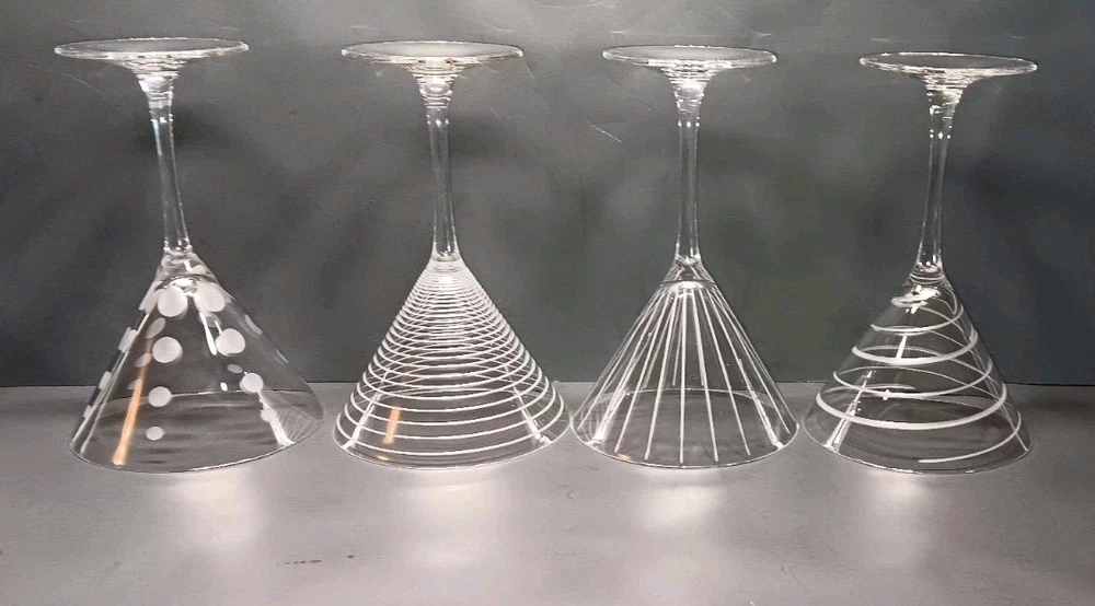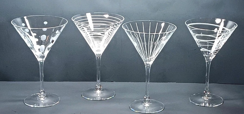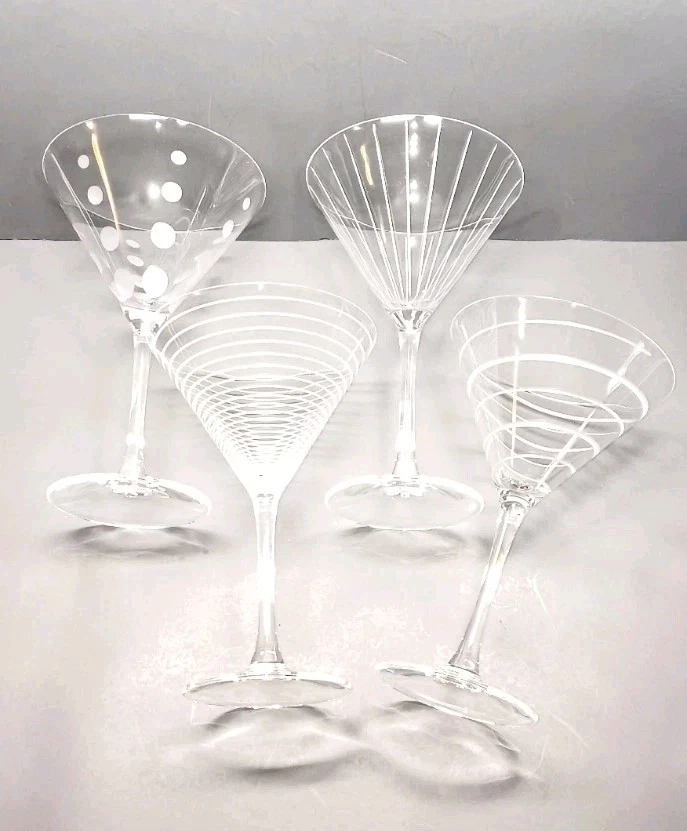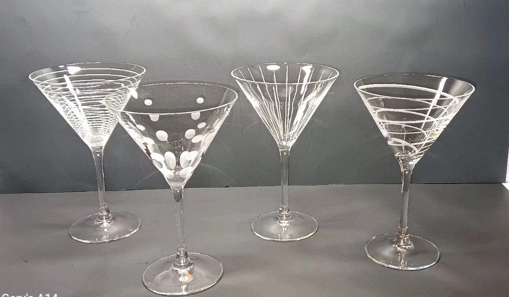 Elevate your martini experience with these exquisite Mikasa Cheers martini glasses. Handcrafted in 2003, these four-piece glasses boast a contemporary style with elegant glass production techniques. The clear, glossy finish and etched patterns make them perfect for any occasion. Each glass has a capacity of 8 ozs. and stands at 7 3/8" tall. The unisex design and hand-blown production style add to their uniqueness. The multimotif, cut lines, dots, and rings feature makes them a perfect addition to your drinkware collection. Hand wash only to maintain their exquisite design. This is a great set of used cut glasses by Mikasa. They are used and do have some minor scratches from previous use. No chips, cracks, or breaks of anykind. If you have any questions or concerns please feel free to contact me thanks.