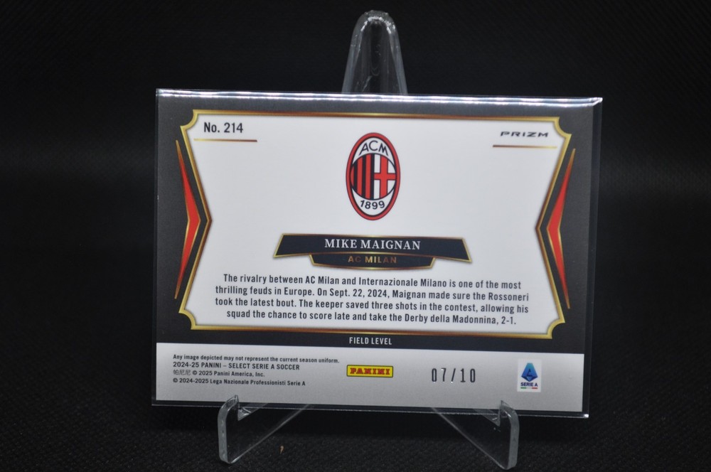 The product is a highly coveted 2024-25 Panini Select Serie A trading card featuring Mike Maignan from AC Milan. This specific card is a rare Gold Wave Prizm parallel variety, limited to just 10 copies at the Field Level. It is made of sturdy card stock with a thickness of 35 Pt. and includes the player's autograph in the form of a label or sticker, authenticated by Panini Authentic. This collectible item is a valuable addition to any soccer trading card collection, especially for fans of Italian football and top-tier players like Maignan.