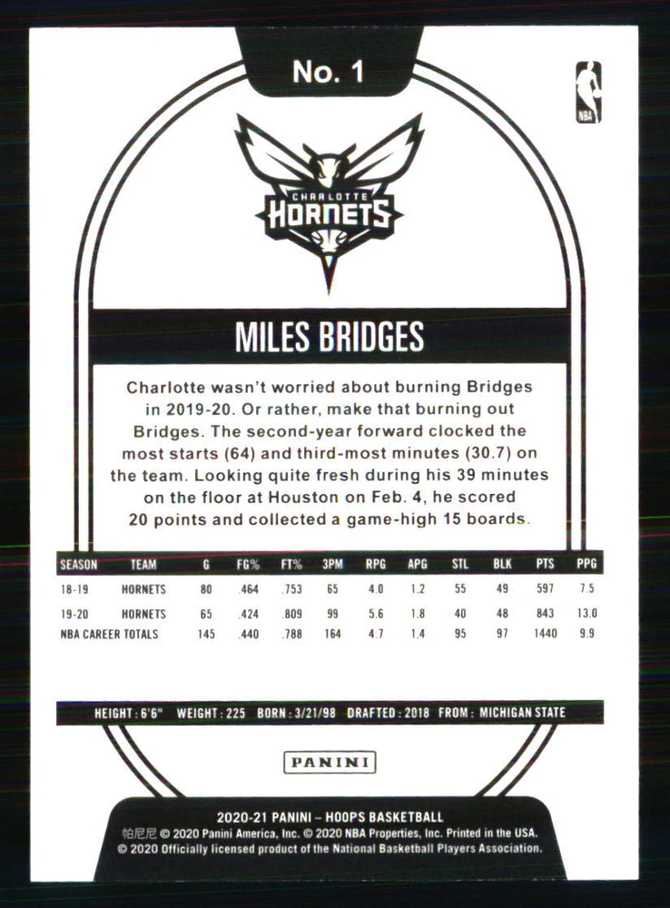 Type: Sports Trading Card Card Number: 1 Season: 2020 Autographed: No Team: Charlotte Hornets Player|Athlete: Miles Bridges Graded: No Set: 2020-21 Hoops Winter League: NBA Sport: BASKETBALL Year Manufactured: 2020