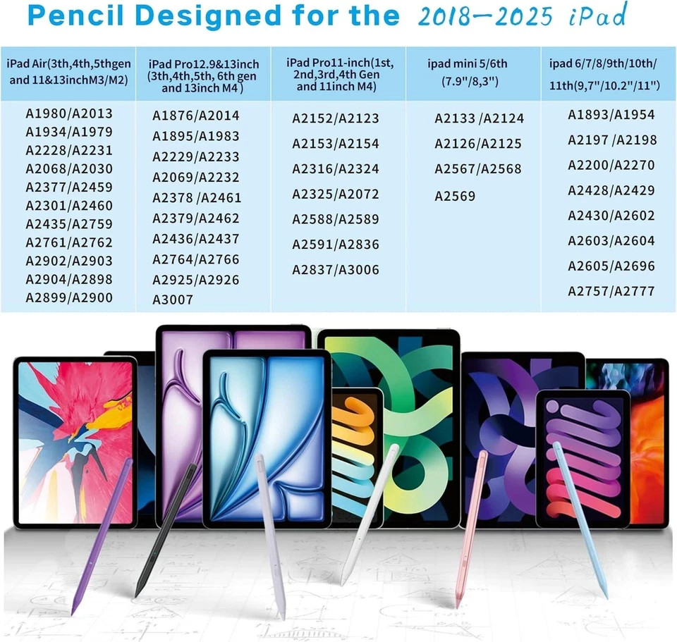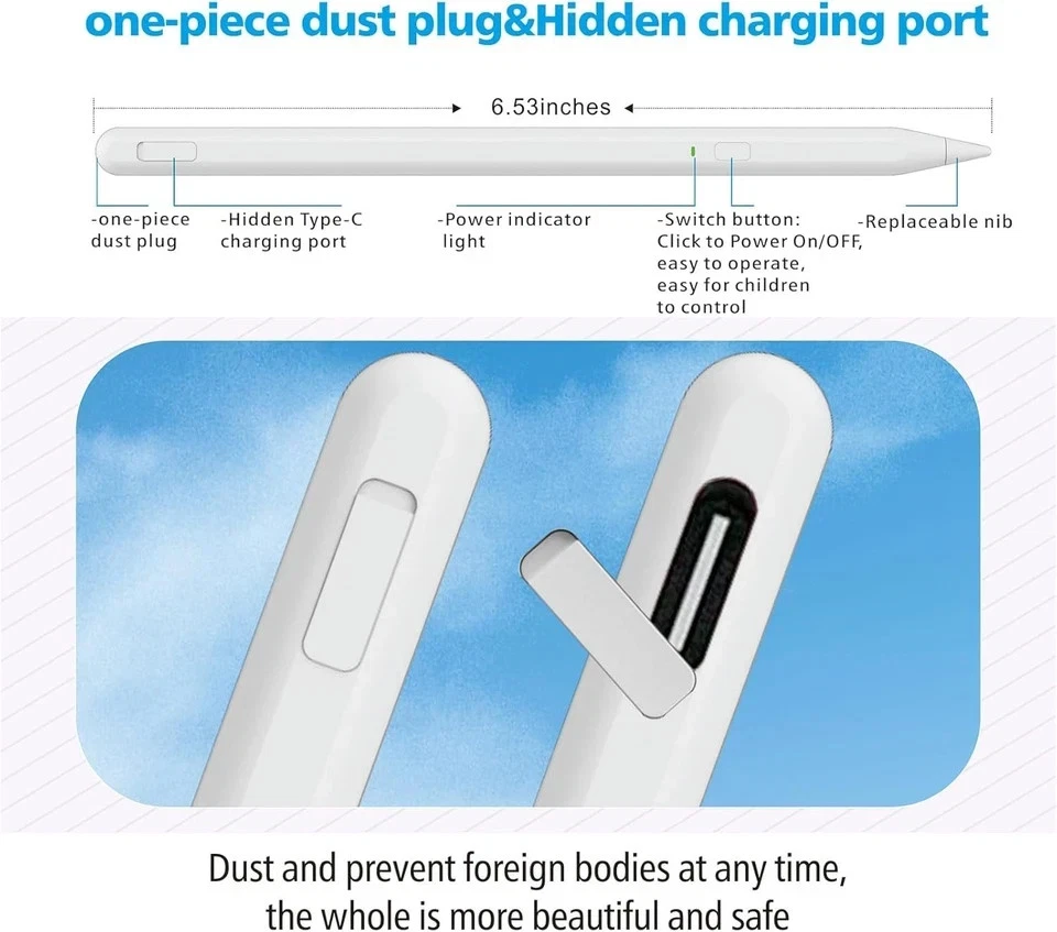 Color White Brand Milikilo Material Aluminum Number of Batteries 1 Lithium Ion batteries required. (included) Item Weight 0.42 Ounces Battery Average Life Standby 365 days Compatible Devices iPad & iPad Pro(2018 -2025), iPad Air 3rd/4th/5th/M2/M3 Gen, iPad Mini 5th/6th Gen, iPad (6th/7th/8th/9th/10th/11th Gen), iPad Pro (11"/12.9"/M4) iPad & iPad Pro(2018 -2025), iPad Air 3rd/4th/5th/M2/M3 Gen, iPad Mini 5th/6th Gen, iPad (6th/7th/8th/9th/10th/11th Gen), iPad Pro (11"/12.9"/M4) Item dimensions L x W x H 6.53 x 0.39 x 0.39 inches Are Batteries Included Yes Batteries Required? Yes See less About this item 【Smooth&Perfectly Precision】The iPad stylus pen is equipped with a 0.9mm upgraded POM tip, which makes it more sensitive and precise. No lagging, no skips, no scratches, giving you a better experience like a real pencil. the tilt technology makes your writing and drawing more freedom than ever. 【Pencil Holder&One-piece Dust Plug Design】Comes with a pencil holder,Strong adhesive keeps the pencil holder securely in place,holds your pen more securely, allowing you to grab or store the pen quickly and easily.The improved version of the 2025 Apple Pen solves the trouble that the old split dust plug is easy to lose after taking off, and the innovation is improved to the one-piece dust plug. When you need to charge the pen, first remove the one-piece dust plug on the charging hole, insert the charging interface and charge at ease, and you don't have to worry about the small dust plug being lost. 【Palm Rejection&Tilt Sensitivity】- Stylus for iPad pencil 10th generations palm rejection design can free your hands, You can easily use your hands on the screen.Stylus for iPad pencil 10th generations utilizes the latest tilt technology, Tilt function enables you to paint different stroke of thickness and depth by varying stylus pen for iPad tip dip, perfect for drawing or writing on iPad. 【Fast Type C Charging Port & LED Indicators】Compatible with Apple pencil 2nd generation can be fully charged in 40minutes and provides up to 10hours of working time.The iPad pencil also has an LED indicator,green light is on when starting and using, the red light is steady on when charging, and the red light is off when fully charged.And there is no use of the automatic shutdown function within1hour, saving power. 【Easy to Use Stylus Pen&Ideal Gift】- Without any APP required.Single press the button of the stylus to turn on/off easily without connecting via Bluetooth. Only weights 0.42ounce even little kids can use it perfectly! so this apple pen is perfect gifts for children at home learning, drawing, writing, and taking notes. A very good alternative to the more expensive Apple pencil. It is also the Best gift for Christmas, Thanksgiving, Valentine's Day,Mother's Day,Father's Day to your family and friends. 【Compatible with 2018-2025 iPad】Stylus for New 2025 iPad Air 11-inch & 13-inch(M3/M2),iPad Pro 11&13-inch (M4),Pencil for iPad 11th/10th/9th/8th/7th/6th Gen, iPad Air 3rd/4th/5th Gen, iPad Pro 11 inches,iPad Pro12.9 inches 3rd/4th/5th/6th Gen,iPad Mini 5th/6th Gen. For models that do not support charging, we have equipped with a Type cable: ⭕❌Not work for iPad mini7th, iPad pro 1st&2nd, iPad pro 10.5", iPad pro9.7", Earlier versions for iPad, iPhone, Android, Microsoft device.