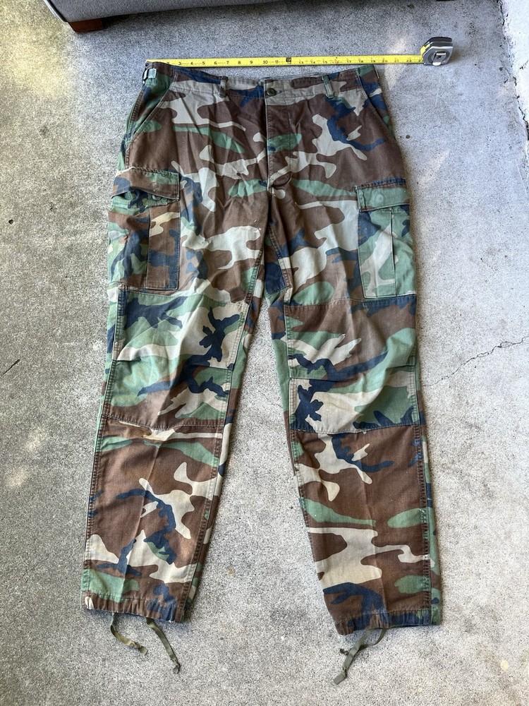 The product is a pair of Military Army Cargo Pants for men in size Large (38). They feature a Woodland Camo Green color scheme and are designed in BDU Combat style. The brand of the pants is Ladiga Sportswear, and they are original items with a militaristic theme.