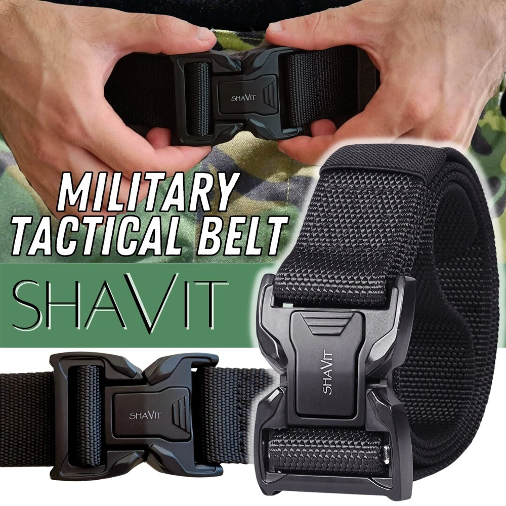 SHAVIT's Tactical Belt Military Style Belt Heavy-Duty Police Utility Nylon Rigger Belt with Quick-Release Metal Buckle Belt for Men Black HEAVY-DUTY BUCKLE: made of heavy-duty zinc alloy, strong and durable QUICK RELEASE DESIGN: a simple push on the golden tabs and the buckle is released. Easy to operate and convenient to carry How to Wear - 1.Remove the buckle from the webbing. 2. Get the webbing through you belt loops. 3. Adjust it to your perfect size. Total Length 125cm/49 inch Fits Waist 33"-43" KT Deals Military Tactical Belt is not only Army fans’ favorite, but also the outdoor sports and field training friends’ good partnersand can the belt prior to a camping trip . This belt is the best choice for you Quick Release - The metal quick-release buckle makes fastening and releasing the belt extremely convenient and quick. No Holes - No holes on the belt, the tactical belt is full adjustable to a certain waist size. Heavy Duty - The tactical belt is with a metal alloy buckle, it can bear a large pulling force. Belt Size: Belt Width: 3.8cm / 1.5in Belt Length: 125cm / 49in in this tactical style belt comfortably fits up to a 43” waist.