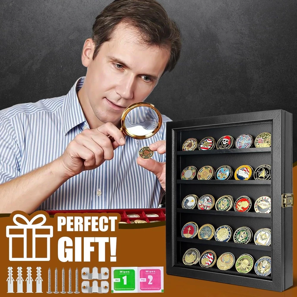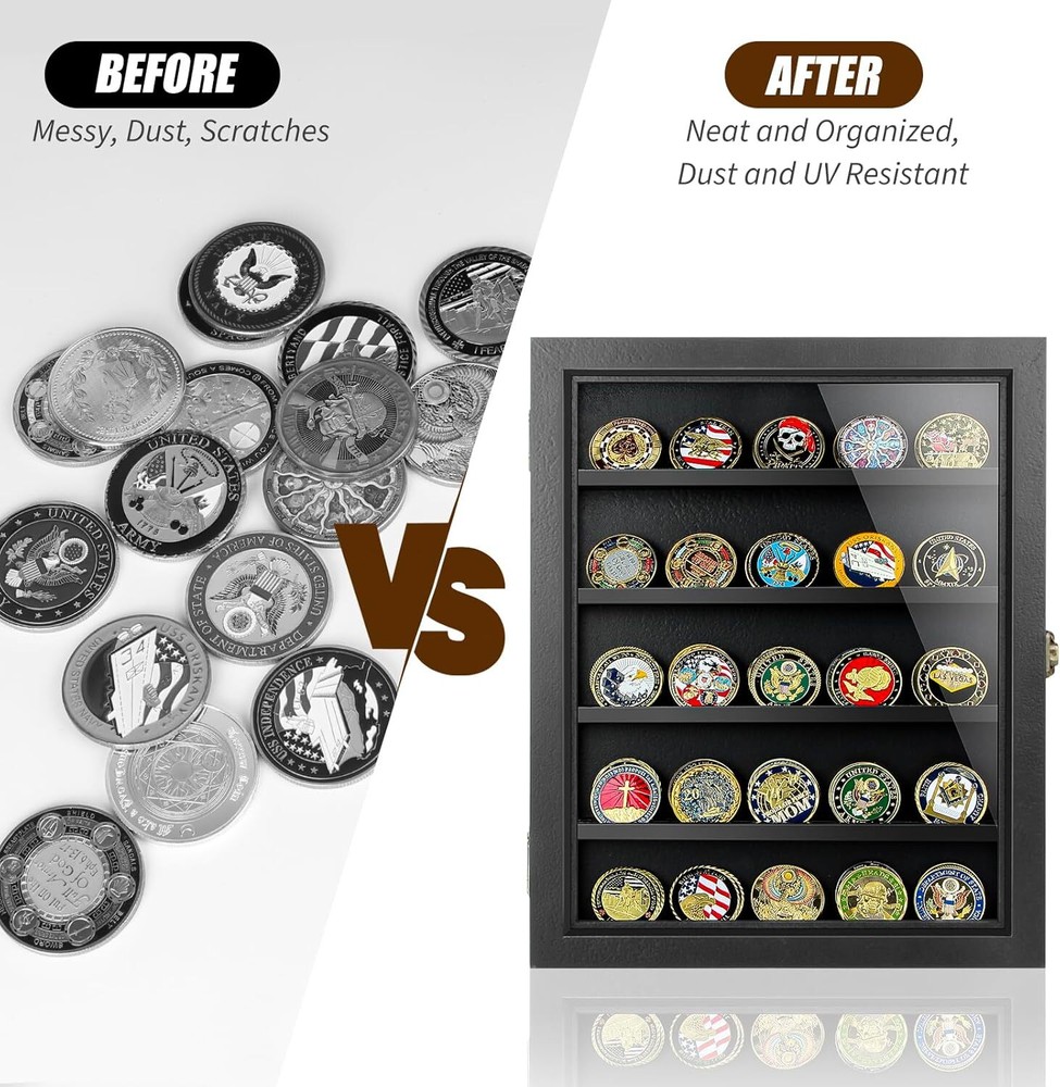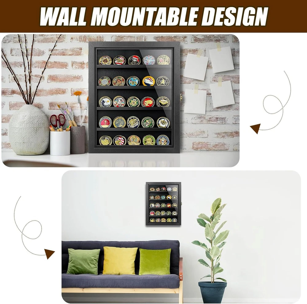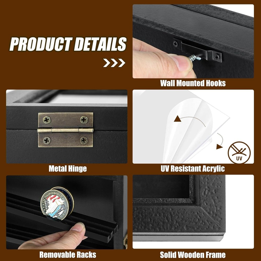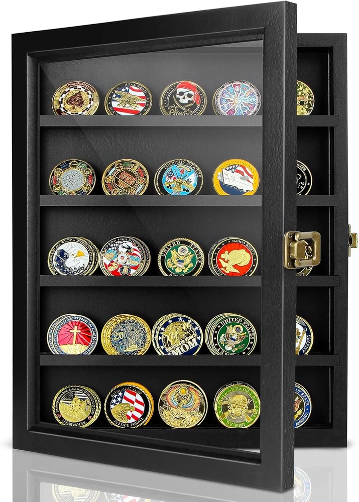 Coin Display Cabinet, Coin Collection Display Rack for Wall Mounted Military Medal Box Display Cabinet with Removable Double Recessed Shelves and Acrylic Panels - Black 80%wooden/20%acrylic PLEASE NOTE: The acrylic door is covered with peel-off protective film on both sides. Peel it off for transparency display, or leave it on for protection. Strong Protection: Our display box is built to last and easy to care for. Its matte black finish stays sharp, while the clear acrylic panel protects your collectibles from sunlight, keeping their colors vibrant. Flexible Display: Customize your showcase with four removable shelves, designed to securely hold coins of different sizes at an angle. This prevents slipping and ensures a neat presentation. Easy Wall Mounting: Hang it effortlessly with the included metal bracket, adding a touch of style to any space with its polished finish. Multi-Use Storage: Perfect for various collectibles like challenge coins, medals, sports coins, and badges. The acrylic panels keep your treasures looking fresh. Dedicated Customer Support: We're here to ensure your display case arrives safely and to assist with any questions or issues. Our team is dedicated to your satisfaction with our premium display solution.