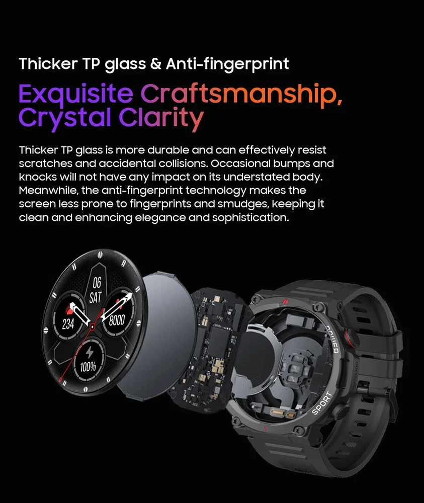 Military Smart Watch for Men (Call Receive/Dial) Rugged Tactical Fitness Tracker 👍 Fitness Tracker/ Bluetooth Calls/ Heart Rate/ Oxymeter/ Sleep/ Smart Notifications/ Pedometer/ Custom Dials/ Weather Forecast/ Sedentary Reminder/ Stopwatch/ Timer/ Alarm Clock/ Music Control/ Camera Control/ Don't Disturb Mode/ Find Phone and more👍 💥【Rugged Outdoor Smart Watch for Men】 Blackview W50 smartwatch is protected with scratch-resistant glass screen for durability. A robust fitness watch with a large 1.39'' Full HD screen that can display clearly and vividly for you. A variety of online watch faces make the watch more individual and unique. Equipped with 2 comfortable and skin-friendly wristbands (silicone band and woven band), the length can be adjusted freely. 💥【Bluetooth Calls, Answer/Make】 The smart watch for men supports Bluetooth calls, and the high-fidelity speaker and microphone can make and receive calls. It also supports syncing phone contacts and call logs. When your phone receives a call or message (such as SMS, E-mail, WhatsApp, Facebook, Instagram, etc.), the smart watch will give a real-time notification and you will never miss anything again. 💥【Health Monitor, Live Better】 The smartwatch for men also has a real-time health monitoring function, which records and monitors the user's health data, including heart rate, blood oxygen, emotional stress, sleep monitoring. This monitoring data can help you understand your health status, sleep quality and exercise activity in daily life, so that you can take appropriate measures to improve your health and lifestyle. 💥【100 Sports Modes】 This fitness watch for men supports 100 sports modes, meet your different sports needs. Choose the appropriate mode according to your sports scene (running/cycling/ball sports/martial arts/ice sports, etc.). In addition, the watch also supports recording your daily steps, calories burned and distance. You can analyze the watch's fitness data via "InfoWear" APP to achieve better training results. 💥 【Compatibility and Long Battery Life】 This fitness tracker is compatible with most smartphones, not suitable for iPads, tablets, PCs.Equipped with a 370mAh large-capacity battery, it supports 2.5 hours of fast charging, can last up to 20-30 days in standby, and can last up to 5 days in normal use. IP68 waterproof, you don't need to take off the watch in rainy days and when you wash your hands. (*Note: This product is not suitable for sauna, hot water, showering, diving, swimming) 🎁 【Stylish Gifts】 This fitness tracker smartwatch is the perfect gift for birthdays, anniversaries and special occasions. Perfect for those who enjoy outdoor or indoor activities. Perfect gift for dad, mom, brother, sister, friends, family, husband , wife on Christmas, Valentine's Day, Anniversary, Birthday, Thanksgiving. APP Infowear Waterproof 10M Band Colour Black Screen 1.39" HD Touch Screen MPN Does not apply Serial Number W50 Case Color Black Model02 W50 Smart Bracelet Case Colour Black Manufacturer Warranty 1 Years Network Bluetooth Case Size 1.39 Inches Features Blood Oxygen Sensor, Caller ID, ECG Monitor, Fitness Tracker, Heart Rate Monitor, Music Player, Sleep Monitor, Touchscreen, Waterproof, Water-Resistant, Bluetooth Call, Father's Day gift, birthday gift Operating System Android Wear Storage Capacity Flash 128MB Case Material Zinc alloy Band width 22mm Compatible With Android 4.4 & iOS 8.0 above Screen Size 1.39 Inches Brand Blackview Series Blackview W50 Type Blackview Smart Watch Battery Capacity 370mAh Band Color Black Band Material Silicone Compatible Phone Models For IOS,Android Design/Finish HD Touch Screen Model Smart Bracelet Compatible Operating System Android, iOS - Apple Country/Region of Manufacture China Connectivity Technology Bluetooth 5.3 Resolution 360*360
