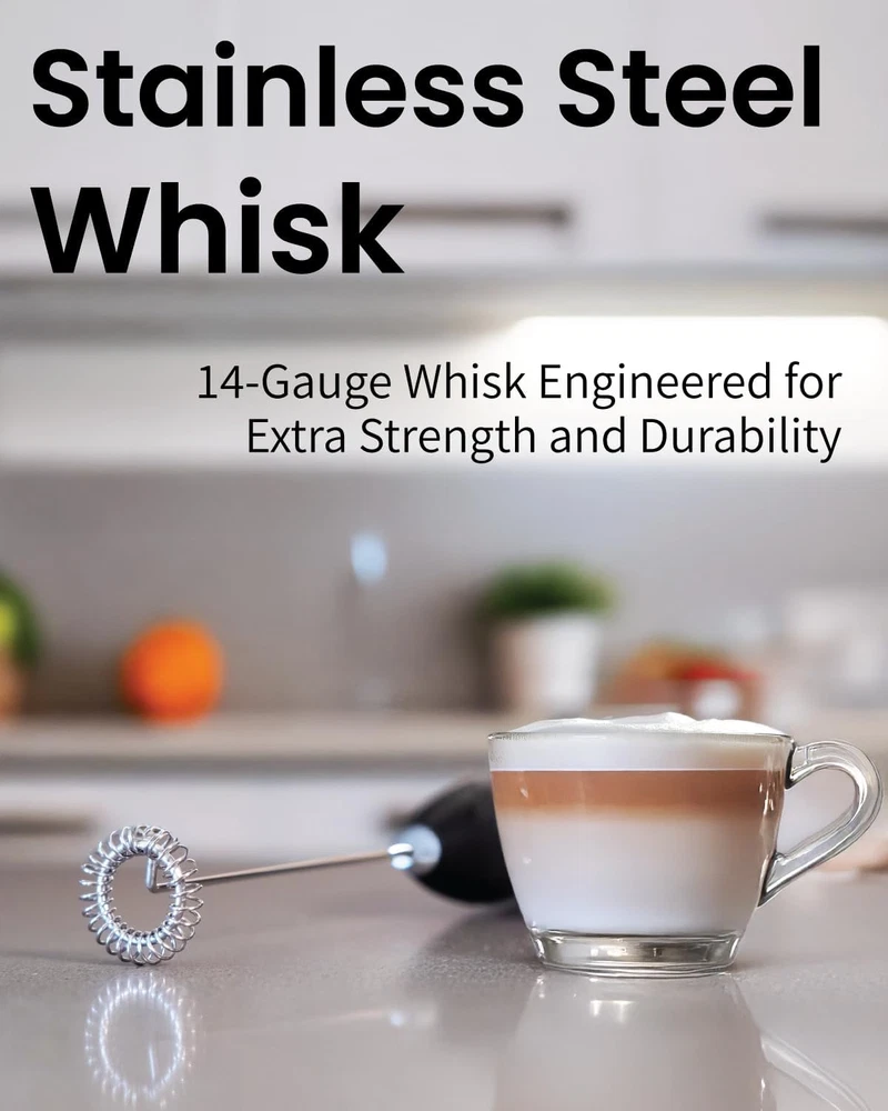 UNLEASH YOUR PASSION FOR COFFEE: Immerse in the perfect froth! Our milk frother's high-speed motor crafts luxurious foam in just 15-20 seconds, transforming ordinary coffee time into a moment of pure joy (Requires 2xAA batteries – not included). PEACE OF MIND GUARANTEED: Life can be unpredictable, but our 2-year warranty isn't. Should you have concerns, we're here to ensure your satisfaction. Because your happiness is our success. BE YOUR OWN BARISTA: No more coffee shop queues. Our frother enables you to create café-quality lattes, cappuccinos, macchiatos, flat white, matcha tea, or even your greens powder smoothie, right in the coziness of your home. A personal coffeehouse experience, any time you desire. COMFORT REDEFINED: Our milk frother, designed with a ergonomic soft-touch grip, is the perfect coffee frother handheld tool. It's more than a tool; it's an ally in your drink crafting journey. Use for cocktails, drink mixes and more - the perfect mini electric stirrer for powder drinks ELEGANTLY EFFORTLESS: With the provided stand, cleanup and storage become a chic part of your routine. Just rinse, rest, and relish the simplicity. Because every moment of your coffee experience should be uncomplicated and delightful. Product Description The video showcases the product in use. The video guides you through product setup. The video compares multiple products. The video shows the product being unpacked. Compare Elementi Milk Frothers Add to Cart Add to Cart Add to Cart Add to Cart Customer Reviews 4.5 out of 5 stars 19,081 4.4 out of 5 stars 1,402 4.3 out of 5 stars 1,082 4.4 out of 5 stars 1,402 4.5 out of 5 stars 1,236 Price $9.99 $ 9 . 99 $9.89 $ 9 . 89 — $4.94 $ 4 . 94 $8.99 $ 8 . 99 Stainless Steel Whisk ✔ ✔ ✔ ✔ ✔ Stand ✔ ✘ ✔ ✘ ✘ On/Off Button Press and hold to operate Press and hold to operate Turn on to operate Press and hold to operate Press and hold to operate Batteries 2 AA Batteries (not included) 2 AA Batteries (not included) 2 AA Batteries (not included) 2 AA Batteries - Included! 2 AA Batteries (not included) Motor High Torque Motor High Torque Motor Extremely High Torque Motor High Torque Motor High Torque Motor