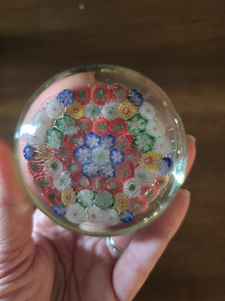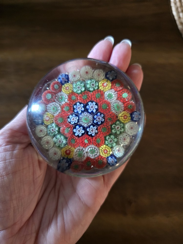Beautiful multicolor millefiori glass paperweight featuring a classic floral cane pattern throughout. Heavy, solid glass with vibrant colors that display beautifully in light. Pre-owned vintage condition. The top surface shows some light superficial scratches consistent with age and normal use. Some wear to it. Perfect for collectors, desk display, or vintage décor.