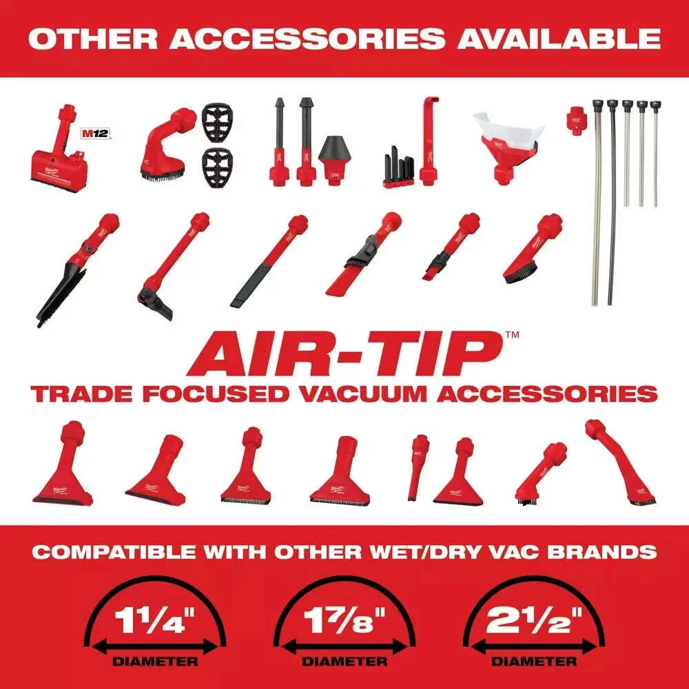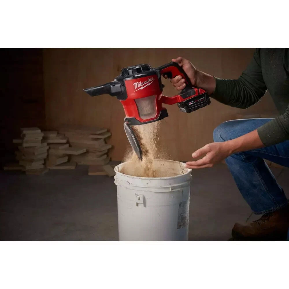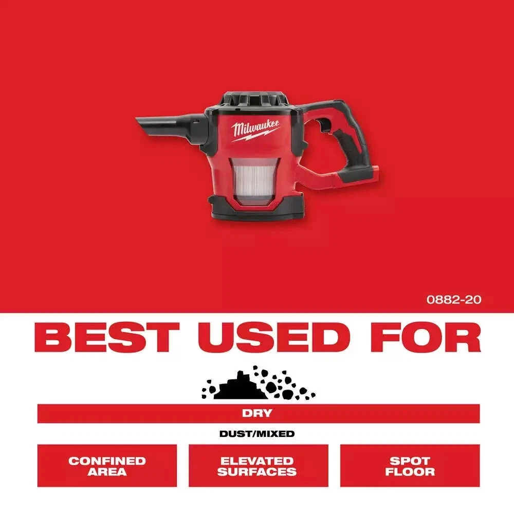 Milwaukee 0882-20 M18 18V Lithium-ion Cordless Compact Vacuum - Bare Tool New Product Details Color: Red Voltage: 18 v Power Method: Cordless Hose Length: 48 in Description The M18 Compact Vacuum provides users with the most powerful & adaptable handheld cleanup tool. A high performance motor creates best in class suction for cleanup of drywall dust, wood/metal shavings, and common jobsite debris. With a unique handheld design, the M18™ Compact Vacuum can be used in a wide variety of orientations and applications across the jobsite. For added versatility, the 0882-20 comes with (2) extension wands, 4’ flexible hose, crevice tool, floor tool, and removable HEPA filter. A clear view and easy to empty canister provides added convenience. As a part of the M18™ System of tools, it is powered by REDLITHIUM™ battery packs, which deliver up to 25 minutes of run time on a XC5.0 battery pack and 43 minutes of runtime on a HIGH DEMAND™ 9.0 Battery Pack. Includes: [1] M18 Compact Vacuum(0882-20) [1] 4' Hose [1] Crevice Tool [1] Extension [1] HEPA Filter [1] Floor Tool Features: High performance motor Adapts from handheld to stationary 40 CFM Removable HEPA filter Clear view and easy to empty canister Canister volume: 36 oz Inlet Diameter: 1-1/4" Battery System: M18 Compatible Batteries: All M18 REDLITHIUM Battery Packs Compatible Chargers: All M18 Chargers 5 Year Limited Warranty