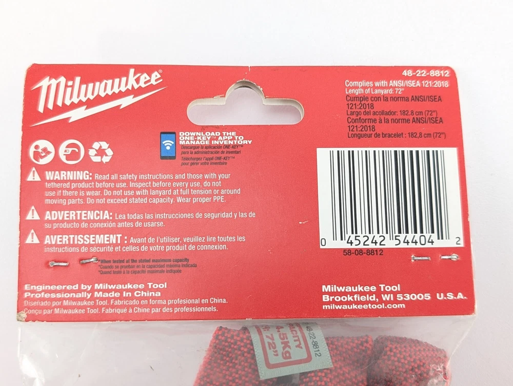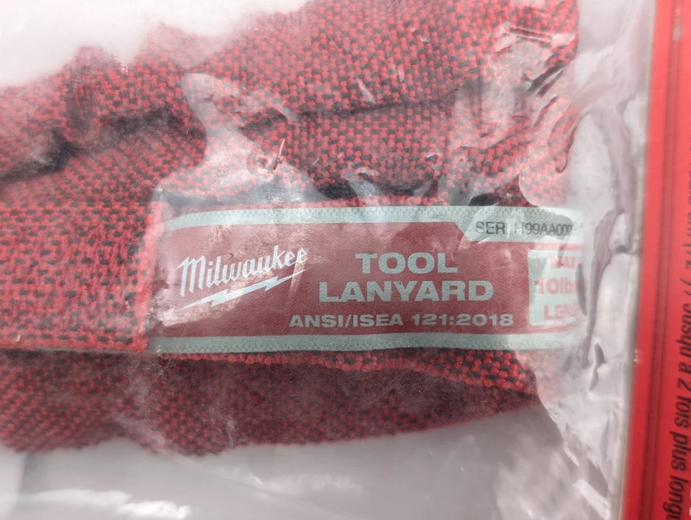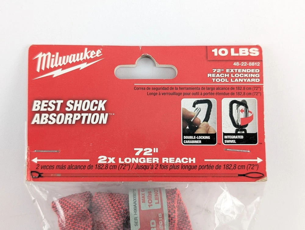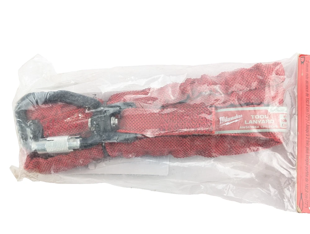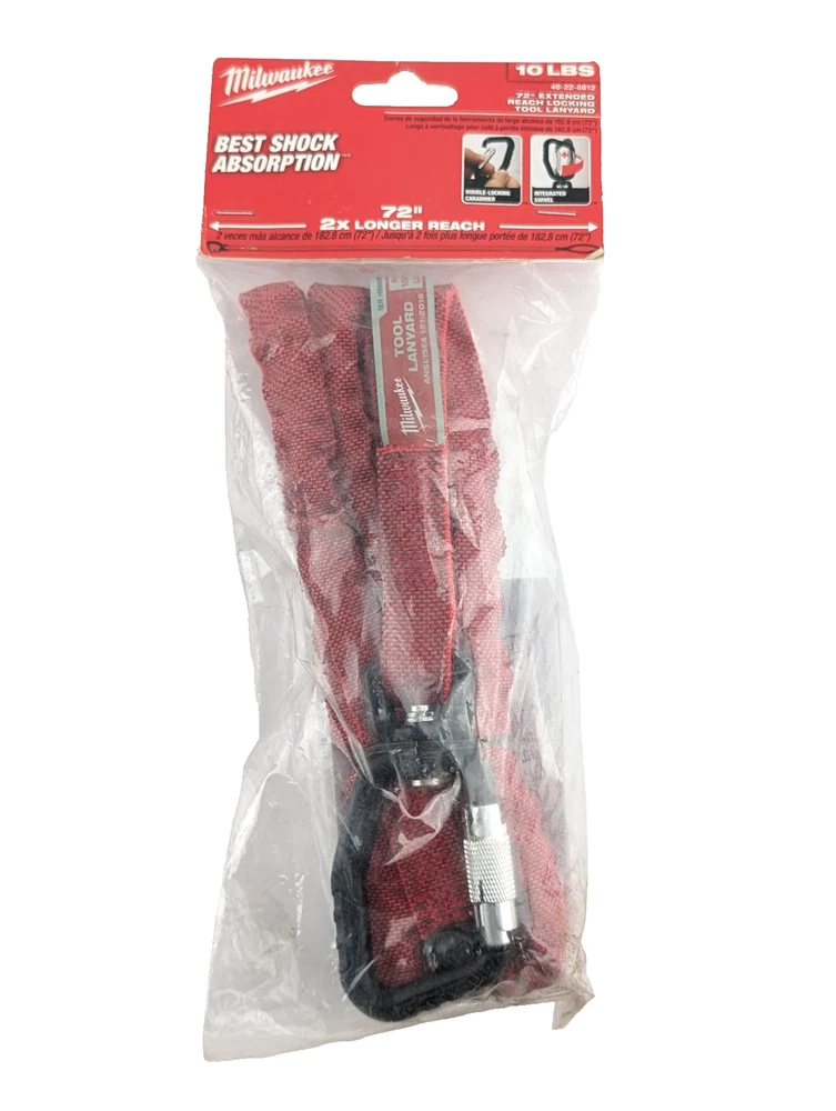 The MILWAUKEE® 10lbs 72" Extended Reach Locking Tool Lanyard increases productivity with the industry's Best Shock Absorption while working at heights. The lanyard is engineered to deliver the best shock absorption, slowing the tool gradually if a drop occurs to reduce the risks associated with dropped tools. The 72" lanyard has 2X longer reach than a standard Milwaukee 36" locking tool lanyard for better accessibility while working overhead or farther from a tethering point. Double-Locking carabiners require two actions to open, ensuring a secure connection. The Milwaukee tool lanyard has integrated swivel carabiner reduces twists when using tools and is ANSI/ISEA 121-2018 compliant. The red color coded lanyard allows for easy identification of the lanyard's weight rating. The Milwaukee 72” Tool Lanyard is for use with tools up to ten pounds. ANSI/ISEA 121-2018 Compliant Integrated Swivel Red Color Coded 10lb Weight Rating •Third Party Tested at 2:1 Safety Factor New in original packaging.