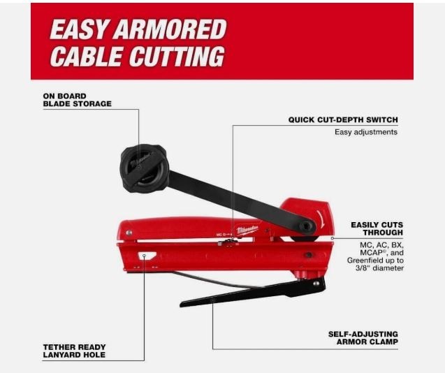 Listing is for a brand new in the package Milwaukee Tool Armored Cable Cutter MC, AC, BX, MCAP Greenfield 48-22-6111 Armored Cable Cutter delivers easy armored cable cutting through MC, AC, BX, MCAP®, and Greenfield armor. The armored cable cutter features a self-adjusting armor clamp for fast and easy armor clamping. The armored cable cutter also offers a cut-depth switch allowing for quick adjustments between standard MC and reduced MC. The cutter delivers an easy blade change design and is equipped with extra blade storage conveniently located in the rotating handle. Easy Armored Cable Cutting Self-Adjusting Armor Clamp Quick Cut-Depth Switch allows easy adjustment between standard and reduced armored cable Cuts armored cable up to 3/8" diameter Easily cuts through MC, AC, BX, MCAP®, and Greenfield Clean Cuts: Eliminates burrs, leaving safer to handle material and no need to clean up after cut On board storage for extra blades Tether Ready Lanyard Hole