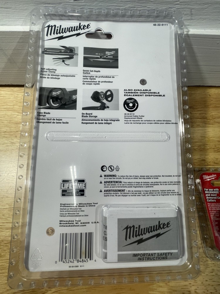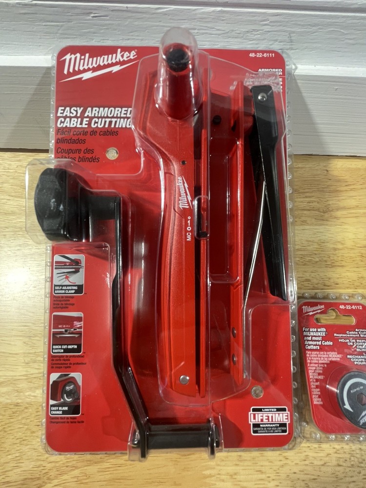 The Milwaukee Armored Cable Cutter MC is a high-quality cable cutting tool designed for use on armored cables, AC, BX, and MCAP Greenfield. With the manufacturer part number 48-22-6111, this cable cutter from Milwaukee ensures precise and efficient cutting of various types of cables. As a reliable product from a trusted brand, it is a valuable addition to any automotive tool collection. Included is an extra cutter wheel for the Milwaukee cable cutter