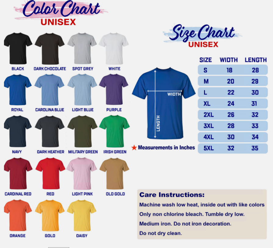 eBay Printed & Shipped in the USA Condition : 100% Brand New with High Quality! Size : S M L XL XXL XXXL 4XL 5XL US Standard Unisex Heavy Cotton Tee Gildan 5000 Send me a message when you need another Size or Color Fabric : 100% Cotton (White, Black, Charcoal, Navy) Grey (90% Cotton 10% Polyester) NOTE: 1: Please allow 0.5" / 2 CM differs due to manual measurement. 2: The color may be a little different due to the effect of light and moniter setting, please understand Shipping We ship within Three business days of payment, usually sooner. We use a selection of shipping services such as UPS, FedEx, USPS etc. Local pickups and combined shipping options are not provided at this time. Return You can return a product for up to 30 days from the date you purchased it. Any product you return must be in the same condition you received it and in the original packaging. Please keep the receipt. Payment We accept payment by any of the following methods: Payments managed by eBay Please pay as soon as possible after winning an auction, as that will allow us to post your item to you sooner! Feedback Customer satisfaction is very important to us. If you have any problem with your order, please contact us and we will do our best to make you satisfied. Contact Us If you have any queries, please contact us via ebay. We usually respond within 24 hours on weekdays. Thank you for shopping at our store.