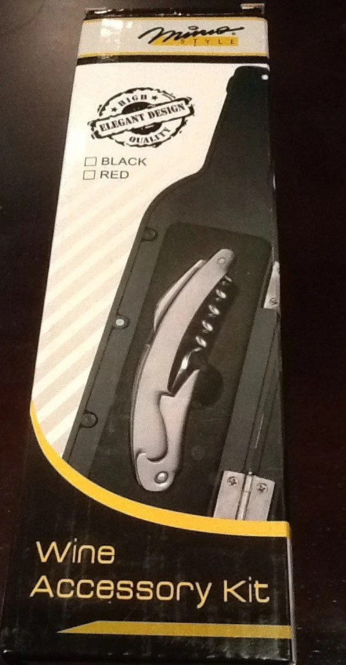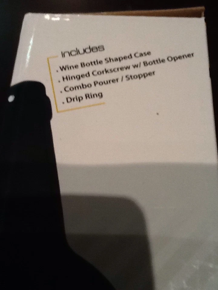 New in box. Includes: wine bottle shaped case, hinged corkscrew w/ bottle opener, combo pourer/stopper, drip ring. Free shipping in the US. Location: SR-RB1