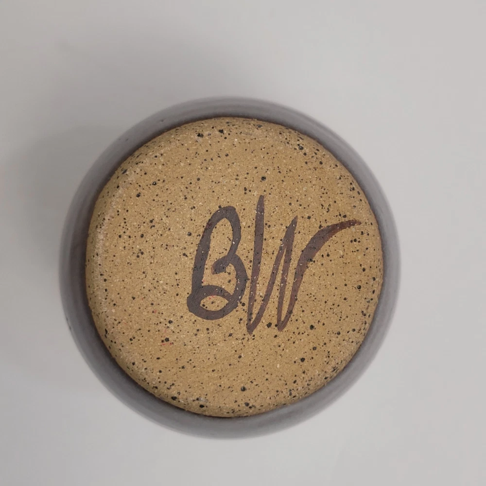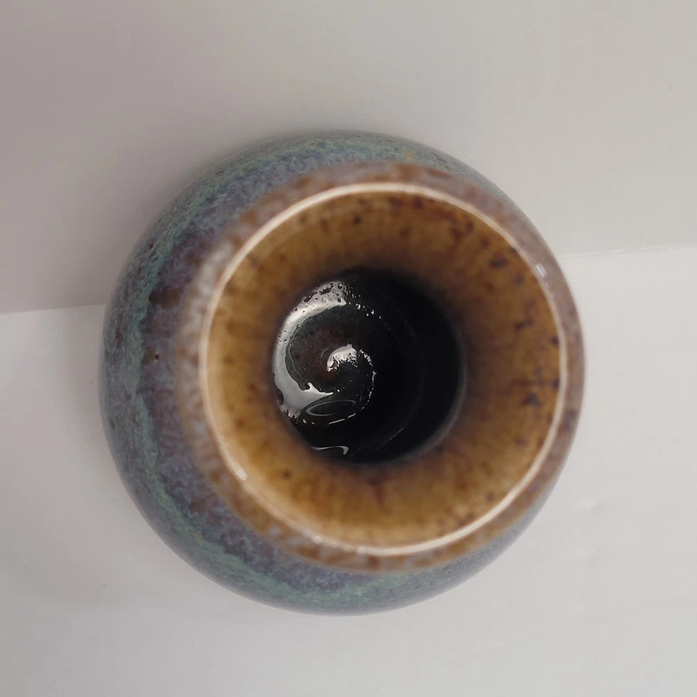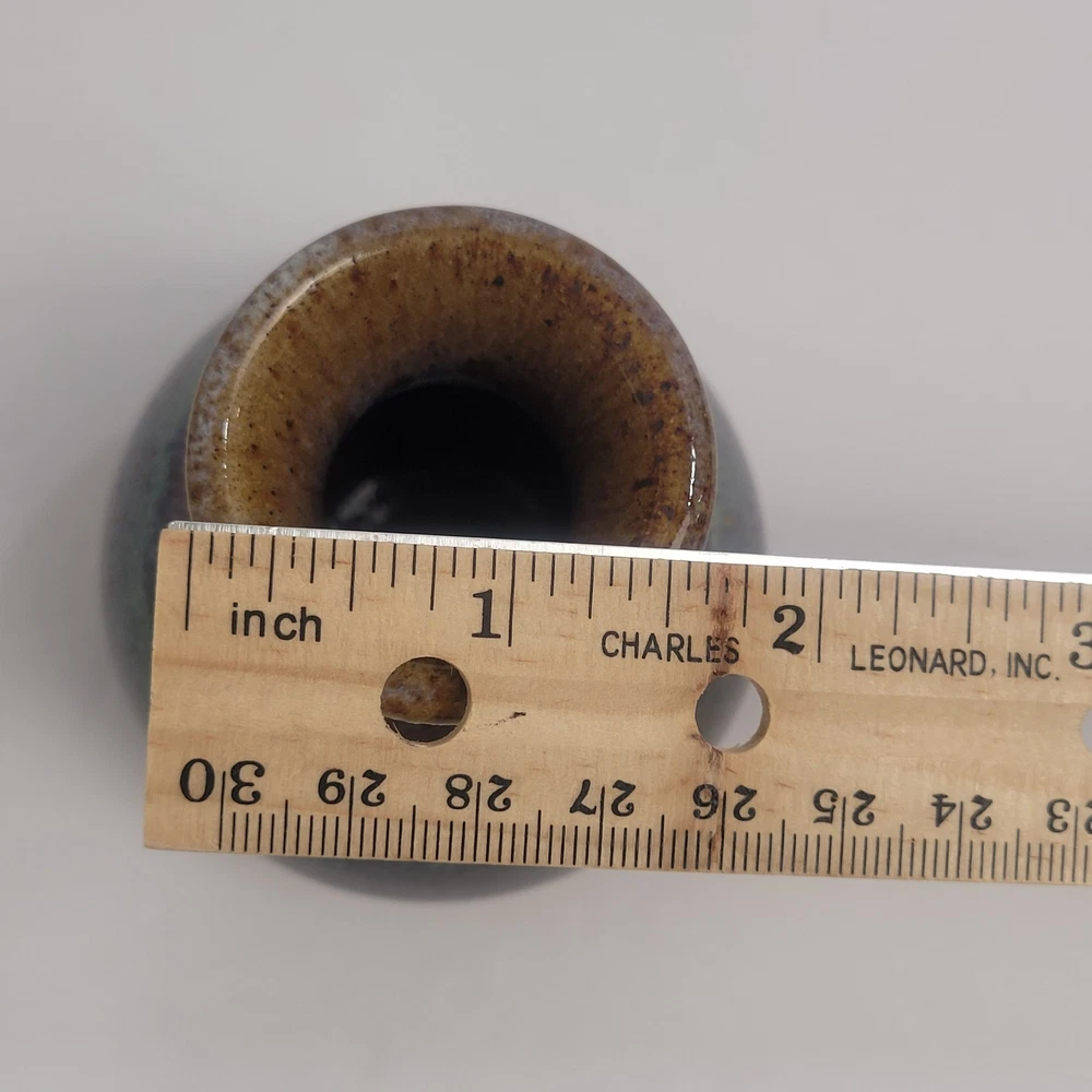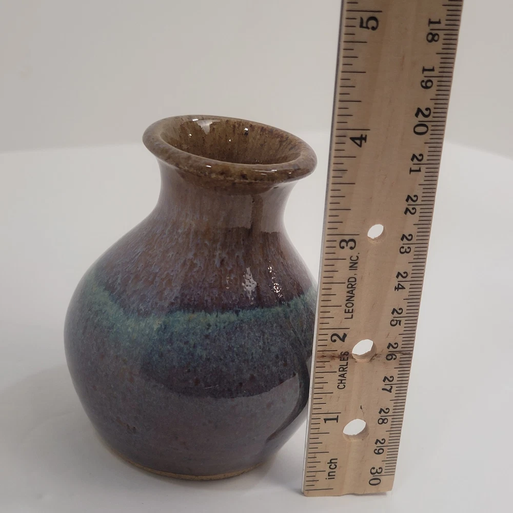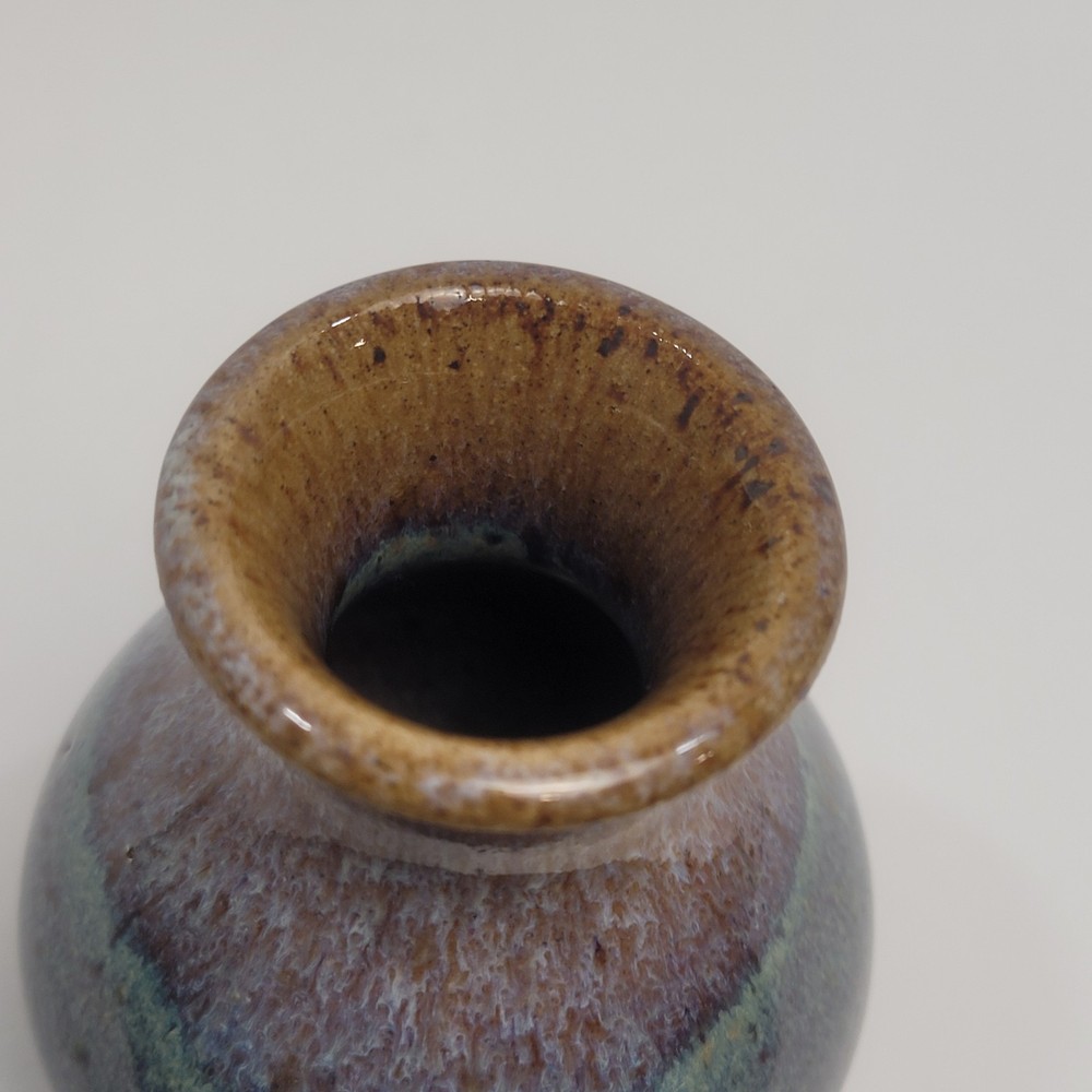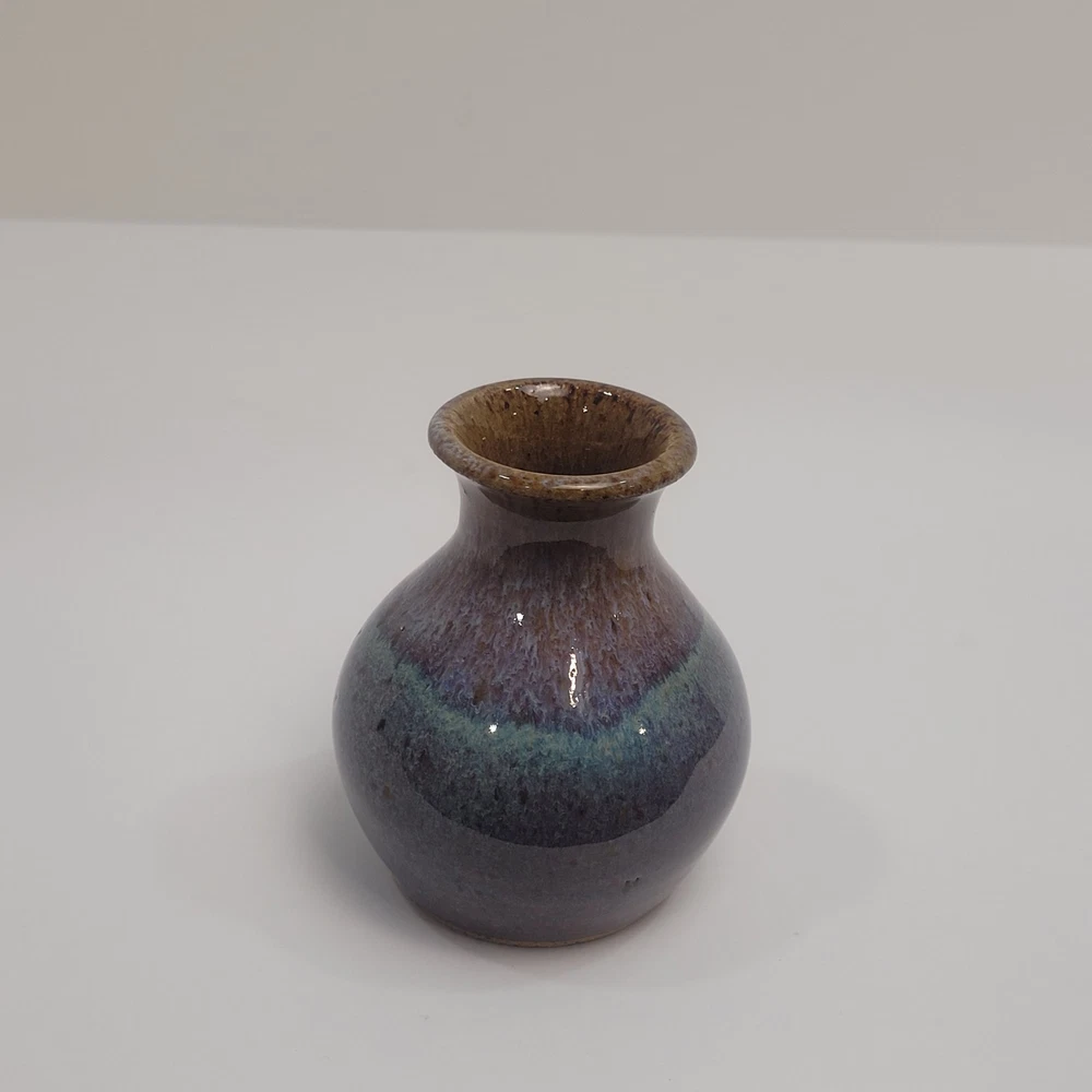 Art Pottery Drip Glaze Mini Bud Vase in shade of Purple, Blue and Brown. 3.5" Tall, Signed. Excellent condition.