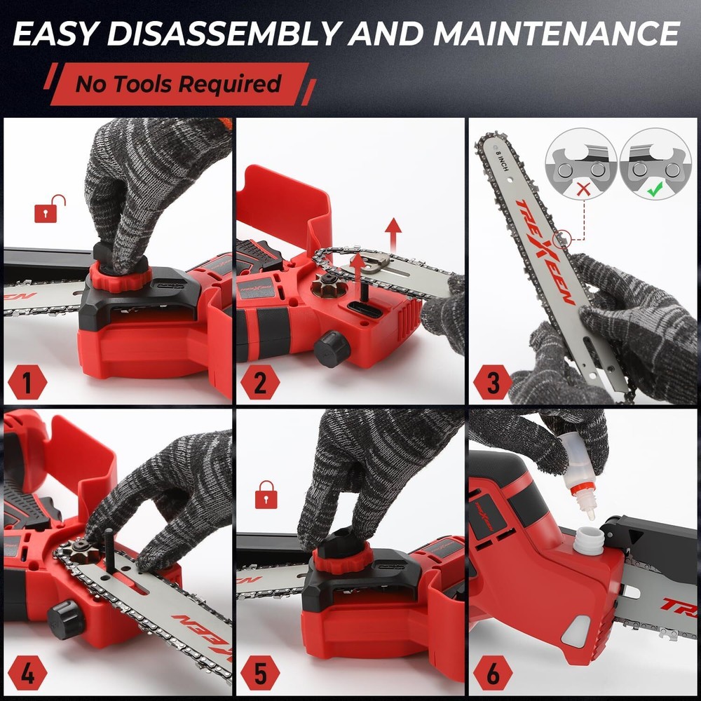 Mini Chainsaw for Milwaukee M18 Battery,8-Inch and 6-Inch 2-IN-1 Cordless Mini Chainsaw,Brushless for Electric Chain saw for Wood Cutting, Tree Trimming (Battery Not Included) Item Description About this item Compatible with Milwaukee M18 Batteries: Specifically designed for Milwaukee compatibility, making it easy to carry for outdoor tasks and home projects.This product does not include batteries. Safety Lock Feature: Equipped with a safety lock to prevent accidental starts, ensuring secure and safe operation for all users, especially beginners. 8-inch & 6-inch Dual-Length: Enjoy versatile cutting options with dual-length capabilities, allowing you to tackle various jobs efficiently. Powerful Performance: This mini chainsaw delivers robust cutting power, effortlessly handling gardening tasks, wood cutting, and more. User-Friendly Operation: Designed for easy use, the TREXEEN cordless mini chainsaw allows anyone, from DIY enthusiasts to professionals, to operate it with confidence.Perfect for gardening, home repairs, and DIY projects, this mini chainsaw is an essential tool for any toolkit. › See more product details *One Pair of Non-Slip Gloves and One Pair of Safety Glasses *One 8-Inch Blade and Chain, and One 6-Inch Blade and Chain The effective ventilation design automatically shuts off power when temperatures are too high, preventing motor burnout. The rechargeable chainsaw features a safety guard that protects you while cutting, logging, and pruning branches. It can rotate from 0° to 90°. The safety lock must be pressed before starting the chainsaw switch, eliminating concerns about accidental injuries. The widened hand guard provides greater coverage to better protect your hand from splashing debris or high-temperature sawdust Payment We accept payment only through PAYPAL Shipping We ship products worldwide through standard express courier service, it will reach within 7 to 10 days to abroad buyers, we ship the product after recieved clear payment and give full information about shipment to the buyer Return We accept product return within 7 to 21 days from delivery date but product should be in original position and not in damaged condition,the return shipping charges will be buyer responsibility