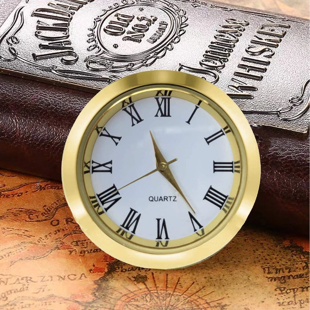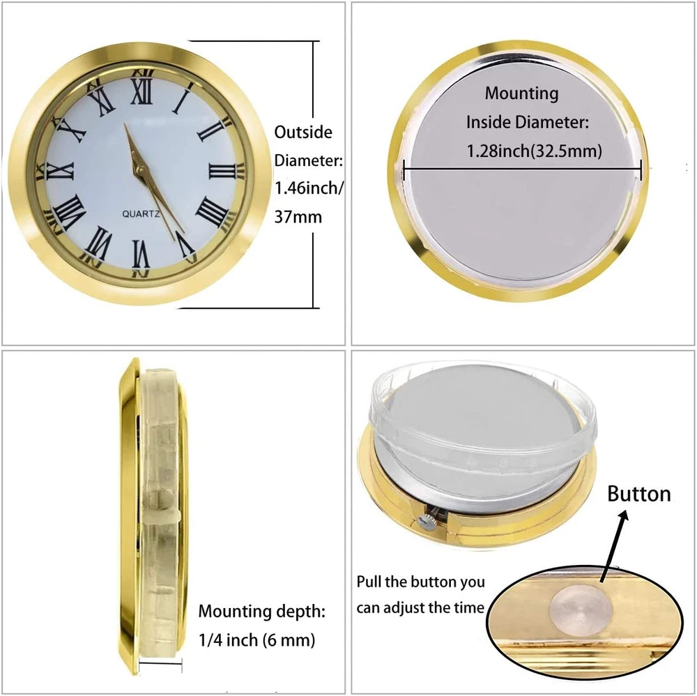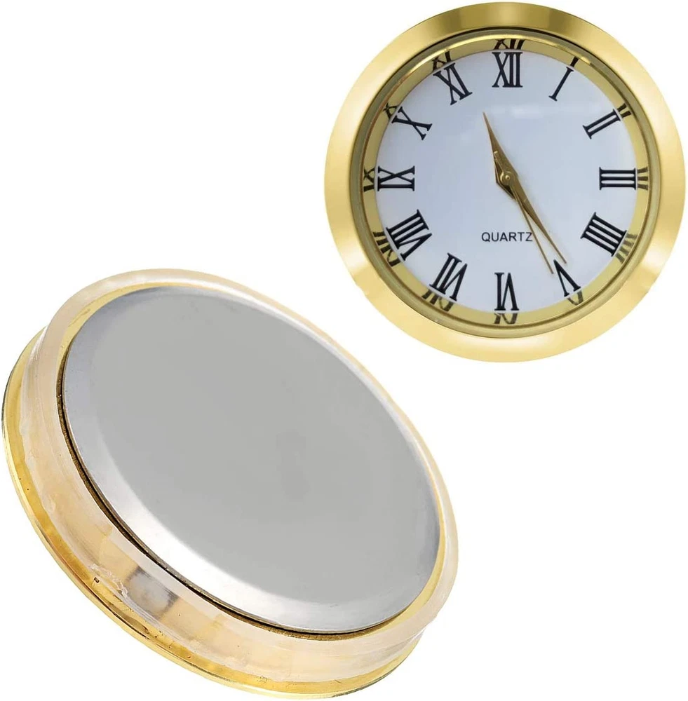 ✔️ Overall Outside Diameter: 1 1/2".This is the outside diameter of the clock face. Mounting depth: 1/4 inch (6 mm). ✔️ Mounting Inside Diameter: 1.28" (32.5mm) : This is the insert diameter of the opening that the clock fits in. With addition of the ring gasket (included) this increases to 1.36" (35 mm). You can use this roman clock insert to make clock crafts. ✔️ Appearance: The insert clock features smooth surface and gold bezel with exquisite workmanship; It is designed with gold roman numerals marking on the white dial plate for easy reading. ✔️ High quality: with stainless steel back and scratch resistant mineral glass lens, this mini clock is your good choice to make crafts or use it as a nice gift ✔️ Compatible clock: Miniature clock fitup Insert replacement fits in many types of small glass & crystal clocks quartz movement. This mini clock movement insert fits in many popular glass and crystal clocks on the market. Specification: Color:gold bezel, gold roman numerals, white dial plate Material: stainless steel back and scratch resistant mineral glass lens(friction-fit mounting system) Clock diameter: 1 1/2 inch (37 mm) Mounting diameter: 1 3/8 inch (35 mm) Mounting depth: 1/4 inch (6 mm) Package includes: 1 x Clock insert