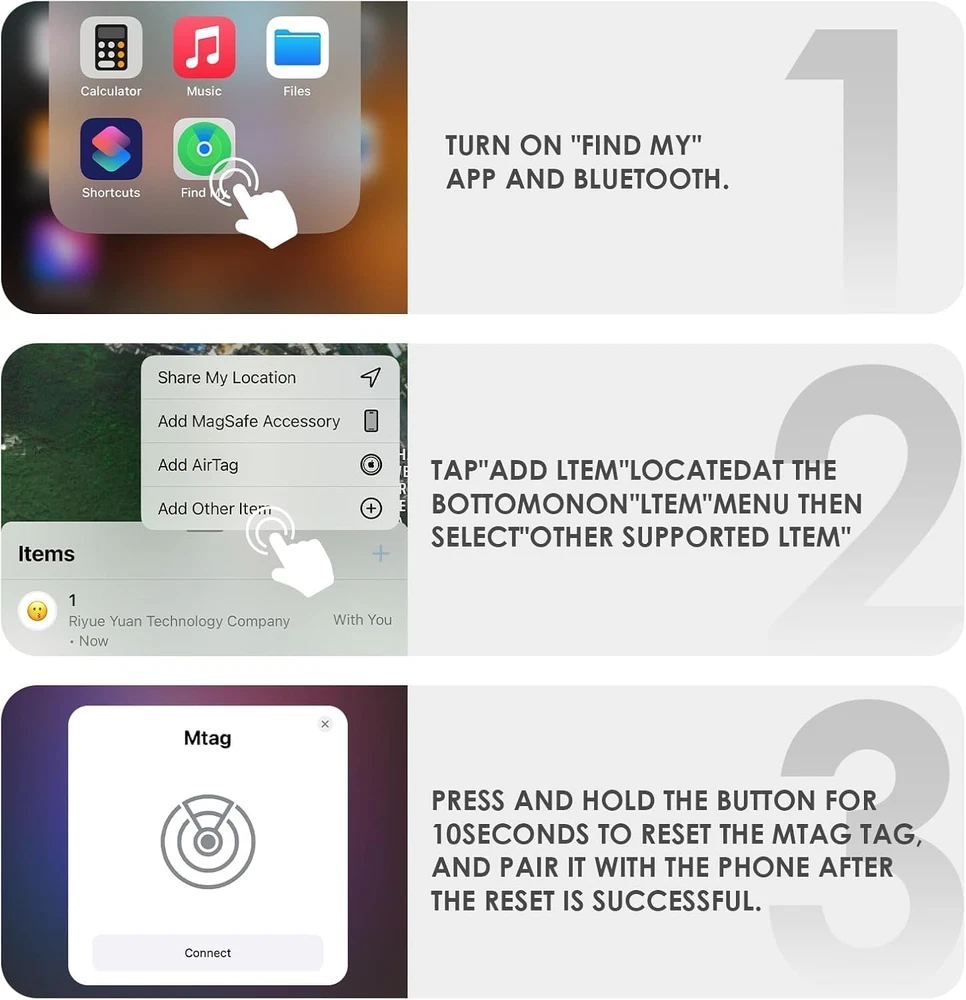 ✅【No Subscription GPS Tracker Device for Vehicles】There is no monthly fee for this Car Tracker, download the Find My app and use it directly. Track your cars, trucks and motorcycles, keys, wallets, luggage, bikes, etc. without paying any extra fees. ✅【Smart GPS Locate Vehicles Tracker】The mini car tracking device allows you to easily connect your vehicle through the Find My app, allowing you to track in real time from anywhere in the world, no matter where your Car Vehicles is locat. ✅【Real Time GPS Tracker for Vehicles】Whether you need a child tracking device or a vehicle tracker, our Car GPS tracker can be supported in apps that allow you to track in real time. ✅【Privacy Protection】The "Find My" app network is encrypted and anonymous, ensuring that location data and history are not stored on the tracker device for vehicles. ✅【Long Battery Life Vehicle Finder】Each GPS Tracking Device is powered by a replaceable CR2032 coin cell battery that last over a year. The Car GPS Tracking Device will notify you when the battery is low, ensuring uninterrupted operation. ✅【Weatherproof Magnetic Case】The Vehicle Finder is equipped with super magnetism case to securely attach to the underside of your vehicle or any steel metal surface; The vehicle tracker device is equipped with a waterproof silicone case, protected from bad weather. ☛☛☛☛☛【Steps to Connect to "Find My" APP】Turn on Bluetooth, open the "Find My" APP-item-add items-other supported items-Connect tag. Product description 1 Track Various Vehicles 2 Track Items/People/Pets