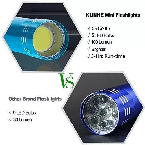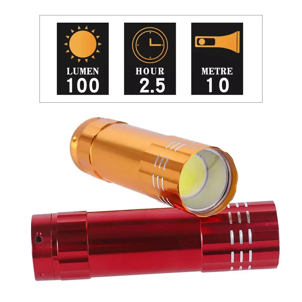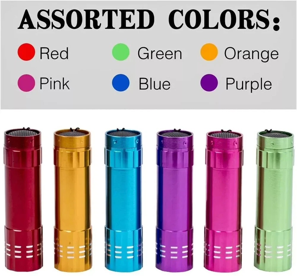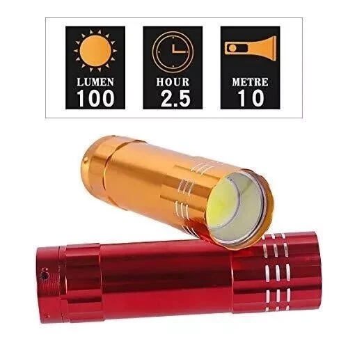 This is a new type mini flashlight, COB LED, softer and higher color rendering.As an upgraded version, it has a greater value.New version features- Small but bright (Max 100 Lumen)- Wider lighting of 30 ft- 3×AAA Batteries will give you up to 2.5 hrs bright lighting. Or Last a couple of weeks with normal daily use.- Compact Design – Small and Light weight.(3.4in length,1in wide,1.6 oz)-With lanyard, easy to carry.PACKAGE CONTENTS- 6x Mini LED Flashlight-18x AAA batteriesRETURN POLICY- One year warranty and replace for free New COB LED, softer and higher color rendering,brightness 100 lumen. Light distance is 10 Meter(30ft ) Small and Lightweight- It is compact enough to fit in your pocket,car glove box,toolbox,nightstand or purse,ideal for home use,dog walking,camping and party decoration. Easy To Use And Long-Lasting: Simple on/off push button operation and 3x AAA Batteries up to 2.5 hours of lighting, or normal use for several weeks.(Batteries included) Assorted Colors: Red,Green,Pink,Blue,Orange,Purple. Aluminum Shell. Includes 6 Flashlights and 18 Batteries- Keep one in your car, one in your home, or gift one to a friend or family member. LED number:9 Size:87 X 26mm(L*D) Money device Super bright and high quality Power by:3 x AAA batteries included Light source: Hydraulic leak measurements and biometric testing 8 x 9 LED Flashlight Detect metal cracks Ink curing Material:Aluminum alloy Size:87 X 26mm(L*D) Measurements And Biometric Testing LED Number:9 Hydraulic Leak 8 X 9 LED Flashlight