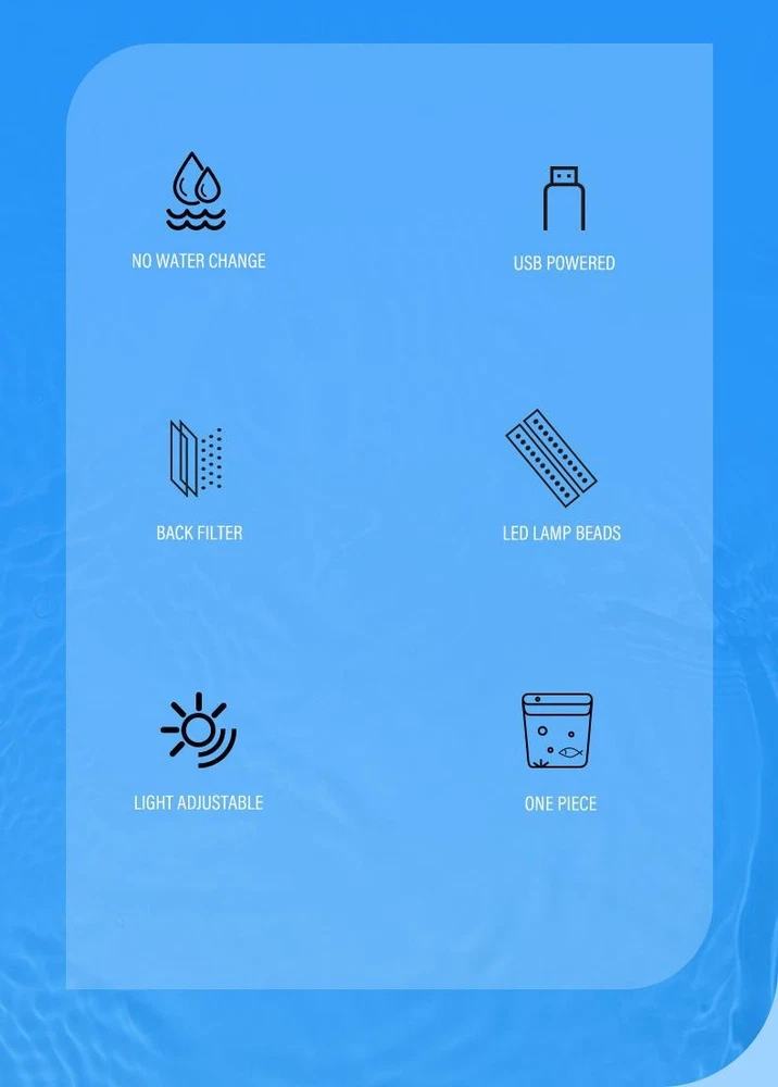Fish Tank Living Room Small Mini Douyu Tank Household Tabletop Ecological Tank S White Back Filter Fish Tank Size: 20X15X20.5cm Contains: White fish tankWater Pump Biochemical CottonThickened filter cotton * 1 CableLED lights Black Back Filter Fish Tank Size: 20X15X20.5cm Contains: Black fish tankWater Pump Biochemical CottonThickened filter cotton * 1 CableLED lights Backfilter Cycle Ecological Fish Tank Save a copy of "nature" by your side 1.No water change 2.USB Power3.Back Filter 4.LED Lamp Beads5.Light Adjustable 6.One Piece High Definition and Transparent Enjoying Natural Beauty The outer cylinder is formed with integrated technology, and the PC material is explosion-proof, wear-resistant, and has a light transmittance comparable to glass ultra white cylinders, enjoying an immersive panoramic view Silent Water Pump LED Fish Tank Light Creating a Beautiful Underwater World Three levels of lighting and one level of colorful lightingMute button light adjustment Creating a Colorful Underwater World High Brightness and Transparency Light Brightness Display Low, medium, high brightness and dazzling colors can be selected according to needs USB Power Supply 5V Low Voltage 5V DC voltage, USB DC power supply system, comprehensive safety protection, not afraid of power outage risk Filter Circulation System Filter impurities and fish feces in the water,effectively reducing the frequency of water changes to avoid damaging the ecological environment inside the tank Top Opening Design More Convenient Feeding It is recommended to consume a small amount at once and finish it within 2 minutes Shipping Fast Shipping Worldwide Returns We accept returns 30 days from the package received. Payments All payments are accepted via PayPal. Thank you for shopping