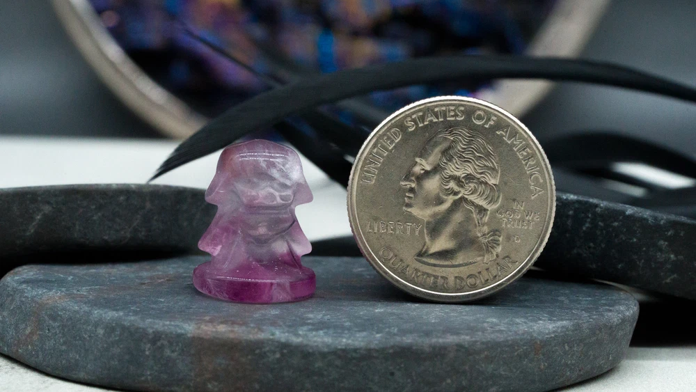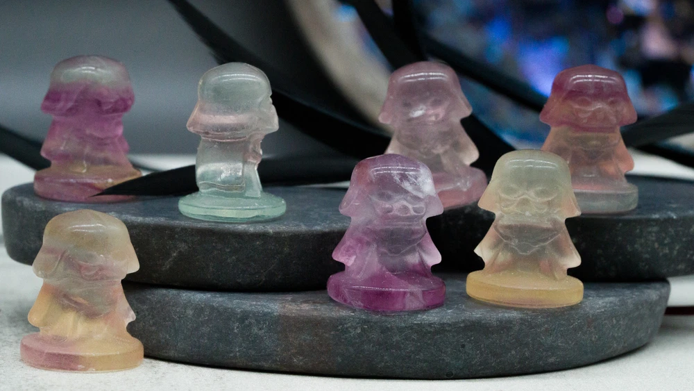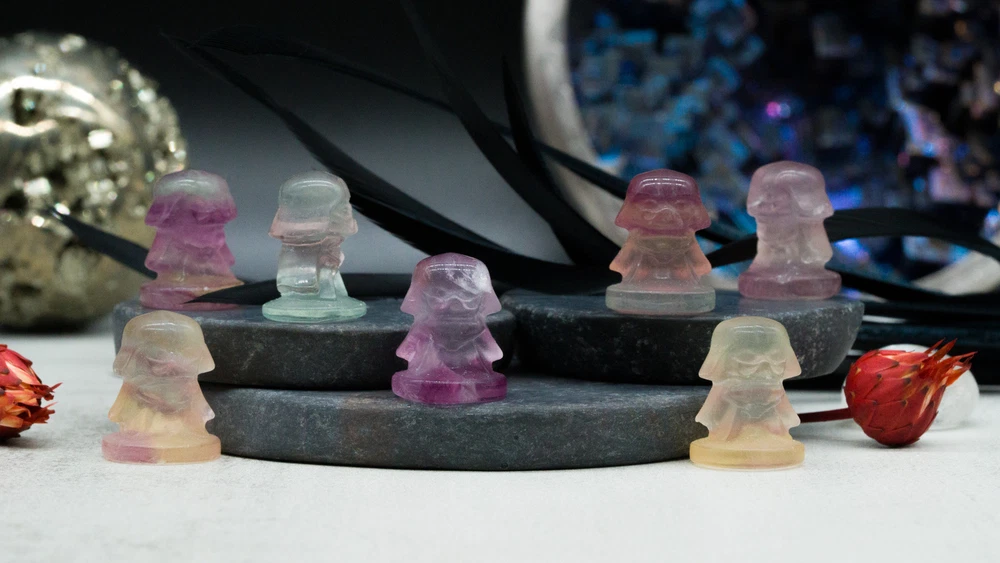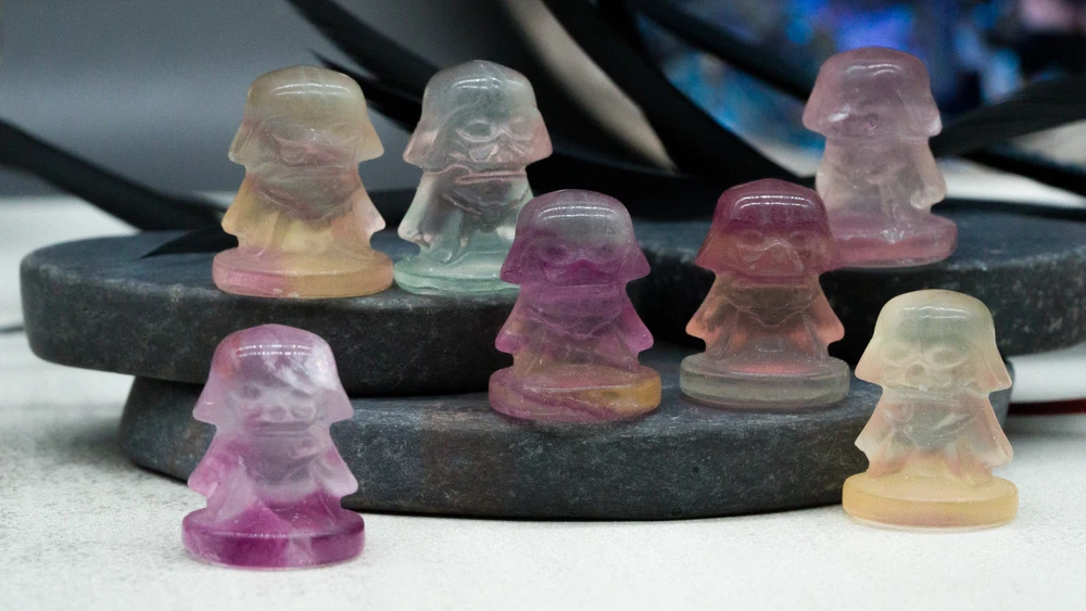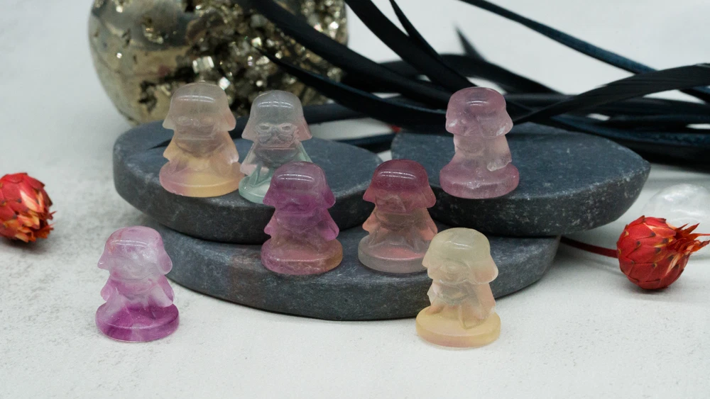 Adorable mini carvings made from 100% natural rainbow fluorite material. You will receive (1) random carving that measures approximately 0.5 x 0.5 x 0.5". Example photo has been provided for approximate size reference. Gems and crystals are great for altars, grids, terrariums, pocket stones, gifts, home decorating, jewelry, collecting and more! They are also wonderful additions to meditation, spiritual, and chakra work. *This listing uses professional photography to provide samples of our collection of products. Each stone is natural, unique and beautiful so please expect slight variations in color, texture, and size. You will receive a product similar to that of the picture, but not the exact product. **Please note that healing crystals are not a replacement for traditional medical treatment and are not meant to replace consulting with a medical professional and do not guarantee any medical cure for any condition. ***This is not a licensed Disney / StarWars product and only features the likeness of the character Darth Vader on a fan art basis.