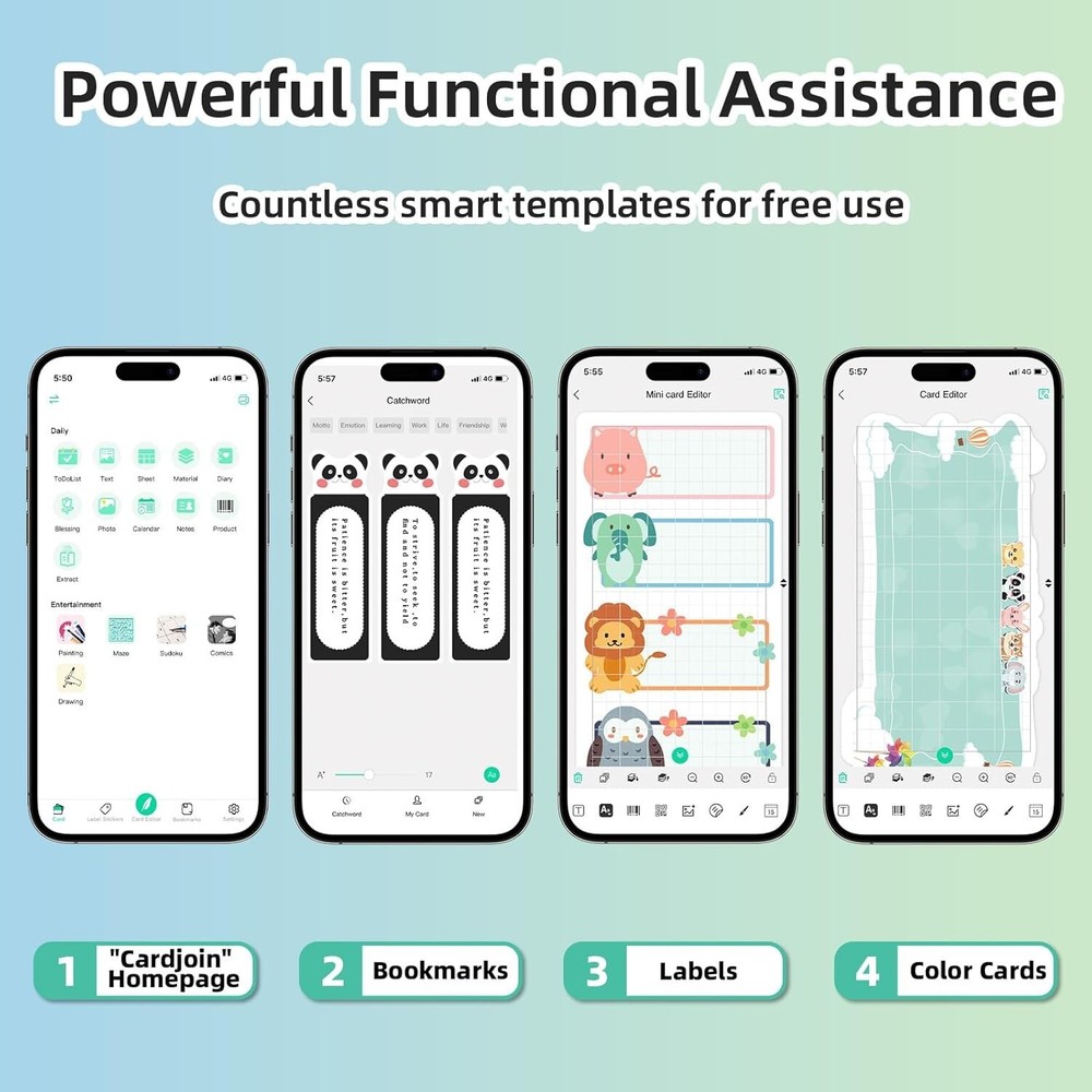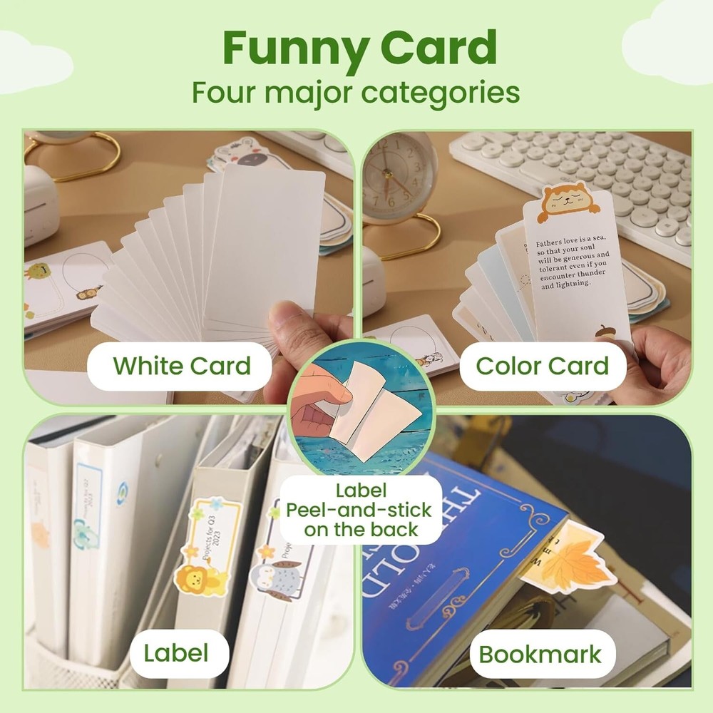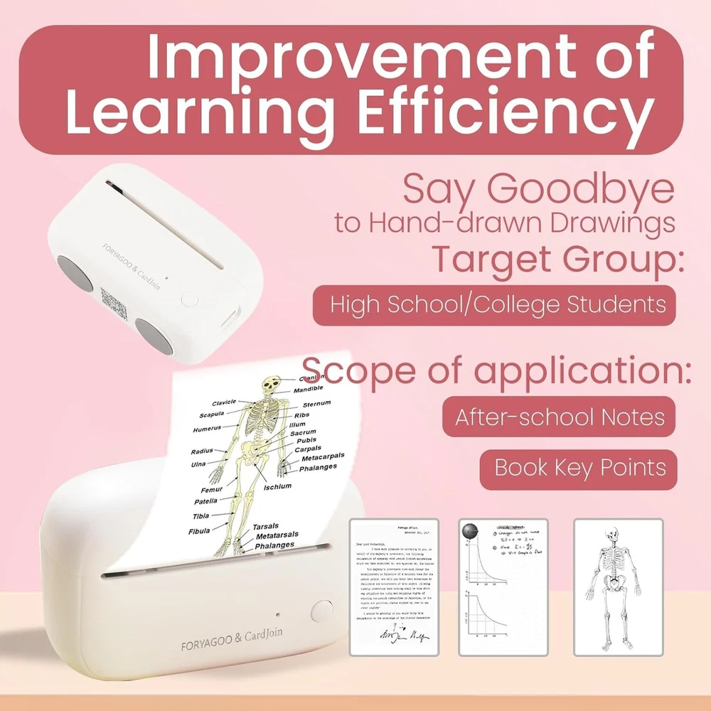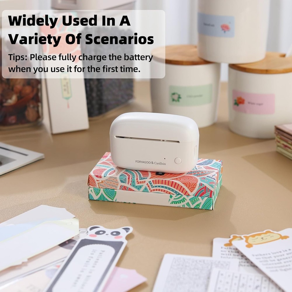 Mini Printer - Portable Sticker Printer Machine, Thermal Printer Label Maker Inkless Pocket Printer Bluetooth Photo Printer for Work, Life, Study Assistance, Tag Receipts, Board Game Cards About this item 【Mini Size, Maximum Convenience】Traditional printers can be bulky and heavy, making it difficult to take them with you on the go. They also require ink cartridges, which can be costly and inconvenient to replace. We want to provide you with a mini printer that is convenient, portable, and produces high-quality prints, all in a compact size. With FORYAGOO, you can say goodbye to bulky printers and experience the ultimate convenience of printing without the need for ink cartridges on the go.FORYAGOO is small and lightweight, measuring only 1.18"D x 3.15"W x 1.96"H Inch, which makes it easy for you to take it anywhere you go. 【Plug-in Card-Type】Existing thermal printers on the market can only print on rolls of paper, the range of printable paper is very limited. Moreover, roll paper is large in size and not portable. After printing on rolled paper, the paper is easy to curl and difficult to store or paste.Adopted the plug-in card thermal printing program. This solution allows us to change the card stock at any time, we can easily insert any form of card stock into the printer, adapting to a variety of scenarios, easy and convenient to operate.CardJoin Mini Printer is compatible with thermal roll paper on the market. 【Print All You Like, In Style 】Our application "CardJoin" supports a wide range of functions including printing photos, labels, messages, lists, records, QR codes, web page printing, OCR text recognition and much more. This means you can print almost anything you want, making it a versatile tool for both personal and professional use. You can unleash your imagination and print in a variety of formats, including cardstock, stickers and bookmarks. In addition, the printer produces high-quality prints with a resolution of 203DPI. The colors won't get dirty or fade over time. You can produce stunning prints that you can proudly display or share with others. 【Versatile Applications,Wide Compatibility】Our mini printer is compatible with Android and iOS. It prints fast and quietly, making it the perfect gift for children, students, teachers, office workers, travelers, or anyone who wants to keep track of their daily life.FORYAGOO is more than just a printer, it's a creative tool that gives you the freedom to express yourself and unleash your imagination.The app is available in multiple languages: English, Spanish, Portuguese, German, French, and Japanese. The OCR (Optical Character Recognition) function allows you to scan and print text instantly. You don't need to manually type notes or take photos of text. With print speeds of up to 90mm/s. 【How To Use】 FORYAGOO mini printer is compatible with IOS and Android phones via Bluetooth connection. Step 1: Download the "CardJoin" app from Google Play or APP Store. Step 2: Connect the printer via Bluetooth in the app. Step 3: Select a quick template and start printing. Product Description