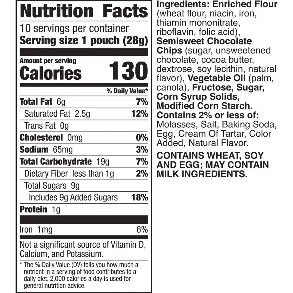Pillsbury Mini Soft Baked Cookies, Chocolate Chip, Snack Bags, 10 Count, 10 oz (Free & Fast Shipping) Product details Soft, sweet, and ready to Eat! Pillsbury Mini Soft Baked Chocolate chip cookies are made with real chocolate chips and have the Perfect soft baked texture. Ideal for kids and adults alike, each portable snack bag delivers all the yumminess you Expect from Pillsbury in bite-sized ready to eat cookies. Pack Pillsbury Mini Soft Baked Cookies as a quick and easy lunch box surprise or on the go treat. Serve them alongside ice cold milk as an after school snack. Add them to make your ice Cream or dessert bar extra special. Hand them out for kids' parties or team treats. However you enjoy these mini soft baked Cookies, Pillsbury makes it simple to savor your favorite cookie flavors. Contains 10 snack pouches. MINI CHOCOLATE CHIP COOKIES: Delicious, mini soft baked cookies made with real chocolate chips; Perfect for the pantry, lunch box, or afternoon snack SOFT BAKED COOKIES: Enjoy your favorite Pillsbury cookie flavors with an irresistible soft baked texture; All the yumminess you expect from Pillsbury in a ready to eat cookie MUNCH ON THE MOVE: Pillsbury Soft Baked Cookies come in portable snack pouches so you can enjoy these convenient snacks on the go INDIVIDUAL SNACKS: Single serve snack pouches make ideal team treats or kids party snacks; A sweet addition to any care package or food gift basket CONTAINS: Pillsbury Mini Soft Baked Cookies, Chocolate Chip, Snack Bags, 10 Ct, 10 oz More details Flavor Chocolate Chip Texture Soft Baked Shelf life 279 days Cookie type Chocolate Chip Cookies Food condition Shelf-Stable Bakery toppings type Chocolate Chip Count 10 Ingredients Ingredients Enriched Flour (wheat flour, niacin, iron, thiamin mononitrate, riboflavin, folic acid), Semisweet Chocolate Chips (sugar, unsweetened chocolate, cocoa butter, dextrose, soy lecithin, natural flavor), Vegetable Oil (palm, canola), Fructose, Sugar, Corn Syrup Solids, Modified Corn Starch. Contains 2% or less of: Molasses, Salt, Baking Soda, Egg, Cream Of Tartar, Color Added, Natural Flavor. Active Ingredient Name Enriched Flour (Wheat Flour, Niacin, Iron, Thiamin Mononitrate, Riboflavin, Folic Acid), Semisweet Chocolate Chips (Sugar, Unsweetened Chocolate, Cocoa Butter, Dextrose, Soy Lecithin, Natural Flavor), Vegetable Oil (Palm, Canola), Fructose, Sugar, Corn Syrup Solids, Modified Corn Starch, Contains 2% or Less of: Molasses, Salt, Baking Soda, Egg, Cream of Tartar, Color Added, Natural Flavor.