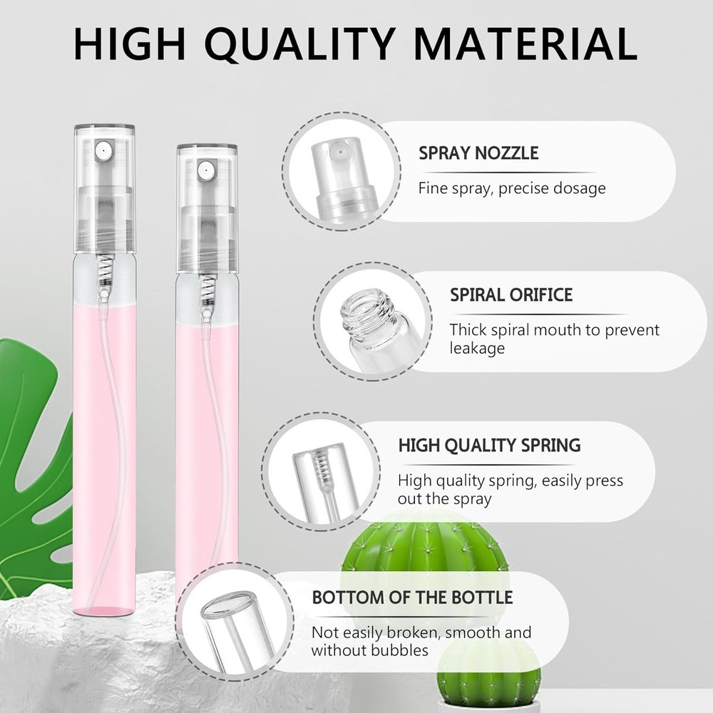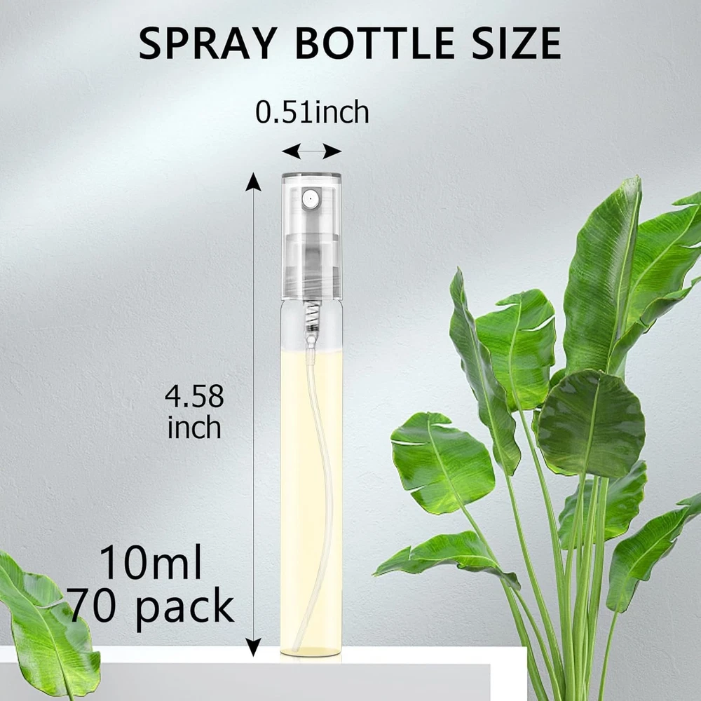 Product Features Color Clear Material Glass Capacity 10 Milliliters Recommended Uses For Product Cleaning, Make Up, Perfume, Water About this Item PACKAGE INCLUDED: Each package includes 70pcs of mini spray bottles. Such a huge quantity of perfume atomizer can satisfy your daily sample use needs, let you away from the cumbersome bottles and cans, make you more convenient and safe package. RELIABLE QUALITY: These perfume bottles are made of high quality glass, sturdy, durable, high strength, refillable, wear-resistant and smooth surface. Compared with other materials, the glass material is more stable and can better store your perfume or essential oil in our atomizer spray bottle. Just feel free to use this glass atomizer. LEAK PROOF AND PORTABLE: These mini atomizer adopt a leak proof design, have thread and seals, can effectively avoid leaking. The empty spray bottle has a mini size and is very portable. You can put these mini spray bottles into your pocket, purse, bag or hold it in your hand without worrying about the leakage, suitable for you to use in your travel, business trip, gym and so on. WIDELY APPLICATION: Refillable perfume bottles are suitable for storing your favourite perfume, essential oils, fragrances, facial mist and so on. Refillable atomizer is also the ideal container for sample making. You can make your own scent and share it with your family and friends. Using these atomizer spray bottles will bring a lot of convenience to your life. CUSTOMER SUPPORT: If you have any usage problems with our perfume bottle that cannot be solved, please don’t hesitate to contact us for help. Customer’s satisfaction with bottle is first to us. We will reply to you immediately to solve your problem and give you a satisfactory answer. Make sure to provide you with a great service with our glass atomizer. Description Package Include Quantity: 70 x Mini Spray Bottle Size: 4.58inch*0.51inch ( 11.6cm*1.3cm ) Colour: Transparent Material: High Lead Glass Mini Spray Bottle These mini cute perfume spray bottles are very suitable for perfume samples. It is also suitable as a gift for your friends. Product Details Product Dimensions : 0.22 x 0.22 x 1.79 inches; 1.63 Pounds