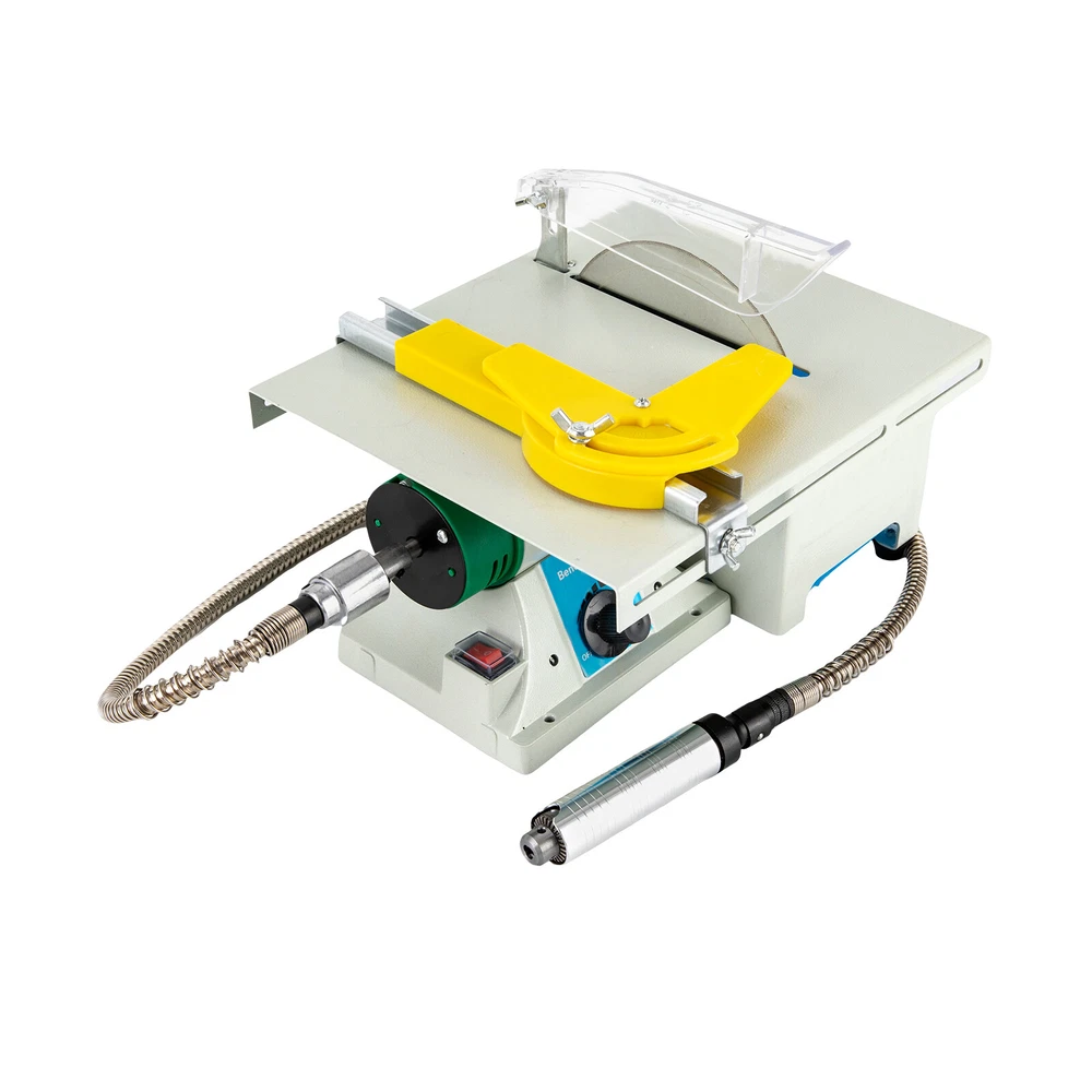 Mini Table Saw Jewelry Rock Polishing Machine Bench Grinder Polisher Table Saw Mini Table Saw Jewelry Rock Polishing Machine Bench Grinder Polisher Table Saw Description If you enjoy making jewelry and like polished stones, a grinder can be a very flexible and versatile tool. This table grinder that can handle a variety of heavy grinding tasks is your ideal choice! It helps you complete polishing and cutting work faster and better through variable speed, high-power motors, and a variety of accessories, making itself a great helper for you! Key Features 5-in-1 Bench Grinder: Comes with a jade saw blade, a woodworking saw blade, a fiber wheel, a flexible shaft, a carving handle, a drill chuck, and other accessories, this bench grinder allows for polishing, cutting, polishing, grinding, and carving. Therefore, you can create various decorations yourself. High Efficiency: With a 750W pure copper motor and infinitely adjustable speed(800-10000rpm) through the control knob, this product has high efficiency to meet your cutting, grinding, carving, punching, and polishing needs. Additionally, the 6" saw blades allow for 0.39in cutting depth. Durable and Sturdy: The premium aluminum, nylon, and steel materials and plastic spraying process give this product high stability, durability, high strength, and wear resistance , together with the pure copper motor and elongated&thickened bearings, making it maintain good performance for a long time. Lightweight and Portable: It is compact (11.4*8.66*9.25 inches) and portable (12.1 pounds), making it easy for you to take it to the place you need for various polishing tasks. High Stability: The aluminum base with non-slip rubber feet can effectively alleviate vibration and avoid scratching the countertop. The mounting holes and angle brackets allow for further fixation on the workbench, which helps to mitigate the potential damage caused by vibration to items to be cut or polished. Safe to Use: The main switch and saw blade are protected by an outer shell, which not only prevents dust and water from entering critical components but also effectively prevents accidents. The overheating protection function makes the machine less susceptible to overheating. The sink can effectively cool the machine and be waterproof , making your work safer. Complete Accessories: The complete installation accessories such as carbon brushes, chuck&handle keys, grinding wheel&saw blade connecting rods, and practical tools needed during work such as fiber wheel and flexible shaft save you cost and time without additional tedious purchases. Flexible Angle Ruler: Its operating table is equipped with a prominent yellow angle ruler, which can not only adjust the angle of the material to make your work more precise but also be used to push the material without touching the saw blade, making it safer. Good Clamping: The drill chuck has a precise clamping range(0.06-0.4"), making it suitable for polishing more items of different sizes while reducing deviation to the maximum extent. Easy to Maintain: You can use flat head screws to unscrew the carbon brush cover and replace the carbon brush, extending its service life. Details Practical Basket: It can be installed below the cutting saw blade, which can help you collect the cut waste and debris and keep your desktop clean. Ideal Handle: The 5.24-inch long carving handle provides a comfortable grip, and its three-disc chuck has good stability, helping you complete your work better. Long Power Cord: The approximately 4.92ft power cord allows you to have plenty of disposable lengths, thus reducing the limitation when you use it. Application It is suitable for carving, polishing, and drilling of jade, agate, metal, wood, etc. It is also suitable for manual polishing, grinding, and cutting of beads, bodhi, and various DIY materials. Specifications Power: 750W Voltage: 110V Speed: 800-10000rpm Blade Size: 15cm/6in Color: White, Yellow, Blue Style: Angled Plug: US-Standard Material: Aluminum, Copper, Nylon, Steel, Rubber Surface Treatment: Plastic Spraying Flexible Shaft Clamp Size: 4mm/0.157in Drill Chuck Range: 1.5-10mm/0.06-0.4in Cutting Depth: 0-10mm/0-0.39in Power Cord Length: About 1.5m/4.92ft Installation Required: Yes Number of Items: 1 Gross Weight: 6kg/13.2lbs Net Weight: 5.5kg/12.1lbs Table Size(L*W): 26.5*22cm/10.43*8.66in Product Size: 29*22*23.5cm/11.4*8.66*9.25in Package Size: 36*29*23cm/14.17*11.41*9.05in Package Included 1*Table Grinder 1*Goggles 1*Angle Ruler 1*Basket 1*Flexible Shaft 1*Flexible Shaft Handle 1*Drill Bit Clamp 2*Saw Blades 5*Grinding Heads 1*English Manual All Accessories for Assembly Notes Please note this tool should be grounded while in use. Please always wear proper eye and face protection devices such as safety glasses and face shields(not included). Please do not wear loose clothing or jewelry. Please tie back your long hair. Before use, please check each attachment for cracks or defects, and do not use any damaged, loose, vibrating or unbalanced accessories, or any attachments that are higher than the maximum rated speed of the machine. Please always insert the shank or arbor of an accessory or mandrel into the collect(or collet holder chuck or chuck arbor) as far as possible to provide proper support. Please tighten the collet or chuck securely. Please do not use excessive side pressures which may tend to bend or break the shank or arbor or an accessory. Let the speed of the accessory do the work. Please do not install the motor by jamming or using excessive pressure on the polishing wheel, buff, wheel, or other accessories. This can result in damage to the motor. Please do not operate your power tool during a perceptible power decreases. Please turn the power tool off and do not use it until power is fully restored. Please read the operating manual completely before use. And pay particular attention to the safety instructions included. Please allow the slight color difference caused by the shooting light