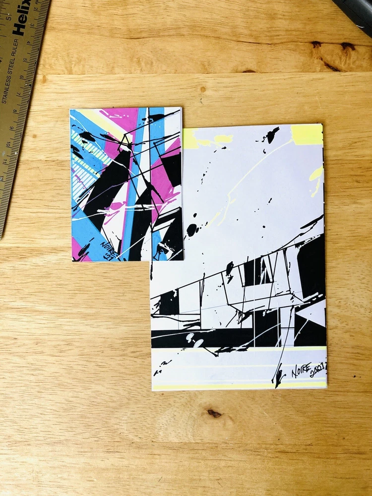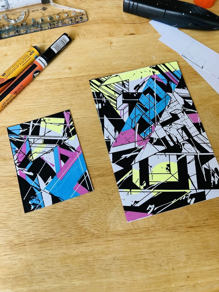 Mini graphic abstract artworks created on paper! Typographical elements combined with graffiti influences created on paper. Bundled deal – 2 pieces available for purchase, sizes are as followed: 4 X 6in and 2.5 X 3.5in. Shipped with USPS Priority Mail.