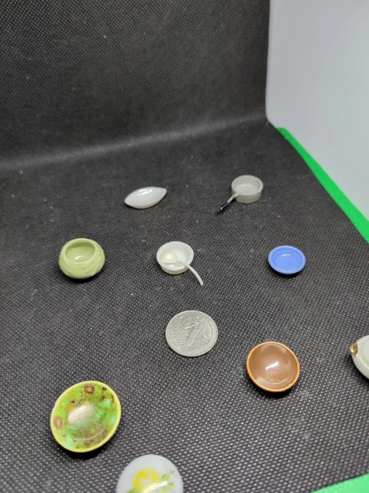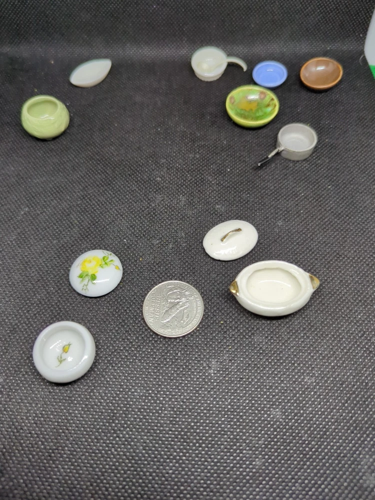 This lot includes 13 assorted kitchenware items perfect for decorating a miniature dollhouse kitchen. From tiny cooking utensils to decorative dishes, these accessories add a realistic touch to your dollhouse kitchen setting. Ideal for collectors or hobbyists looking to enhance their miniature world with charming details. 542