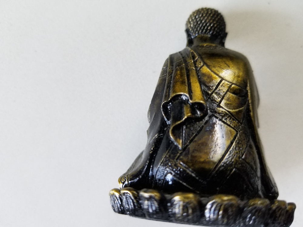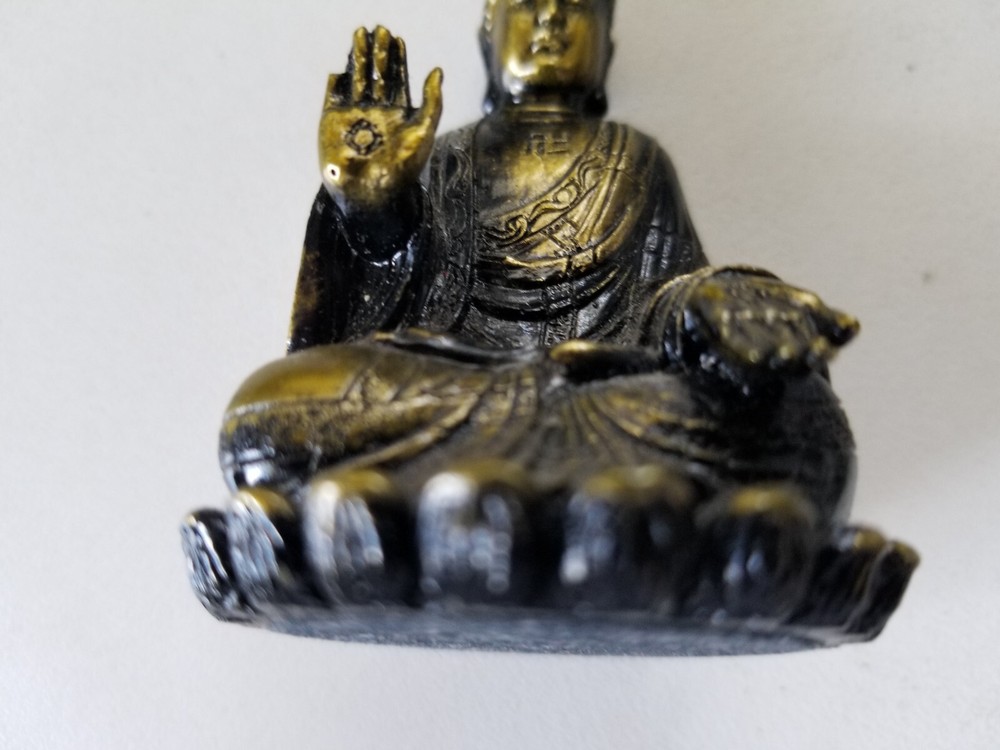 This miniature Buddha figurine is a majestic and intricate decoration piece that will be a wonderful addition to your collection. It is made of high-quality resin and sports a glorious gold tone that is sure to give it a regal appearance. Measuring 2.5 inches, the figurine is perfect for display on a shelf or tabletop, making it an excellent gift for any Buddhist art enthusiast. Very good preowned condition with no flaws. Please view photos.