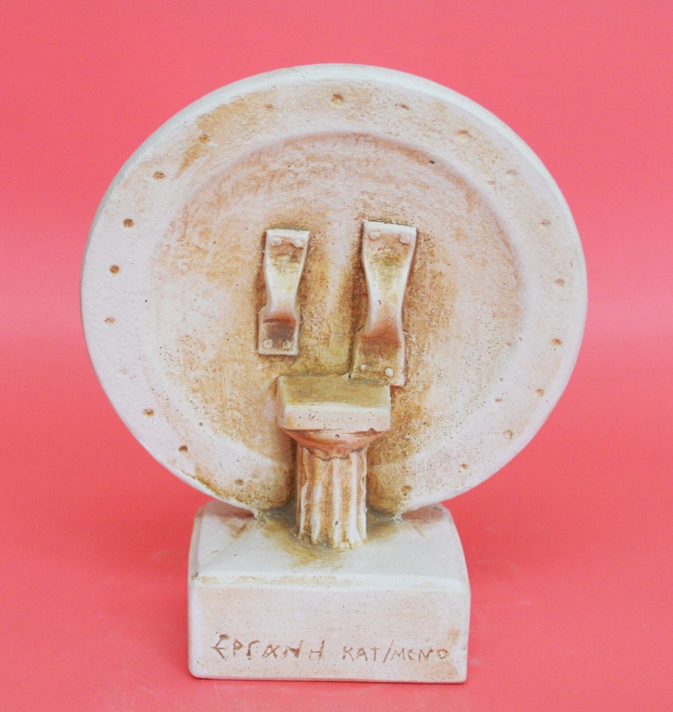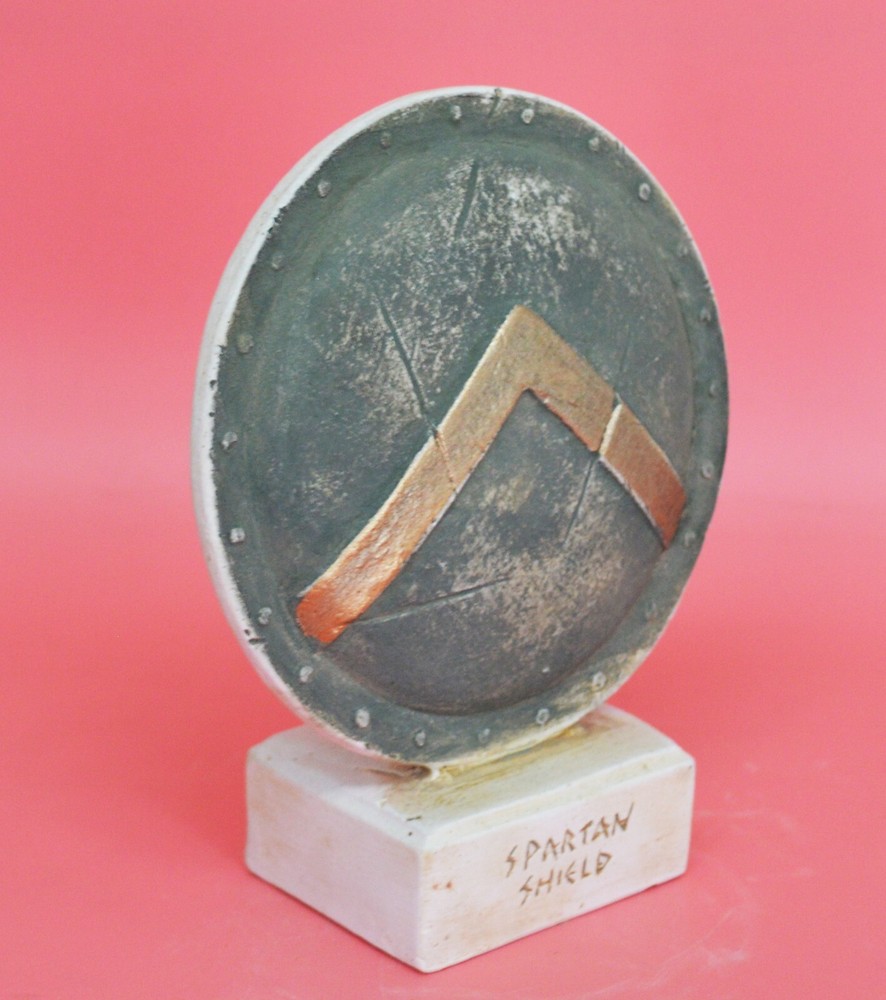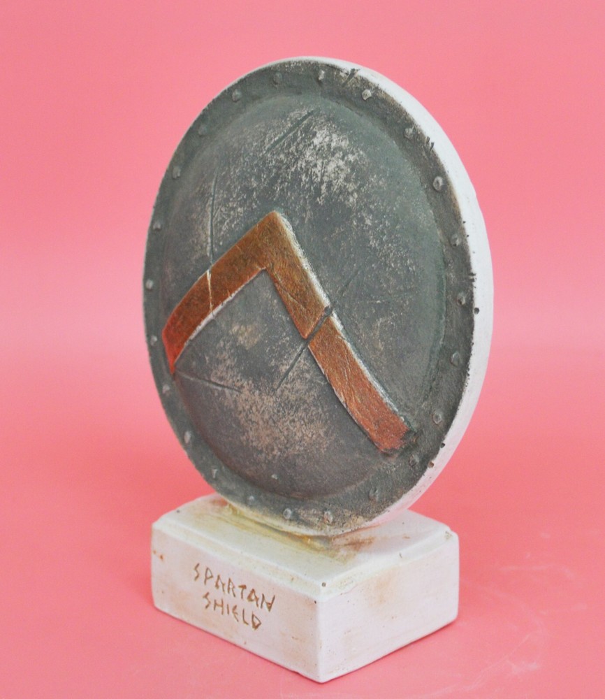 KING LEONIDAS SMALL SHIELD Leonidas the Brave was a Greek hero-king of Sparta, the 17th of the Agiad line, third son of Anaxandridas 2 of Sparta who was believed to be a descendant of Heracles, possessing much of the latter's strength and bravery. Leonidas(died 480 BC) stand against the invading Persian army at the pass of Thermopylae in central Greece is one of the enduring tales of Greek heroism, invoked throughout Western history as the epitome of bravery exhibited against overwhelming odds. The Spartan army stood at the centre of the Spartan state, whose citizens' primary obligation was to be good soldiers. Subject to military drill from infancy, the Spartans were one of the most feared military forces in world history. At the height of Sparta's power – between the 6th and 4th centuries BCE – it was commonly accepted that, "one Spartan was worth several men of any other state." Please be aware that, due to the fact that our products are either individually cast, carved, hand painted and hand finished, there will inevitably be minor variations in size, colour and texture.(B53) Details: Condition: New, Handmade in Greece Material: Casting stone Diameter of shield: 11 cm(4.3 inches) Height on base : 14 cm(5.5 inches) Weight : 260 g