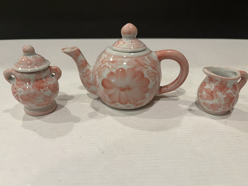 The product is a set of three small miniature porcelain items - a teapot, pitcher, and sugar bowl, all adorned with a red floral pattern. The style is Victorian, and they are part of a trinket box collection. The material is porcelain with a painted finish. These decorative collectibles are perfect for all occasions and would make a charming addition to any collection or display.