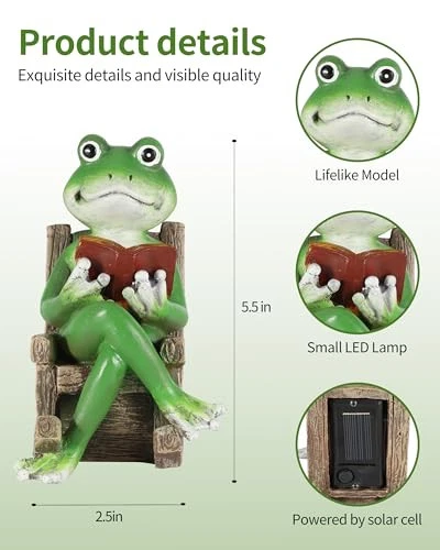 30 Days Return Policy Fast Delivery Trusted seller Miniature Solar Frog Reading Book Figurine Light - 5.5'' Resin Chair Statue Outdoor Table Decor for Lawn Ornaments, Patio, Yard & Garden and Home Product Description ? Solar Garden Lights: Illuminate your outdoor area with the soft, warm glow emitted by the small yet powerful built-in LED lamp in the book. ? Reading Book Motif: The adorable solar frog decor is depicted reading a book, adding an element of whimsy and education-inspired aesthetic to your garden or patio. ? Perfect Gift Idea: An ideal present for garden enthusiasts, book lovers, or anyone who appreciates unique and charming outdoor décor. ?️ Weather-Resistant: Made with durable polyresin materials to withstand various weather conditions, ensuring longevity and consistent performance. ? Free Installation: No wiring or external power source required; simply place it in a sunny location and enjoy the enchanting light display from dusk till dawn. Shipping Returns Payment Shipping Shipping is FREE to all addresses other than APO/PO boxes in the lower 48 states. All our stock ships from US-based warehouses. Shipped via USPS or UPS (depending on location and package weight) Unless stated otherwise, all orders will ship within 24-72 hours of your payment being processed. Check our feedback to see the great reviews of FAST shipping we offer. Returns As our valued customer, we will do our best to make sure the product you receive arrives to you on time and as expected. If you are not satisfied with your purchase, please contact us within 30 days of receiving your order to process a return. Payment We currently accept payment via eBay managed payments only. Once payment is cleared, we will dispatch your shipment within 1-3 business days. Please refer to the "Shipping" tab for more information regarding shipping speed to your destination.