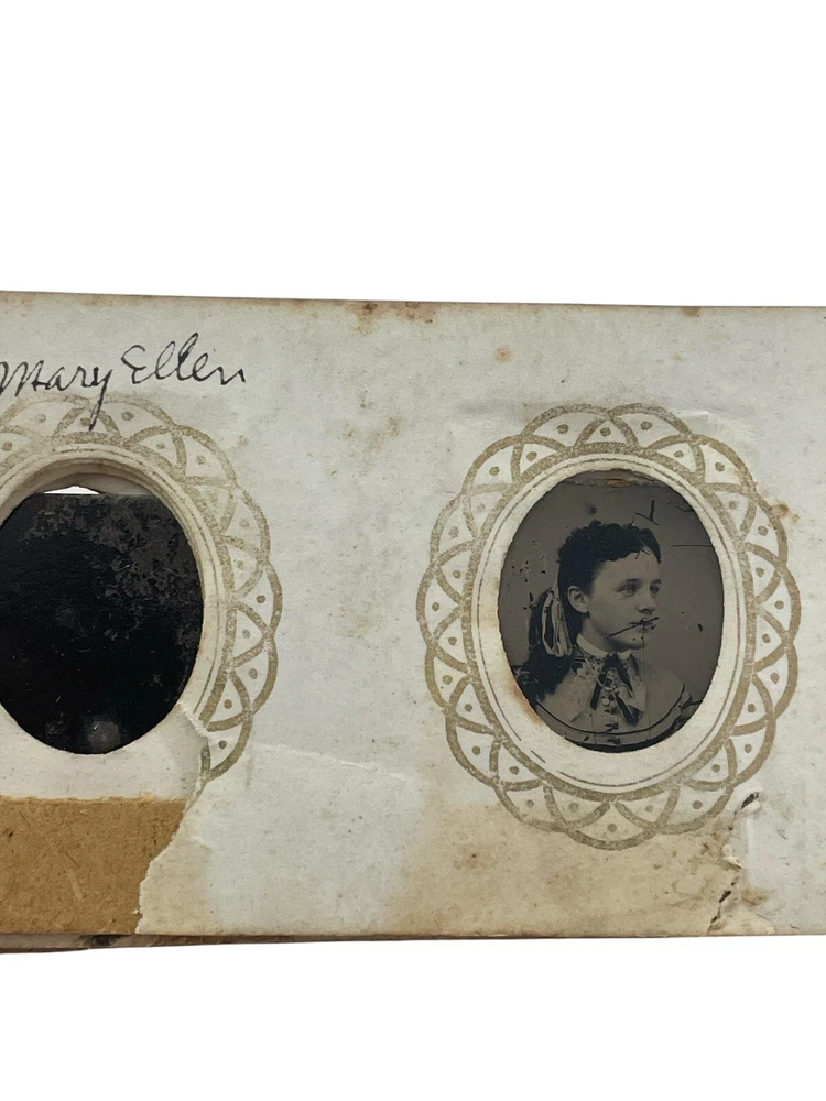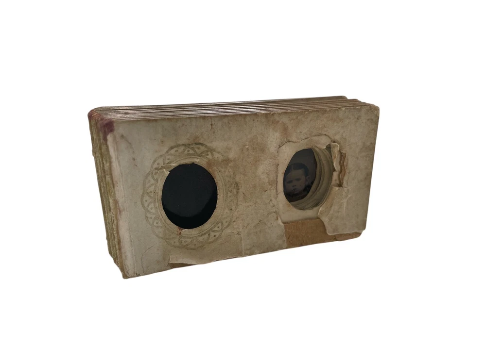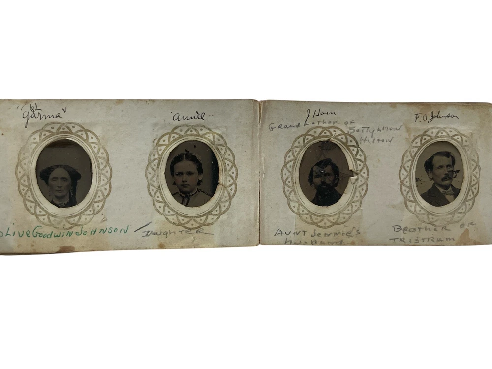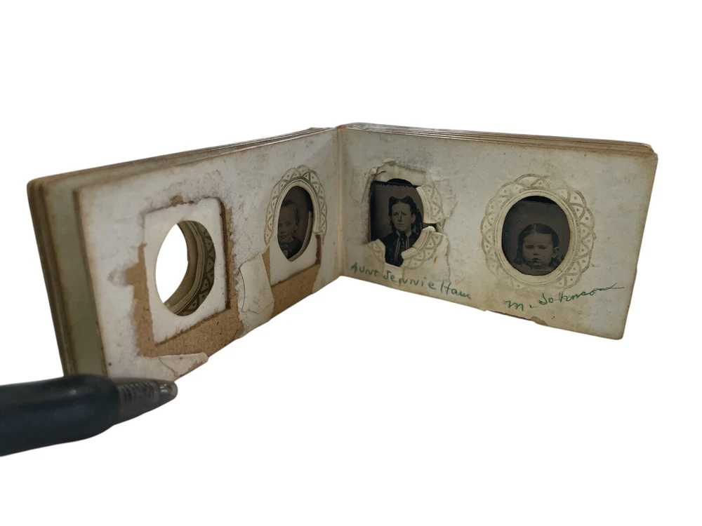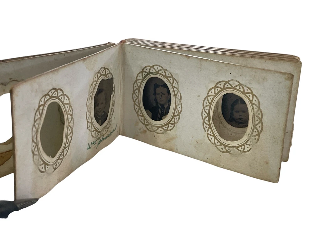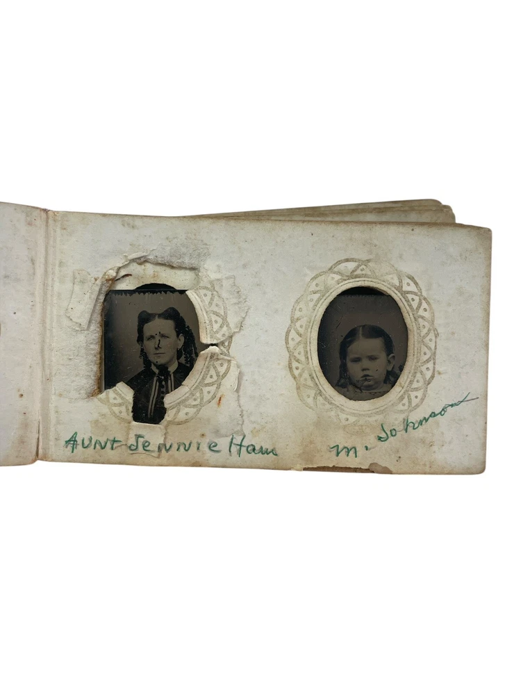 Step back in time with this exquisite collection of 10 tintype photographs, each a miniature Victorian album capturing the essence of an era. The images, measuring 3" x 2" x 1", are original pieces dating from 1850-1899, offering a glimpse into the past through the classic portrait orientation and black & white imagery. The metal material and satin finish lend a timeless charm to these keepsakes, reflecting the craftsmanship of the period. Photographed by the notable Abr Tabor & Bro New Bedford MA, these tintype treasures are a testament to the artistry and heritage of American portraiture. Unframed, they remain a raw and authentic piece of history, perfect for collectors and enthusiasts of vintage memorabilia. Each photograph stands as a unique portrait of the bygone days, inviting you to own a slice of the 19th-century legacy. album is missing front and back, just the inside pages of the album half filled with mini tintype photos, the photos have the name of the family members below