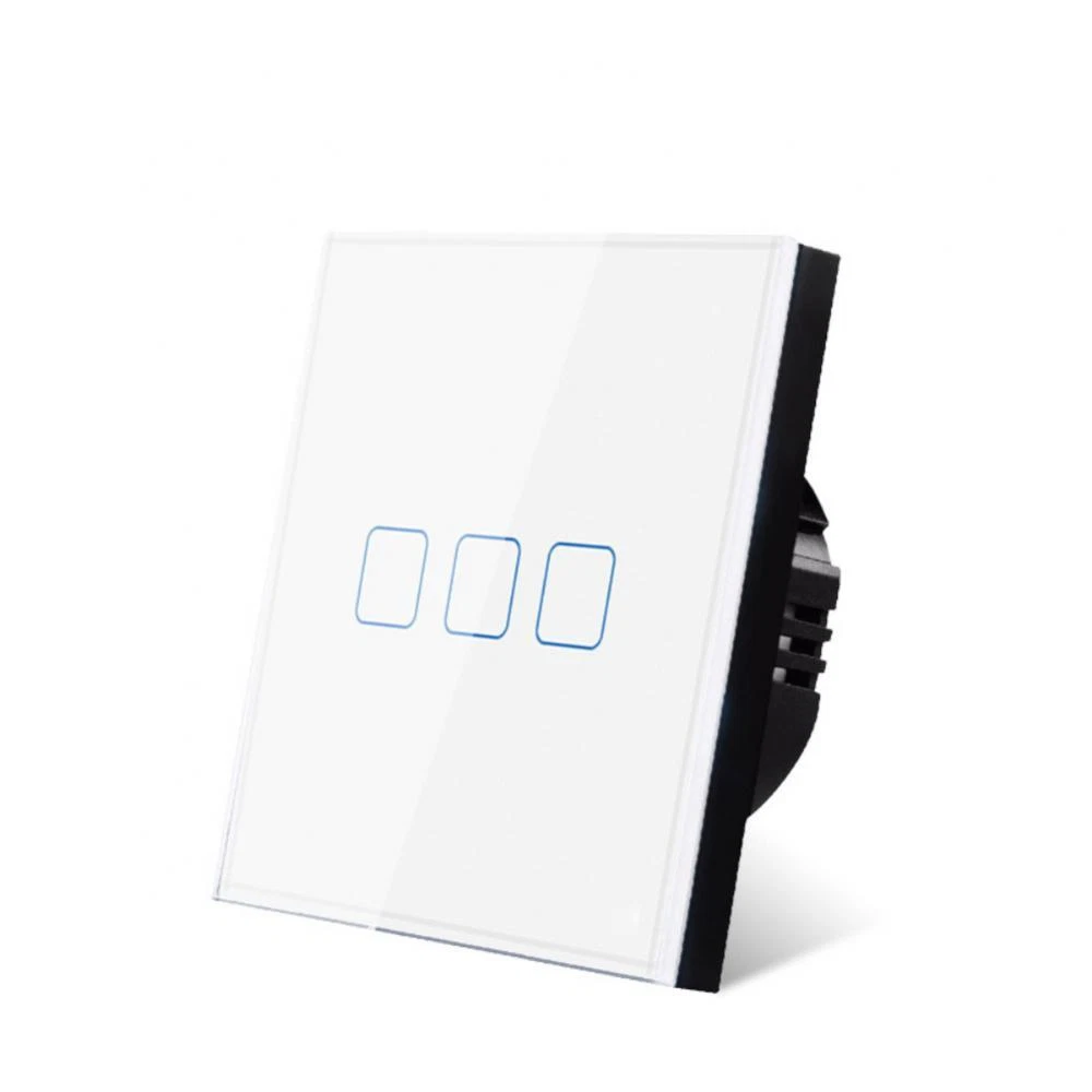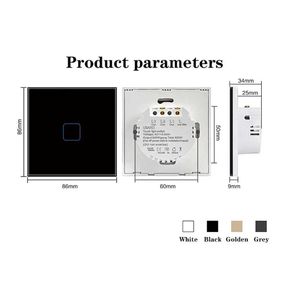 Minitiger 4 Colors Crystal Glass Panel EU/UK Standard 1/2/3 Gang WIFI Touch Switch Tuya app Control Light Wireless Wall Switch Description: Product name: touch switch Standard: European regulation/UK regulation/Australian regulation Product size: 86*86*34mm Control mode: single fire wire control Input voltage: 100-240Vac 50/60Hz Output power: output 5-300W/Gang Led: 5-150W/gang How it works: Manual touch Touch life: 100,000 times Working environment temperature: -20~55 degrees, relative humidity 95% Standby power: less than 0.5 watts Indicator color: light on - red, light off - blue Panel material: tempered glass panel Bottom box material: PC ABS fireproof plastic Panel Color: White, Black, Gold, Gray Product net weight: 1gang 112g/2gang 116g/3gang 120g Applicable lamps: bulbs, incandescent lamps, LED lamps, halogen lamps, energy-saving lamps, etc. Specifications: LED indicator: Soft LED indicator, easy to find the position of the switch in the dark, but zero impact on sleep. Red light on, blue light off. Tempered Glass: The switch is made of high-quality tempered glass material for extraordinary enjoyment, with impeccable wear and scratch resistance. Using capacitive technology (the same principle as today's touch-screen mobile phones), it is sensitive to touch. Waterproof and easy to clean: not afraid of oil pollution, waterproof, glass panel is easy to clean; fully sealed panel, wet hands can touch the switch, safe and convenient. Package Included: The package includes: 1*Glass panel switch 2*Screw 1*English user manual
