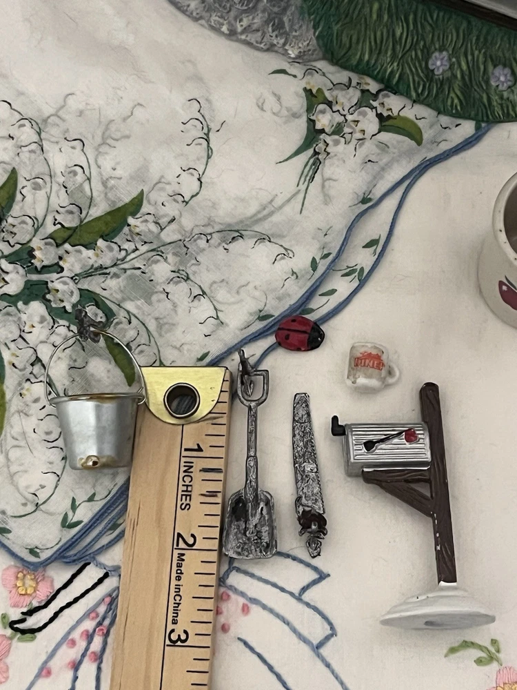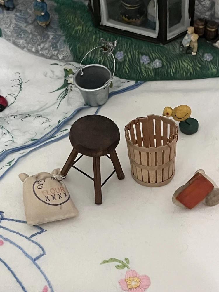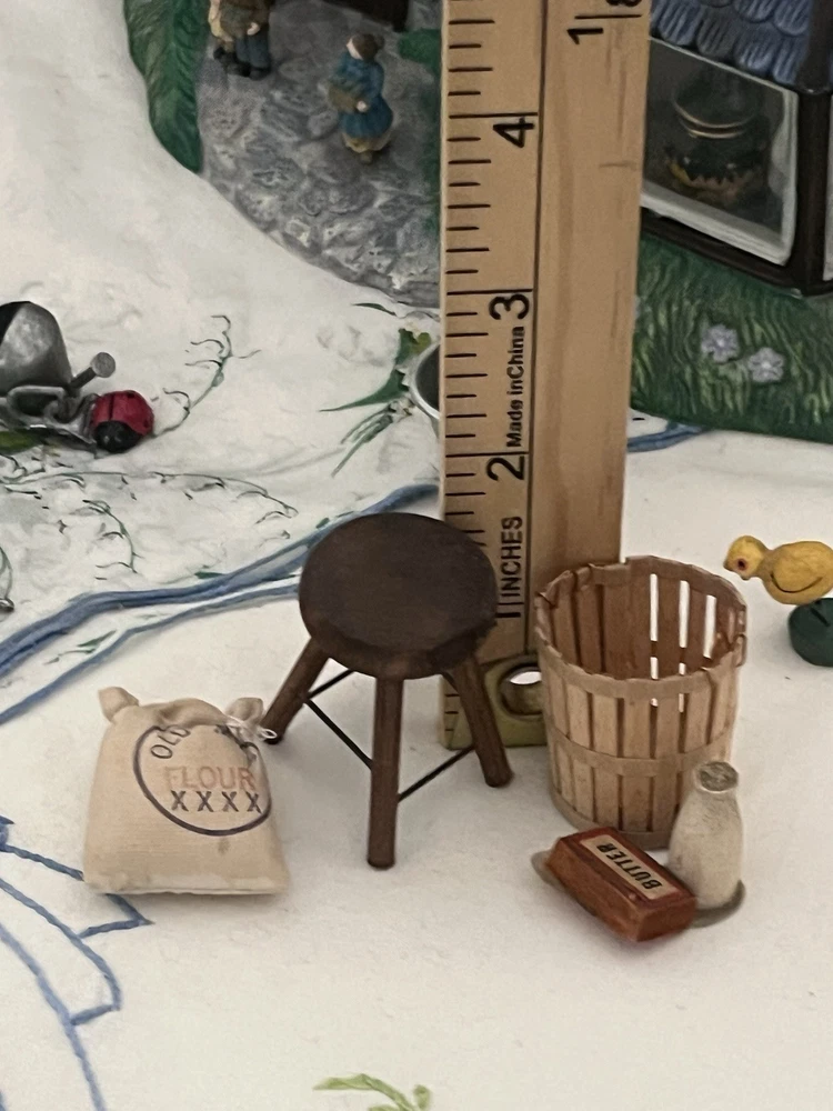 The red wagon is too cute this is made of metal and has the handle. The little tools and bucket could also be hung as you will see they look like on a hook. Theres a little water can, basket, apple crock and more. Yes that is a tiny coffee cup a farmer needs his caffeine. The little milk stool is wooden. I really don’t know scales why photos by ruler. I just use as displays and scenes. Please see all photos for details part of the item descriptions. You will receive all. I also have more of the feed sakes sold in another lot. Also really old chickens made of wood. Please ask any questions all sold as is and all sales finale. Comes from clean smoke free home. Thanks Does not included decor in background or vintage textiles shown on.