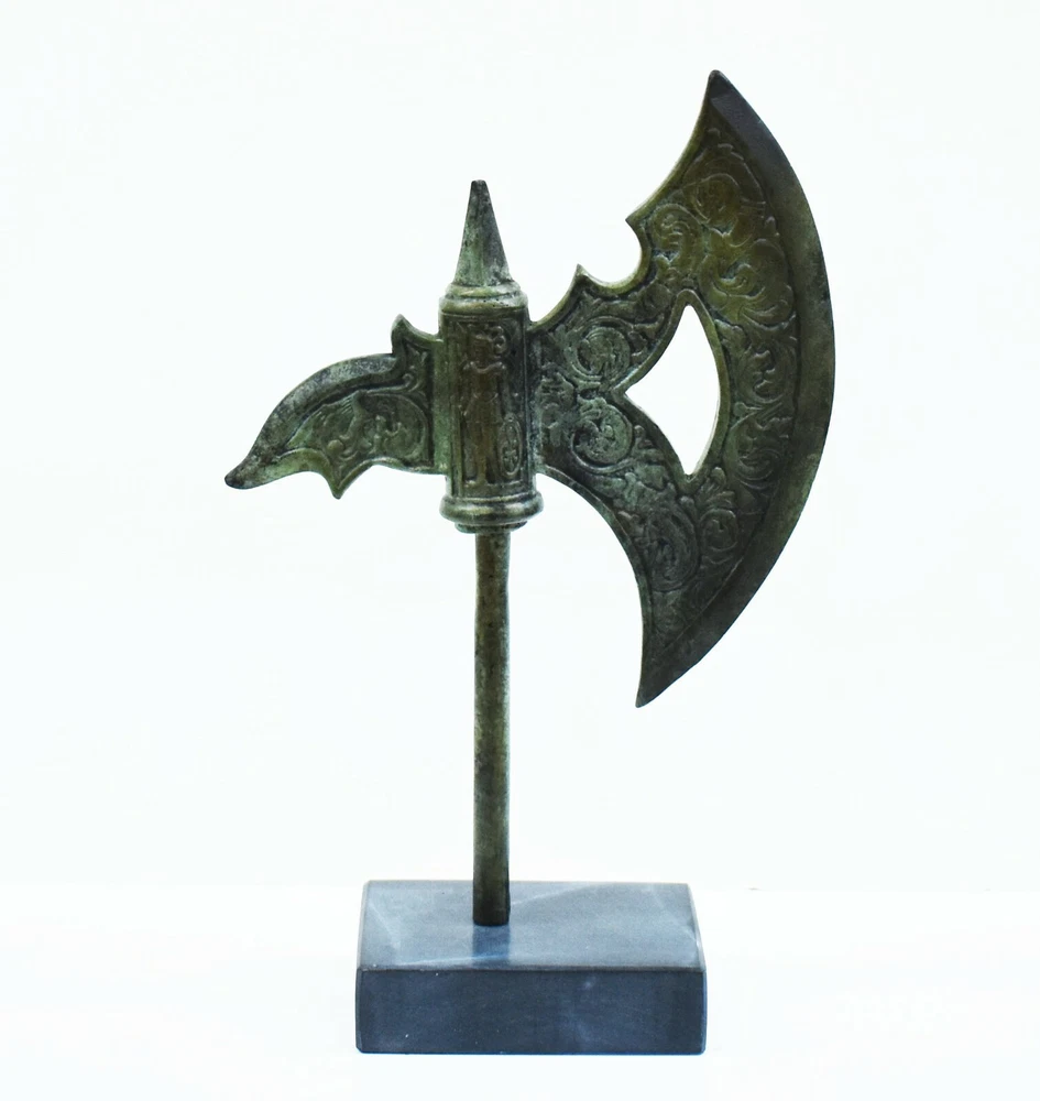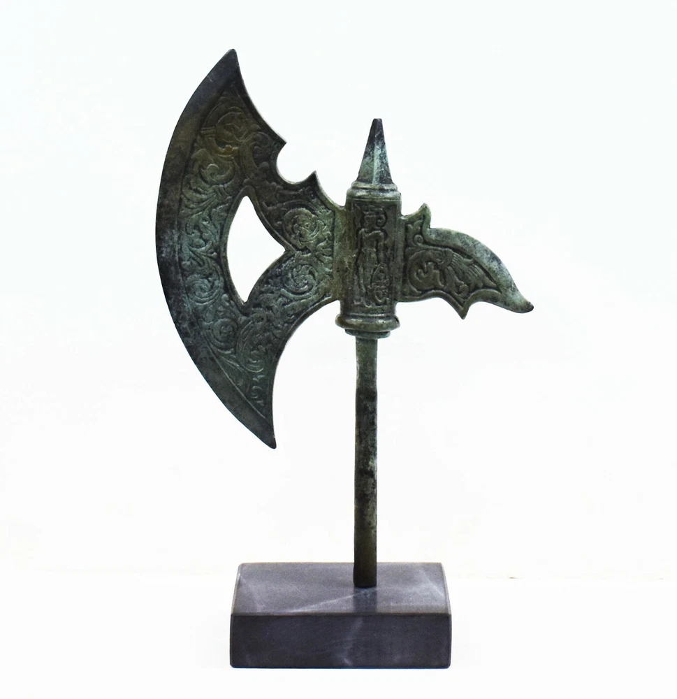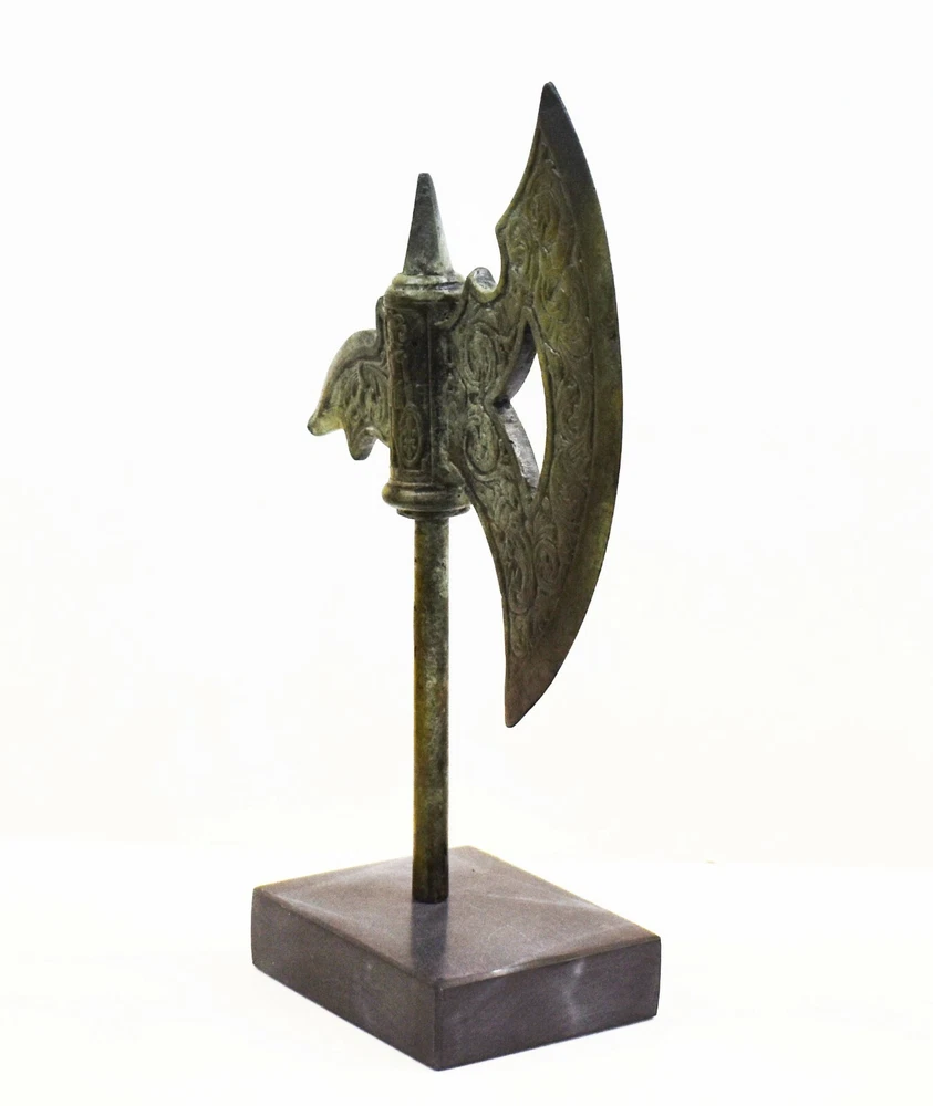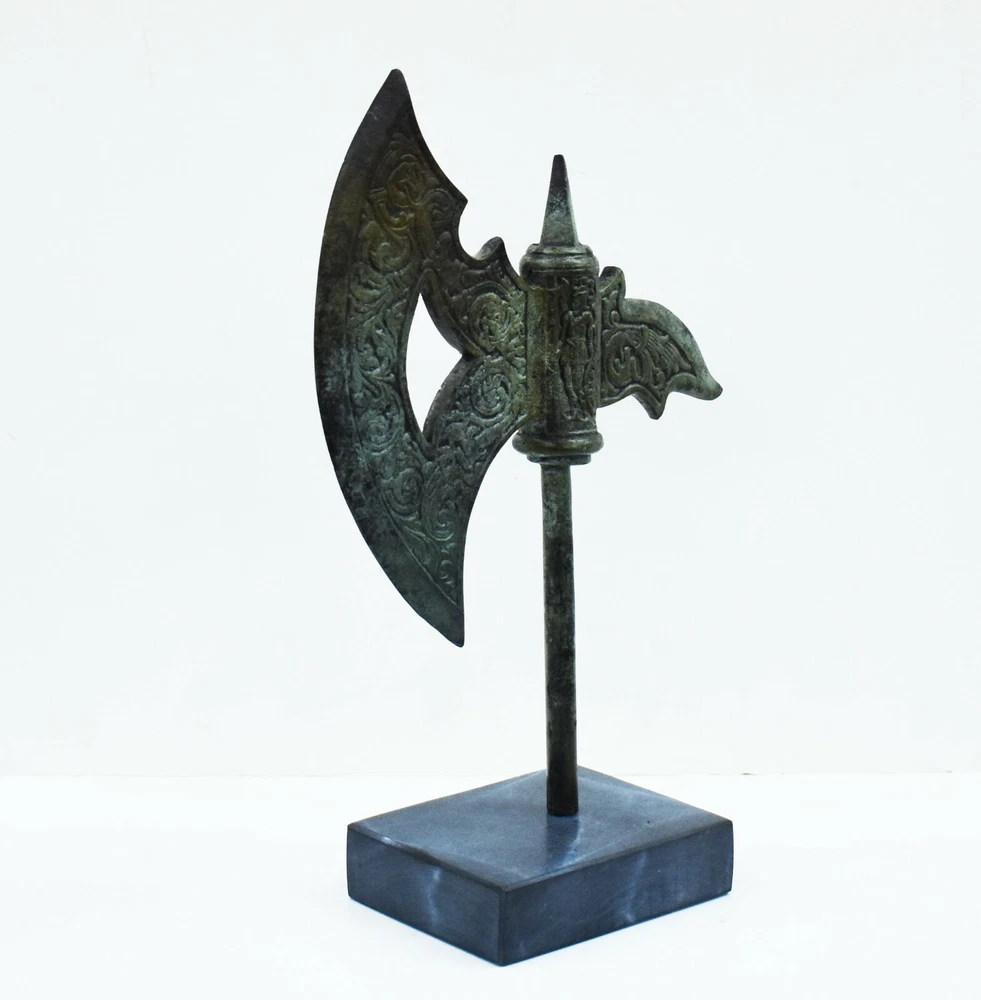 MINOAN PERIOD BRONZE AXE From around 2700 to 1450 BC, the Minoan civilization flourished as a seafaring and mercantile culture. The Minoan civilization developed and reached its Reyday on the Island of Crete. The center of this civilization was the palace of Knossos, which is one of the most important archaeological discoveries of the Greek history. All our bronze items, are cast in Greece, using the traditional 'lost wax' method. As nothing is mass-produced, there will inevitably be slight variations in patination and colouring. Each piece is, therefore, unique.(25-632-A) Details: Condition: New, Handmade in Greece Material: Pure Bronze Height: 31 cm(12.2 inches) Width : 19 cm(7.5 inches) Weight : 2 kg
