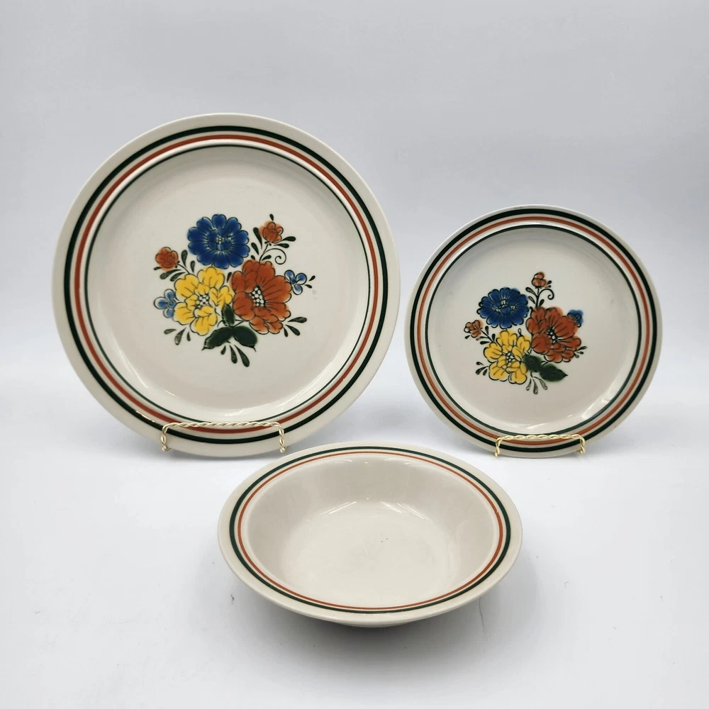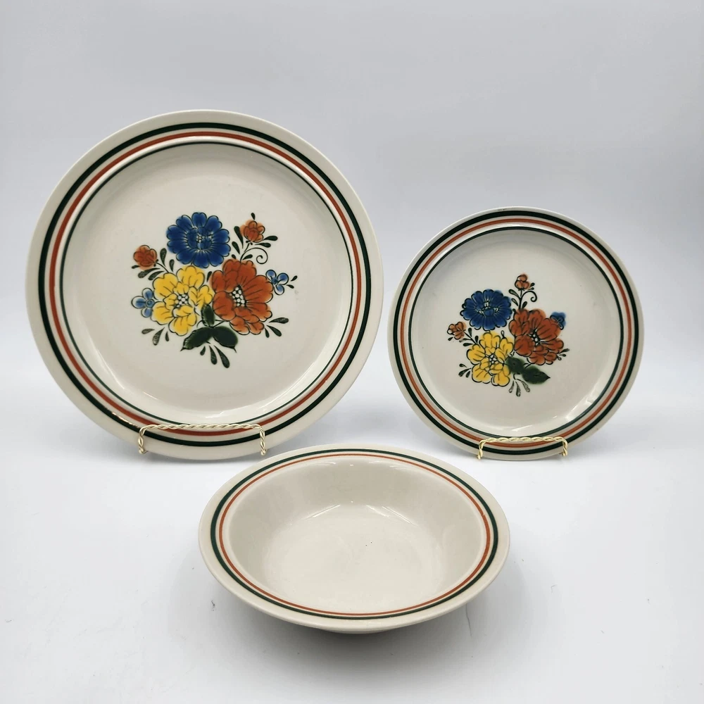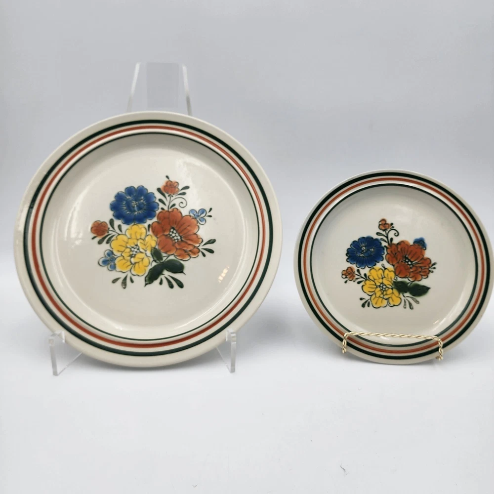 The Mioko Newcor Designer Collection 151 is a vintage set of dinner and salad plates and bowls. Made in Japan in the 1970s; these stoneware items are durable and in excellent condition. These pieces are microwave, oven, and dishwasher safe. The plates feature a hand painted mid-century design of colorful flowers. There are 3 selections for purchase: 6 dinner plates measuring 10.5" 7 salad plates measuring 7" 4 bowls measuring 7"
