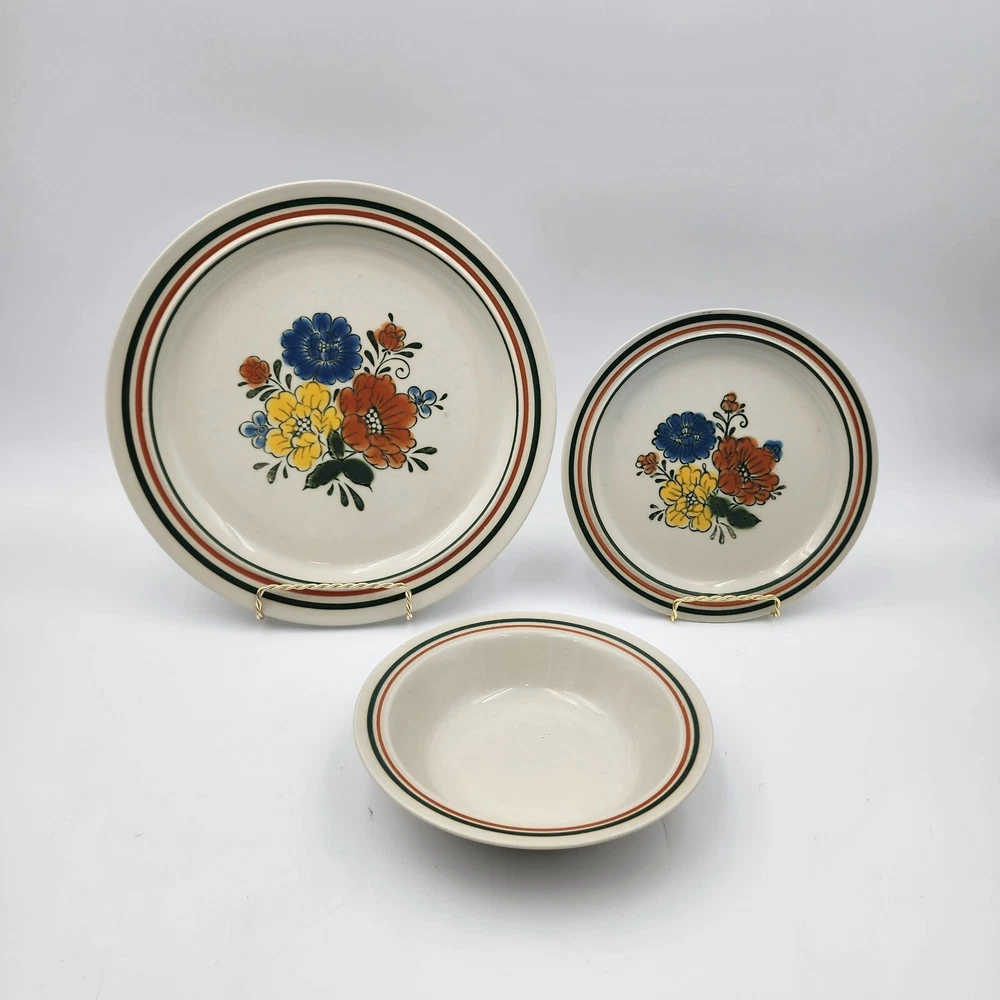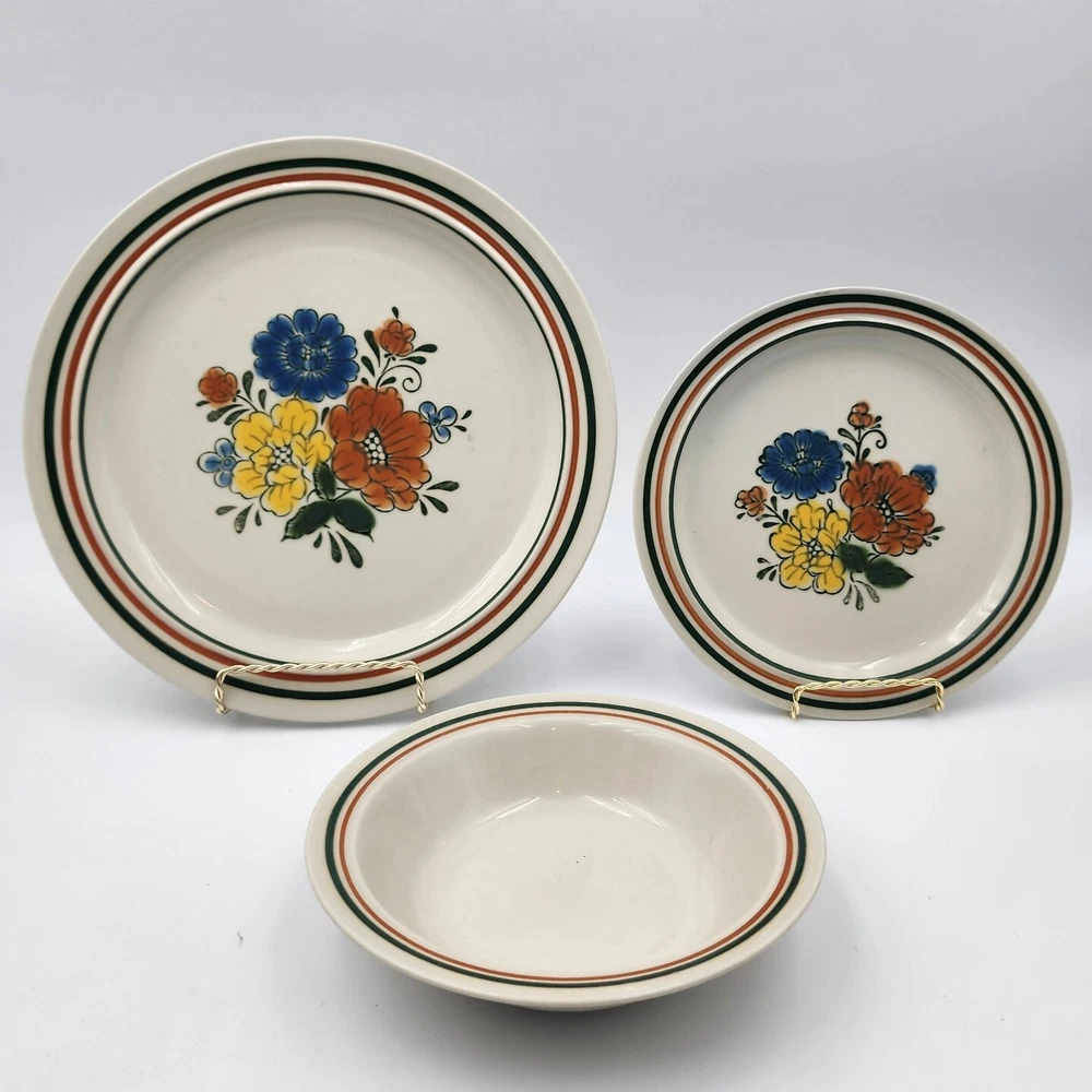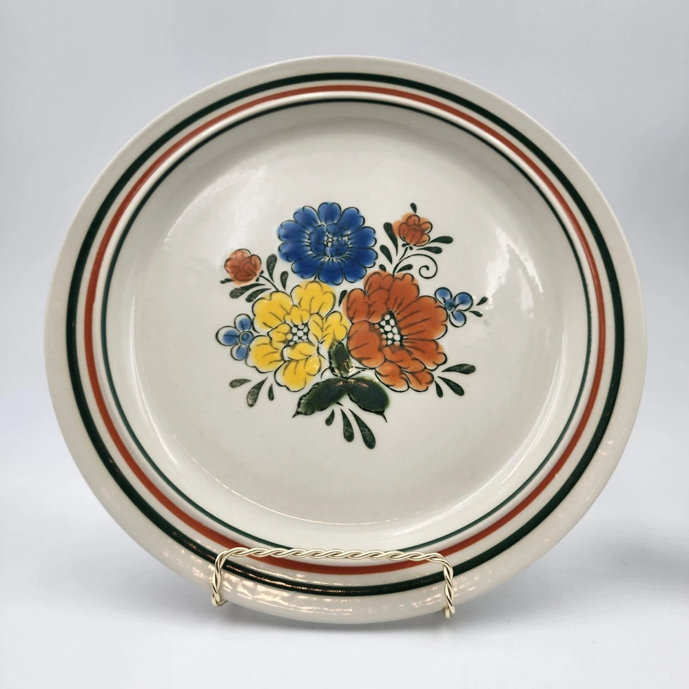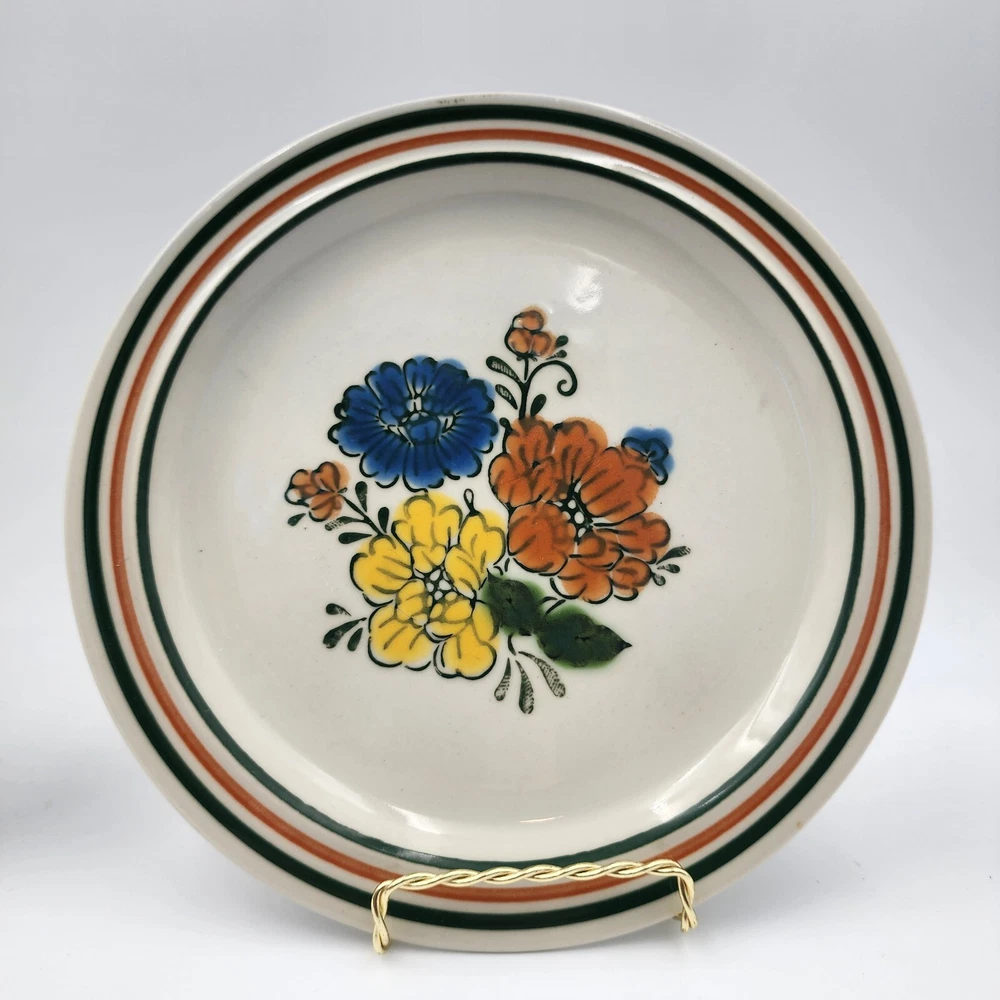 The Mioko Newcor Designer Collection 151 is a vintage set of dinner and salad plates and bowls. Made in Japan in the 1970s; these stoneware items are durable and in excellent condition. These pieces are microwave, oven, and dishwasher safe. The plates feature a hand painted mid-century design of colorful flowers. There are 3 selections for purchase: 6 dinner plates measuring 10.5" 7 salad plates measuring 7" 4 bowls measuring 7"