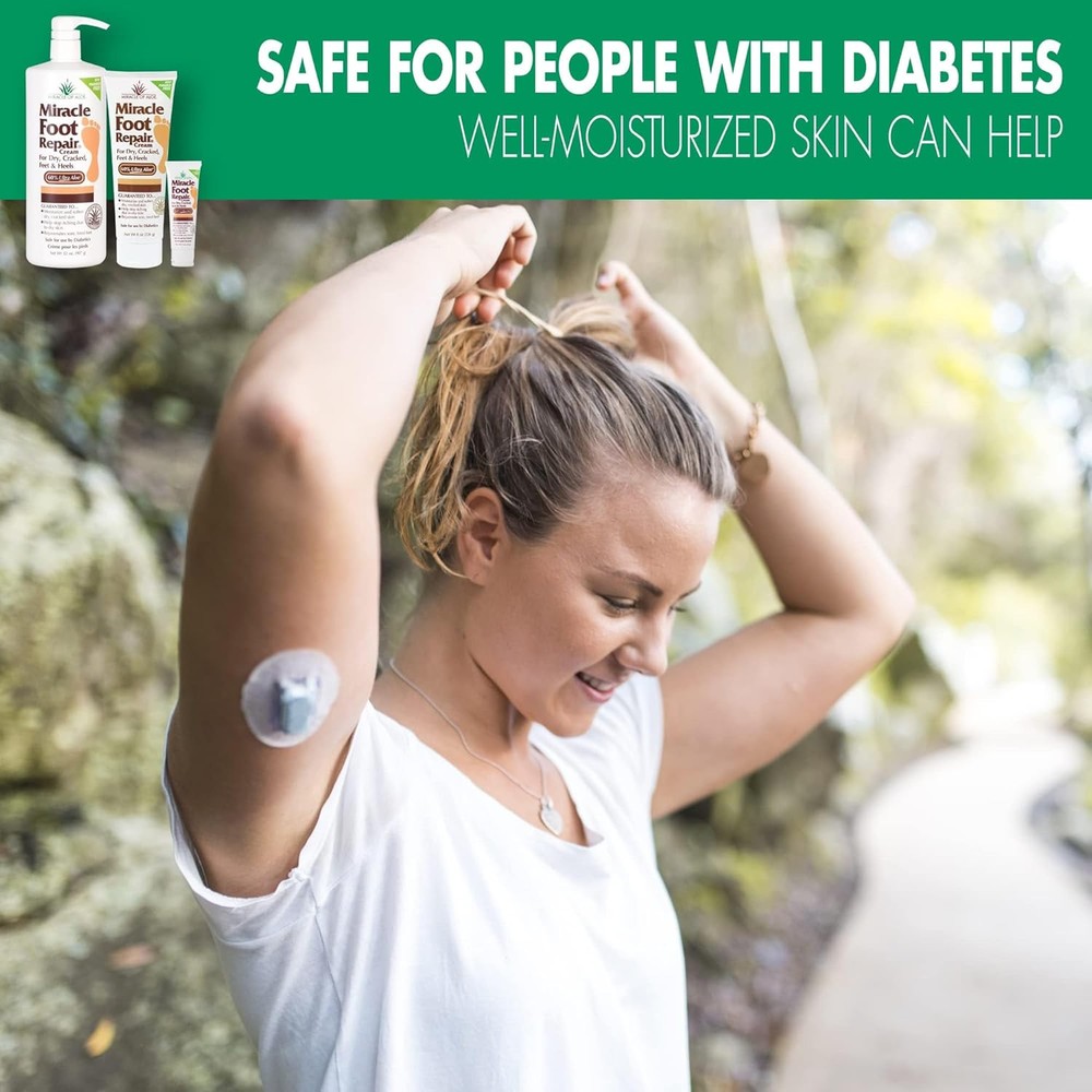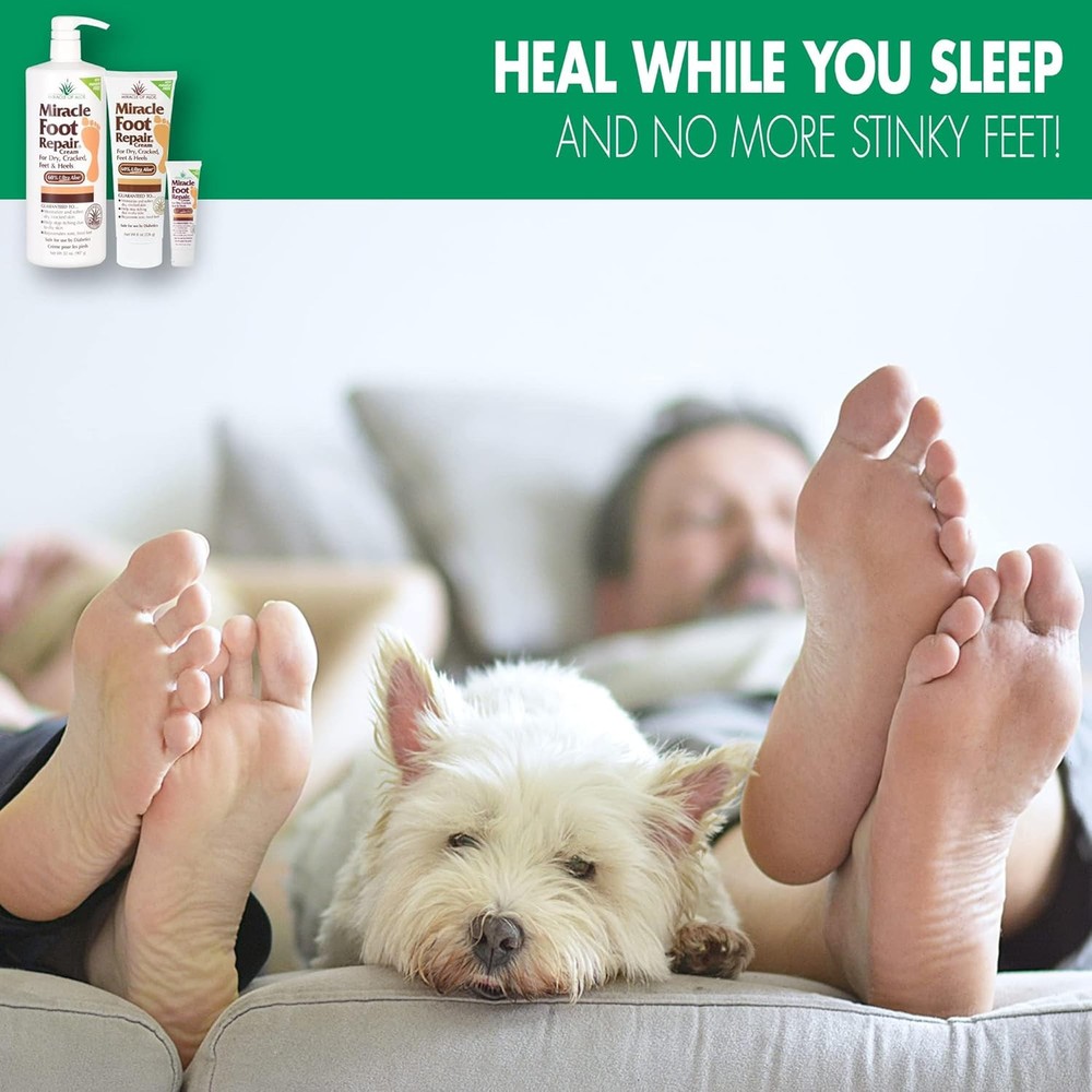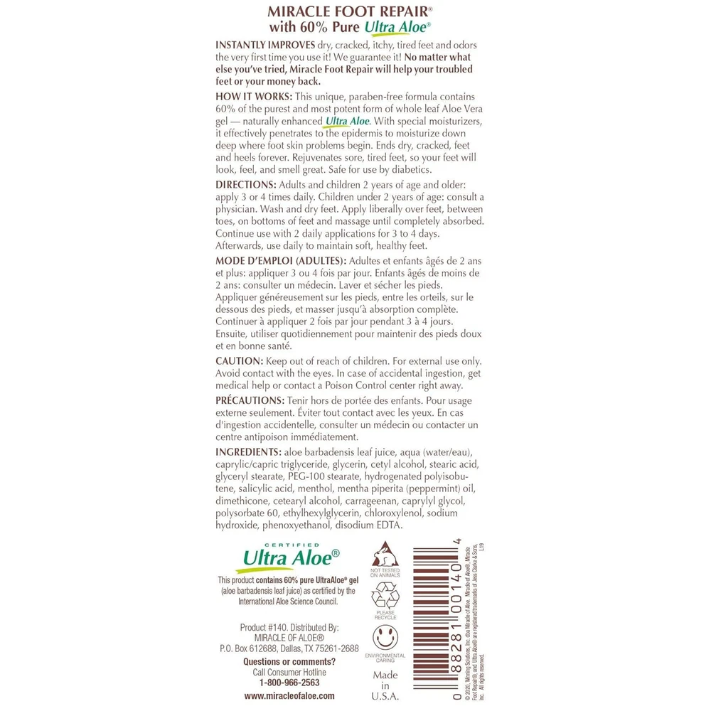 Miracle Foot Repair Cream (8 oz & 1 oz) Repairs Dry 9 Ounce (Pack of 1) Product Details Product Dimensions : 3.5 x 7.75 x 1.75 inches; 10.23 ounces Manufacturer : Miracle of Aloe Brand: Miracle of Aloe Item Volume: 8 Fluid Ounces Item dimensions L x W x H: 3.5 x 7.75 x 1.75 inches Age Range (Description): Teen & Adult Special Feature: Travel Size 60% PURE ULTRA ALOE FORMULA - Our Miracle Foot Repair Cream's 60% ultra aloe concentration enhances softening, even on the toughest calloused areas. SOOTHING FOOT REPAIR - Keep your feet feeling smooth, moisturized, and protected all day long as our cream heals and restores your feet's natural beauty. DIABETIC SAFE - Use our diabetic safe foot cream as part of your foot care lotion routine, prioritizing overall foot health. SAY GOODBYE TO CRACKS - No more painful cracks on your heels! Our cream will keep your feet smooth and soft, reducing the appearance of heel cracks. FAST-ACTING MOISTURIZATION - Our cream quickly penetrates to the epidermis of the skin, deep down where foot skin problems begin, to soothe and soften your feet.