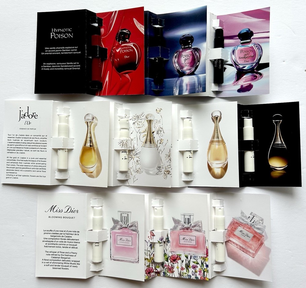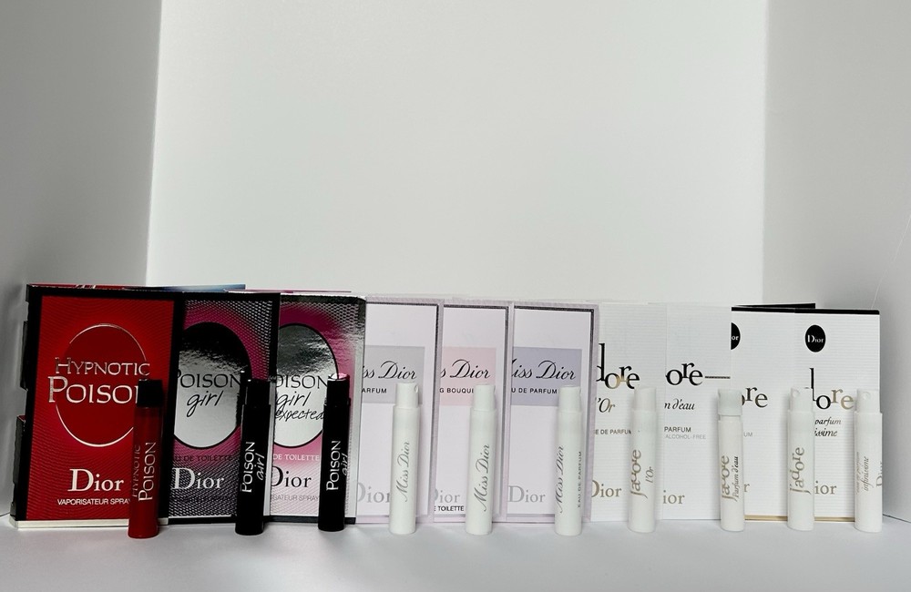 Miss Dior & J’adore 10pc Sample Set - Miss Dior Parfum 1ml - Miss Dior Blooming Bouquet EDT 1ml - Miss Dior EDP 1ml - Dior J’adore Parfum D’eau EDP 1ml - Dior J’adore EDP 1ml - Dior J’adore EDP Infinissime 1ml - Dior J’adore L’Or EDP 1ml - Dior Hypnotic Poison EDT 1ml - Dior Poison Girl EDT 1ml - Dior Poison Girl Unexpected EDT 1ml