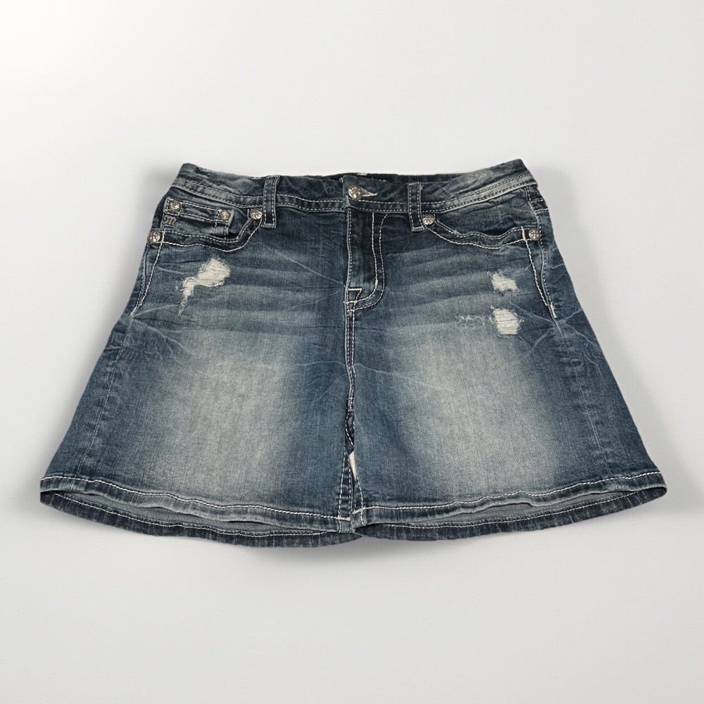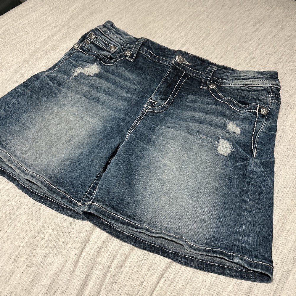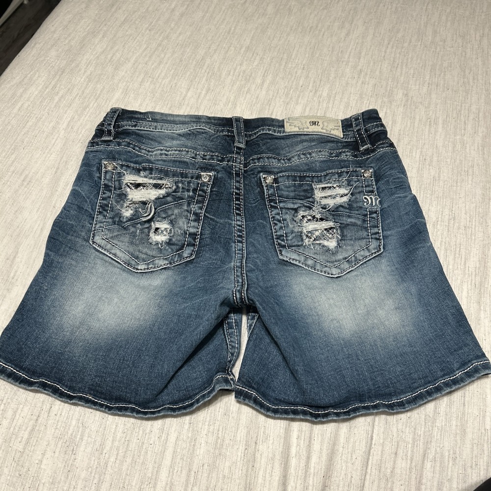 This is a pair of Miss Me mid-rise Bermuda jean shorts in a medium wash with flap pockets, size 31. The denim shorts feature studded accents and a regular fit with a 31-inch waist. Designed for women, these shorts have a 5-inch inseam and a Western-inspired theme, perfect for fans of designer Western wear. Ideal for a casual American Rodeo or Cowboy Cowgirl look, these shorts offer both style and functionality with their pockets and classic denim fabric.